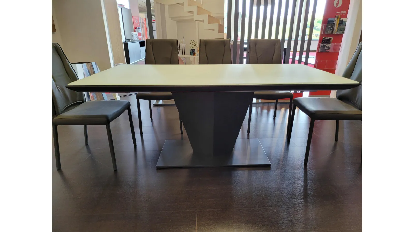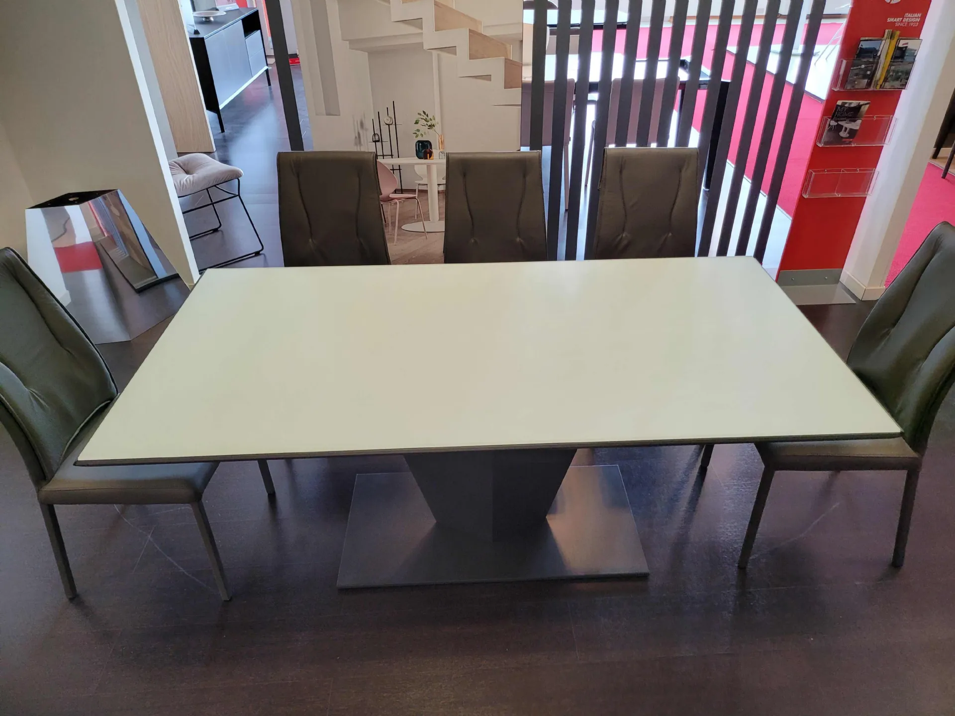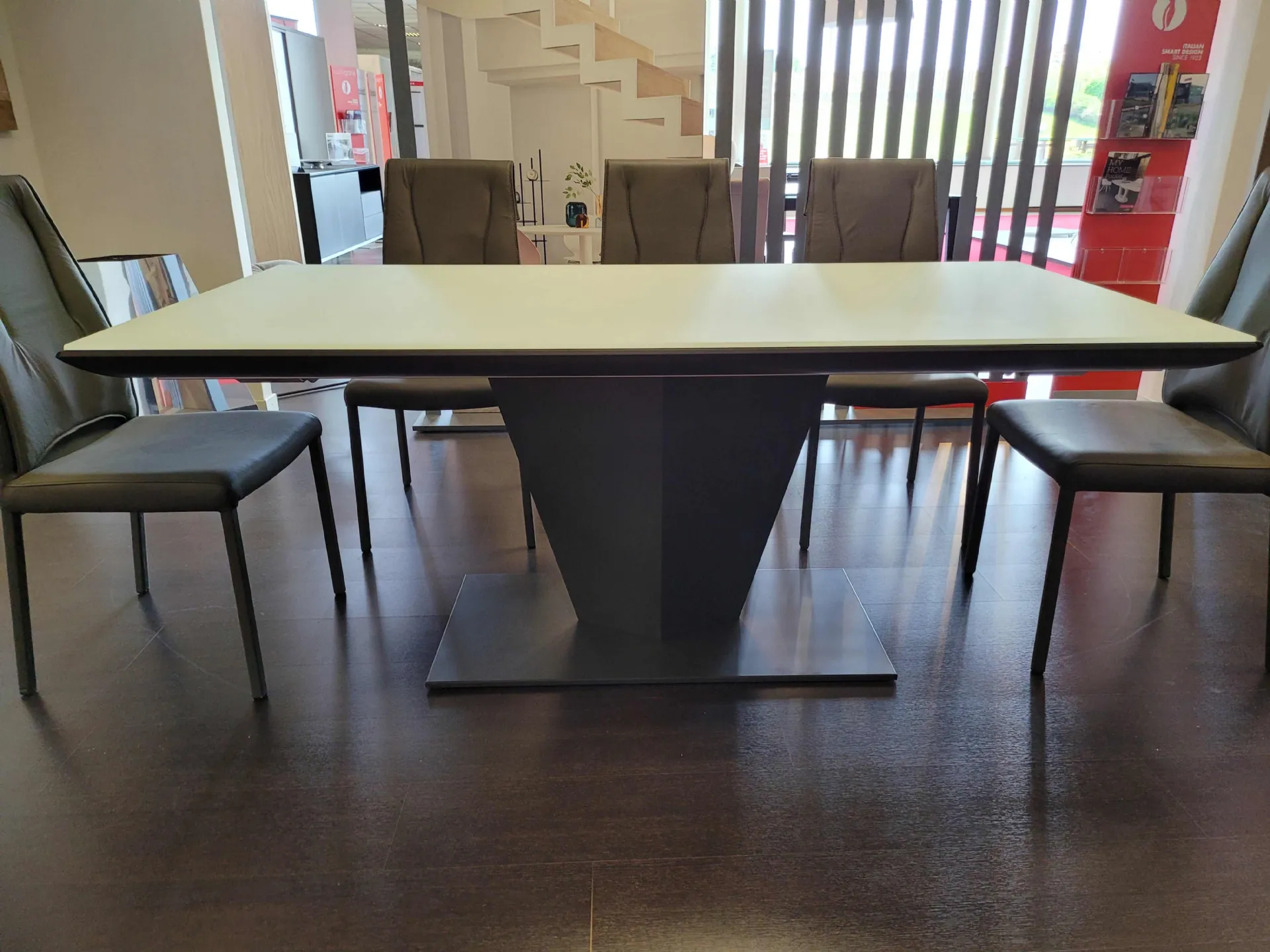Diamante è un tavolo innovativo dai contenuti originali. Quasi un pezzo scultura che diventa protagonista del living contemporaneo. Linee sfaccettate donano un carattere futurista e di grande personalità distintiva. La struttura è in metallo VERNICIATO GRAFITE mentre il piano è in cristallo anti impronta di prima qualità COLORE BIANCO.