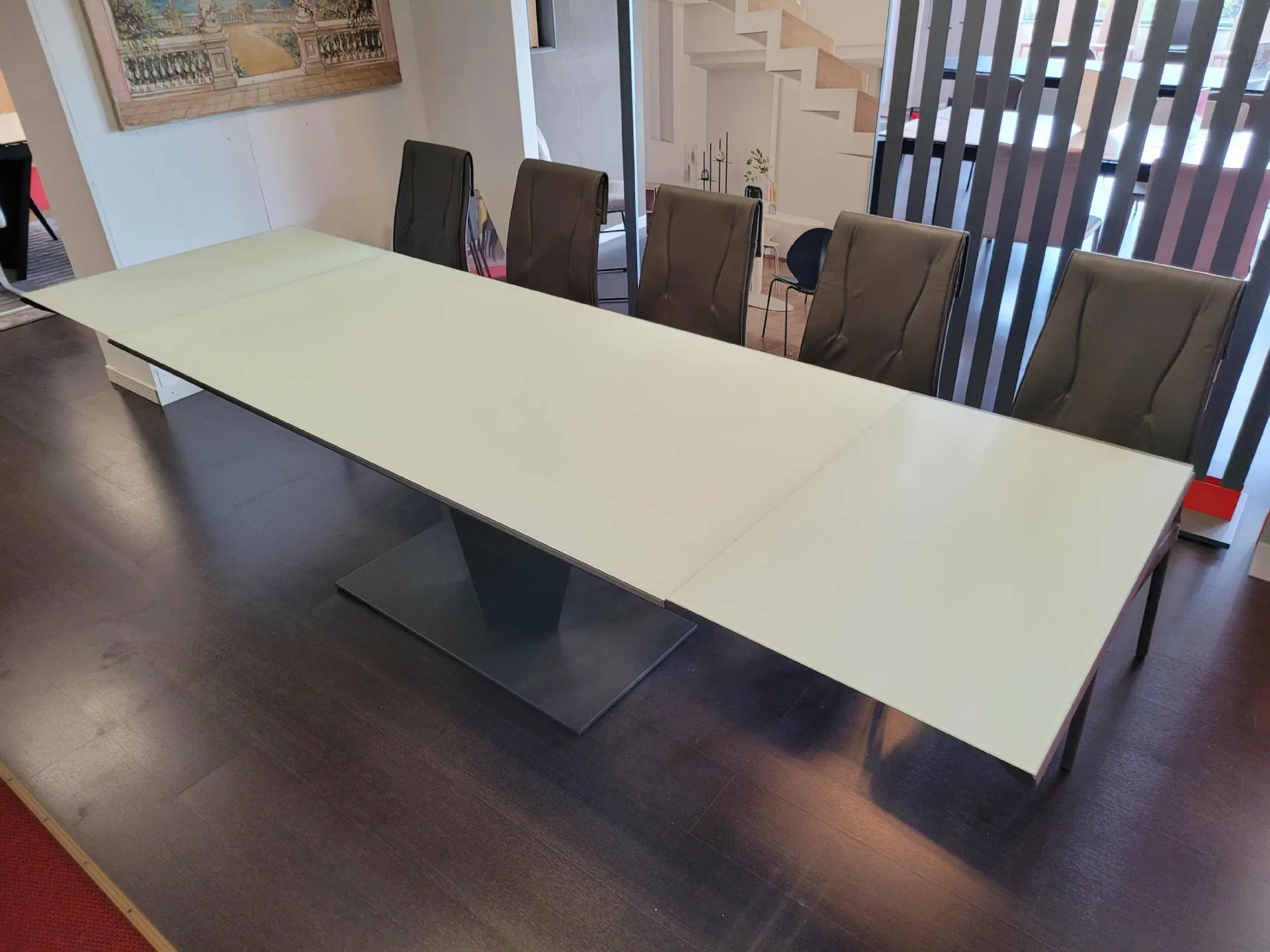E' un tavolo comodo che da chiuso misura cm L.180xP.90xH.75 mentre da aperto misura cm L.290xP.90 e può ospitare fino a 10 posti.