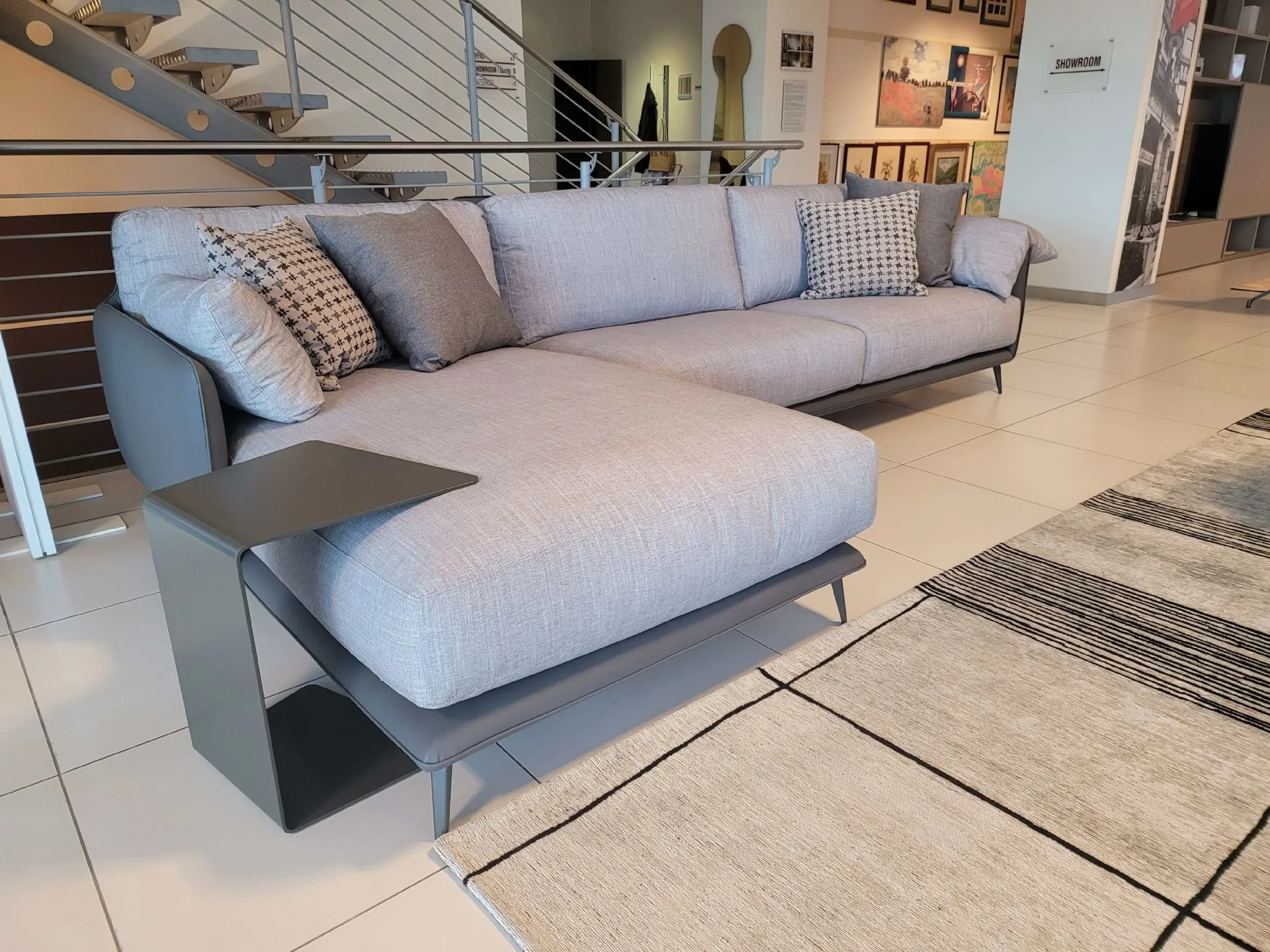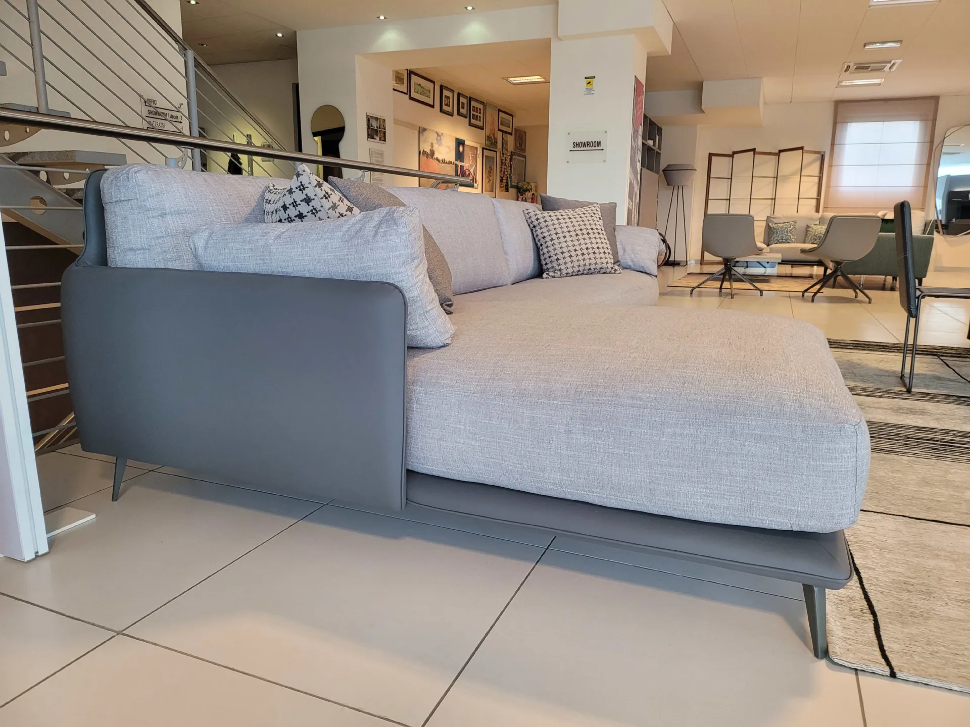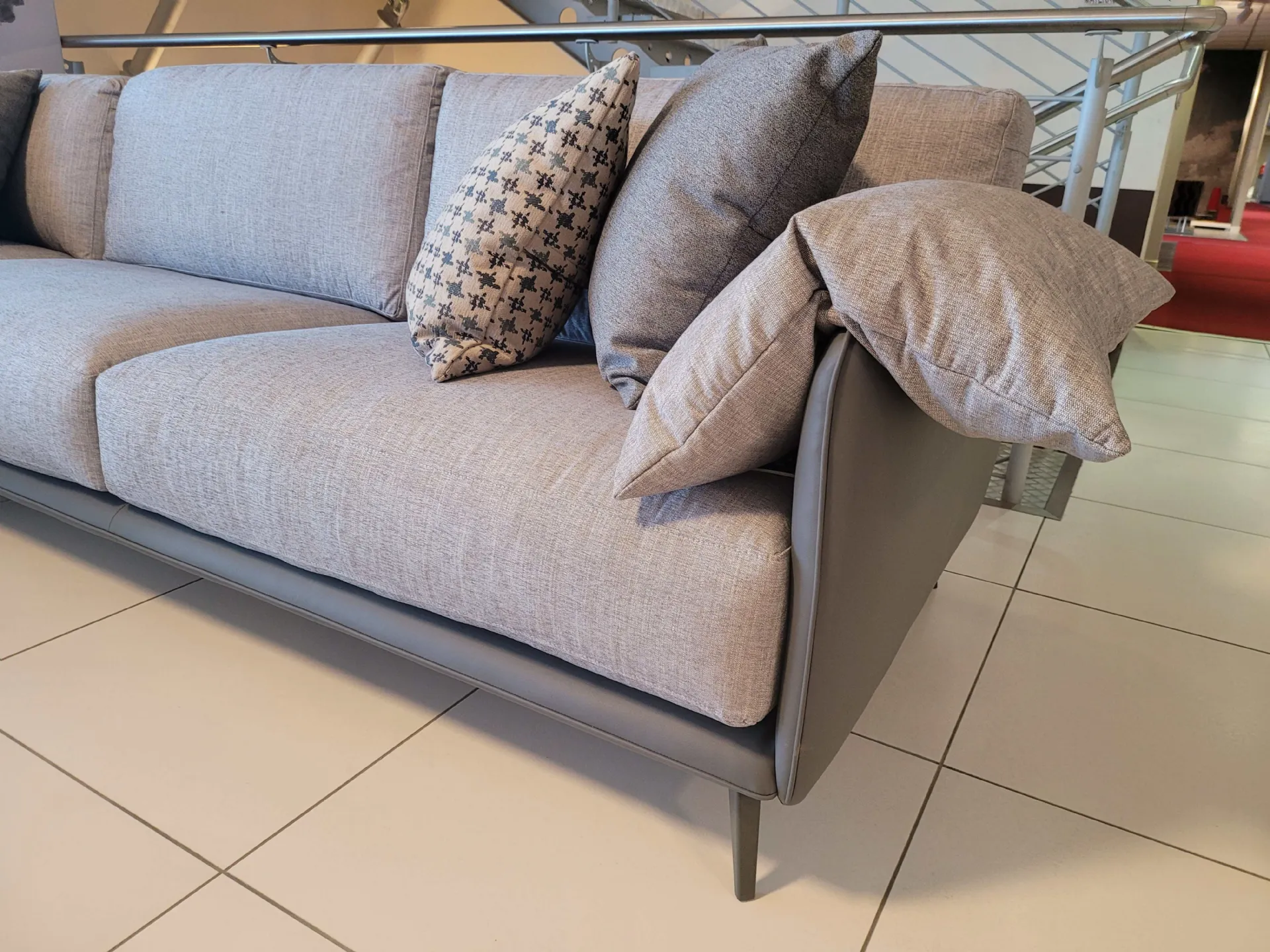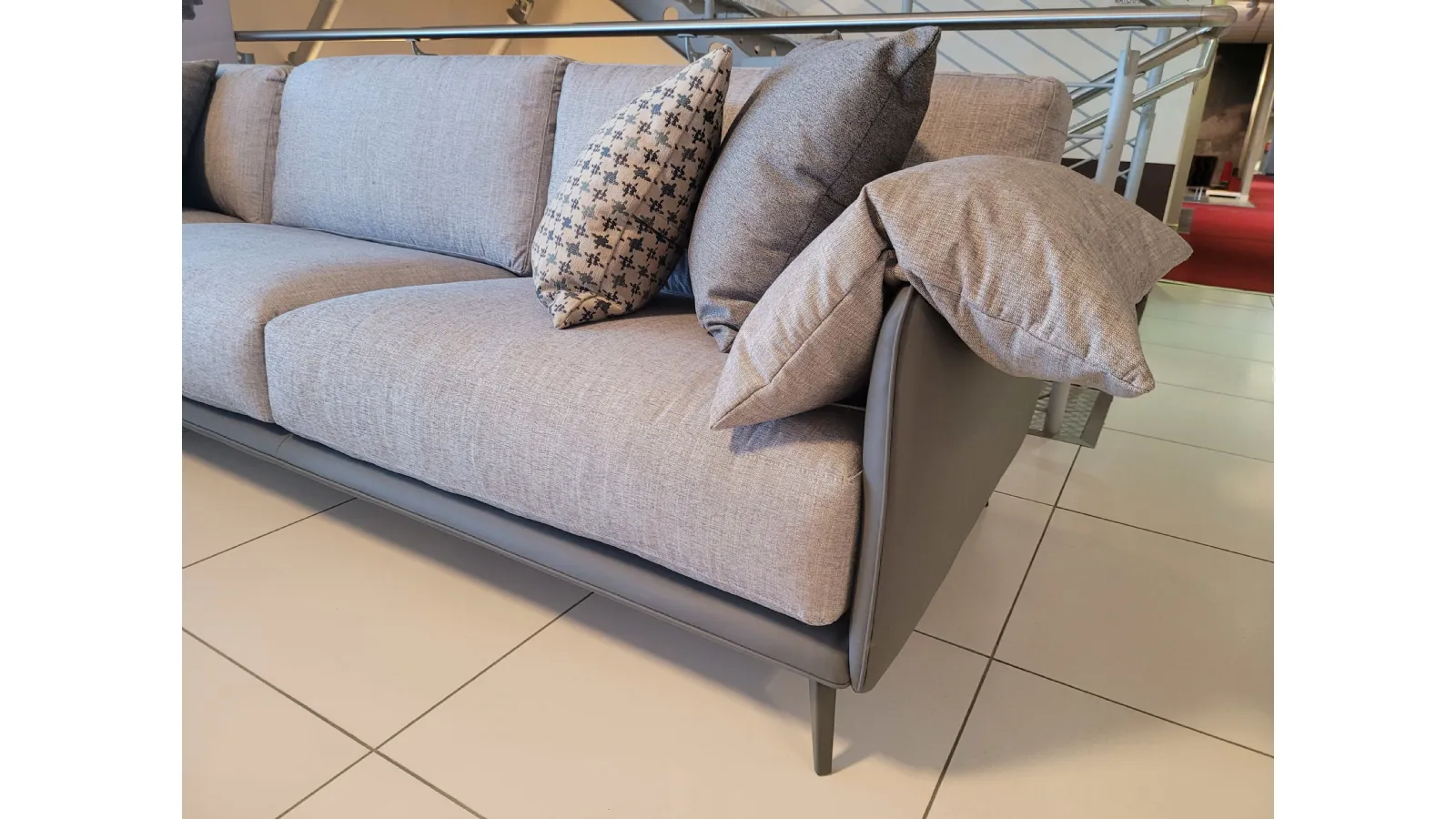 Il tessuto di rivestimento è pregiato, antimacchia ed idrorepellente di colore grigio chiaro mentre la scocca esterna è in ecopelle colore grigio.