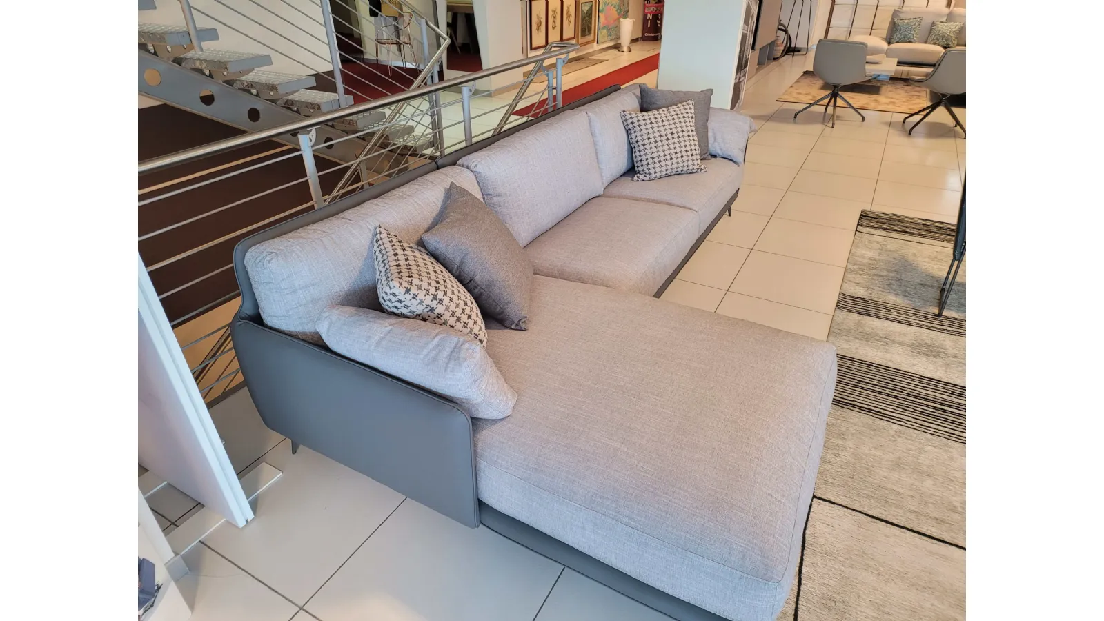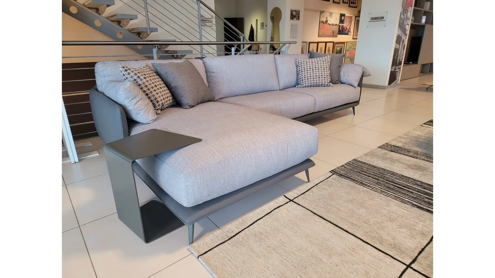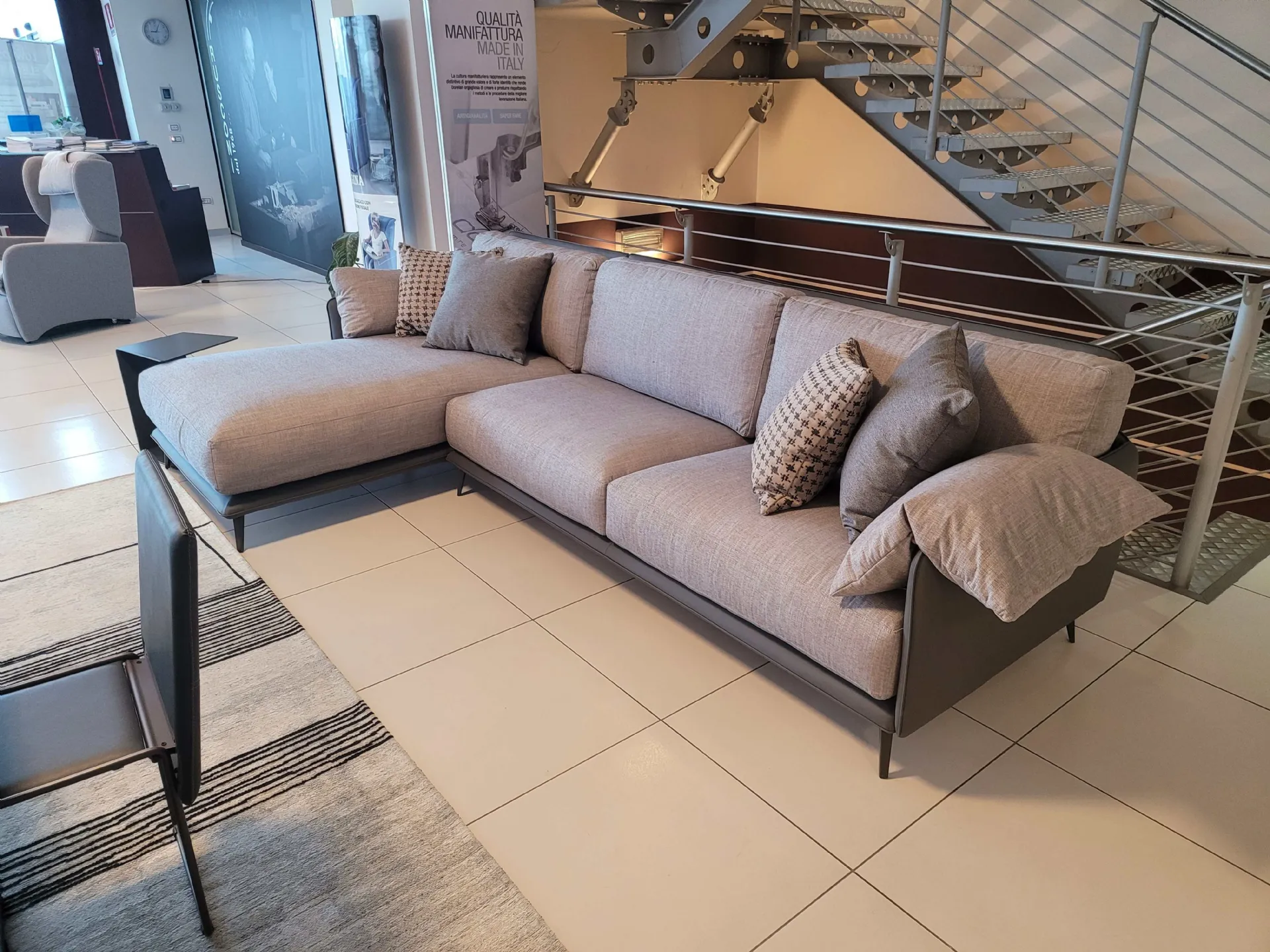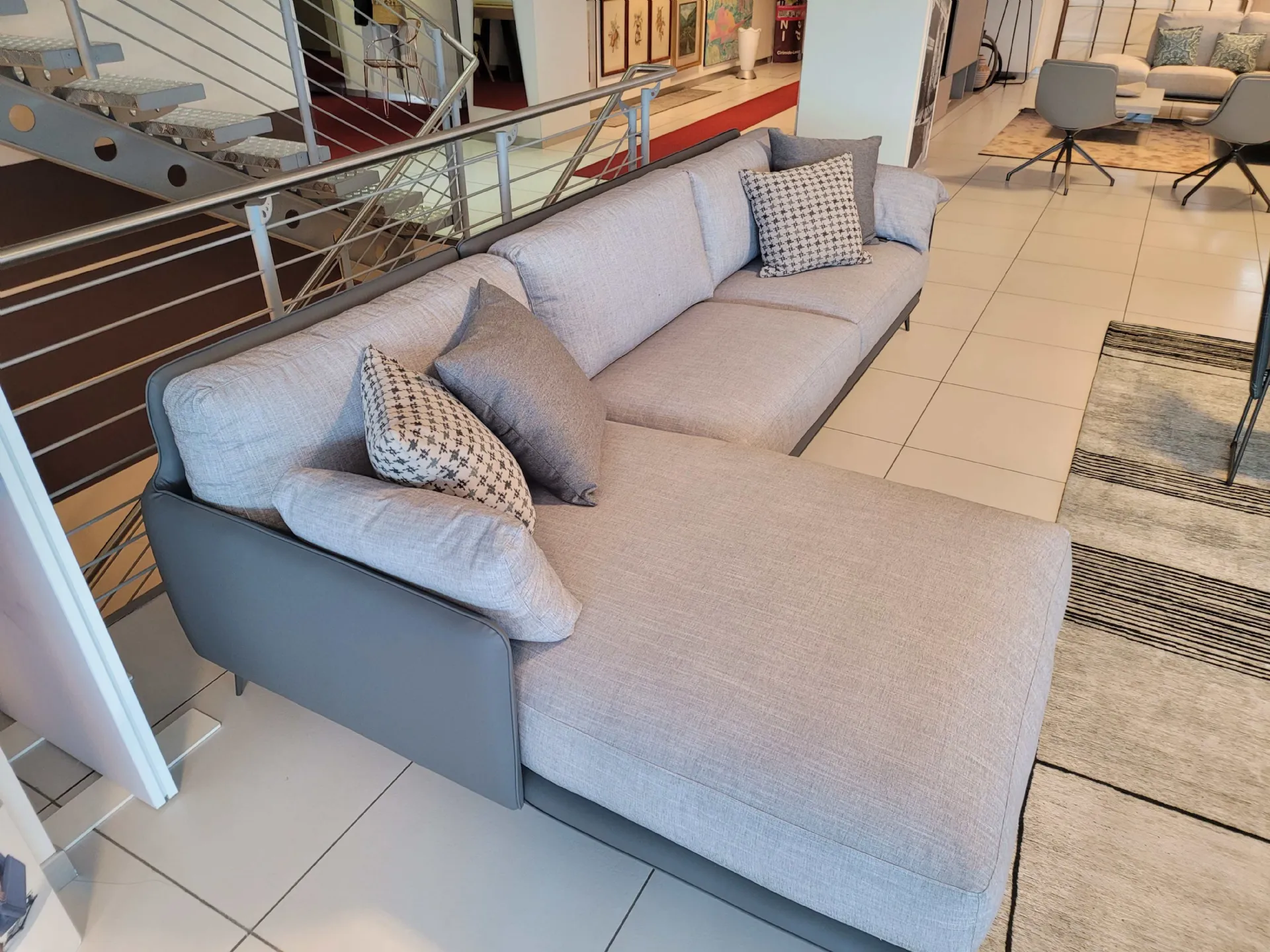 Il tessuto di rivestimento è pregiato, antimacchia ed idrorepellente di colore grigio chiaro mentre la scocca esterna è in ecopelle colore grigio.