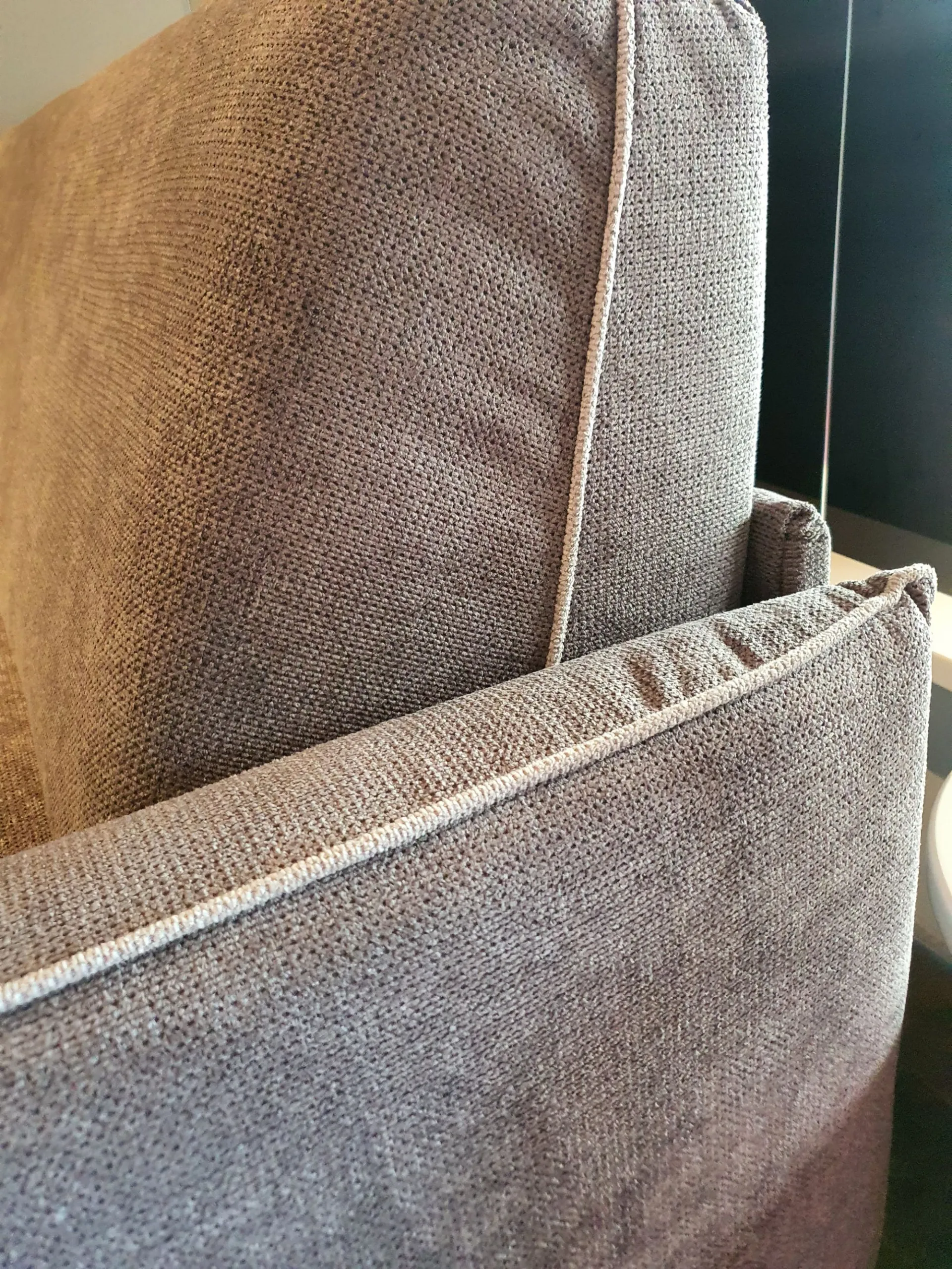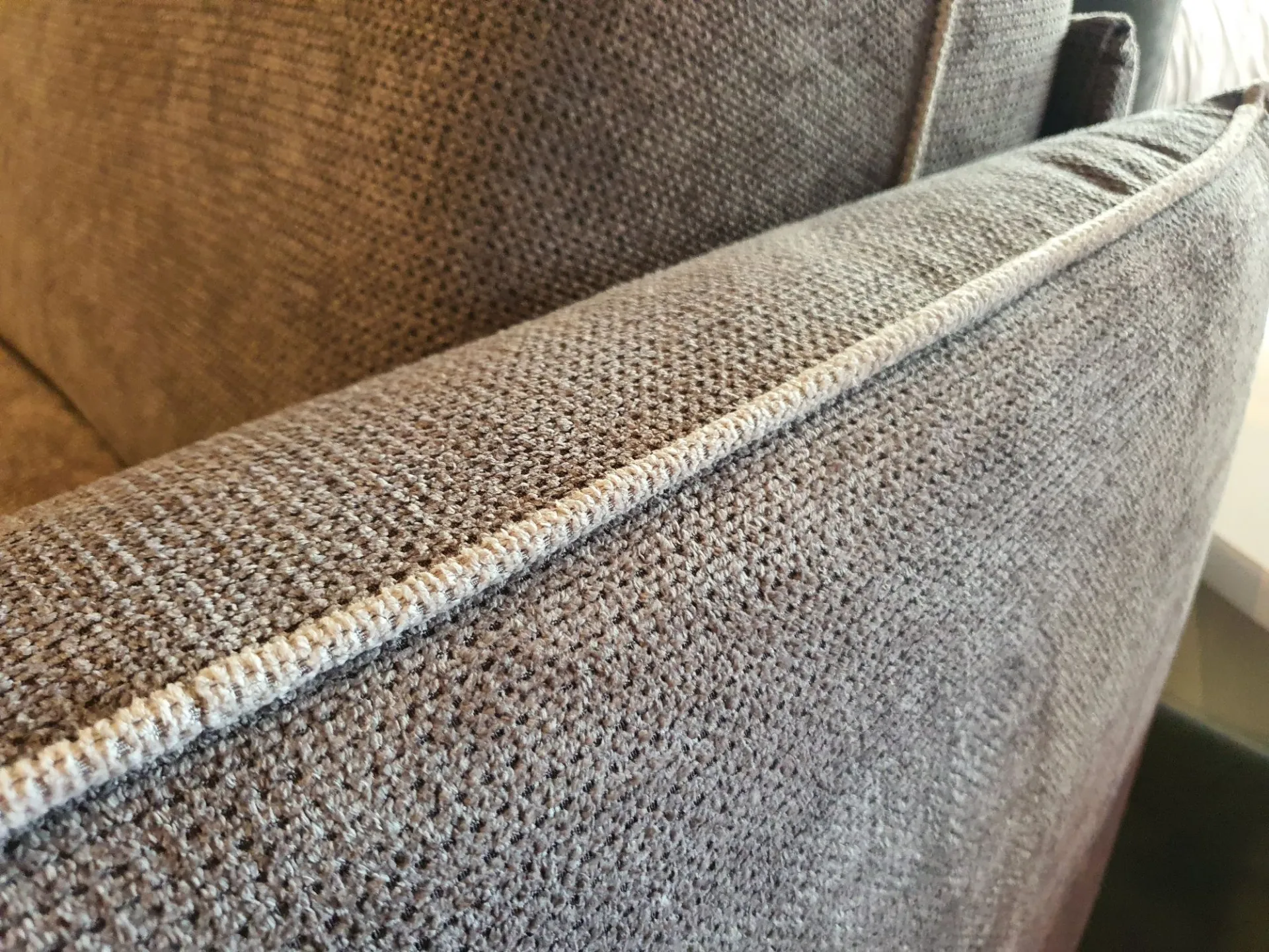 Il rivestimento in tessuto è completamente sfoderabile di colore grigio con filetto a contrasto bianco lungo tutto il perimetro del divano.
