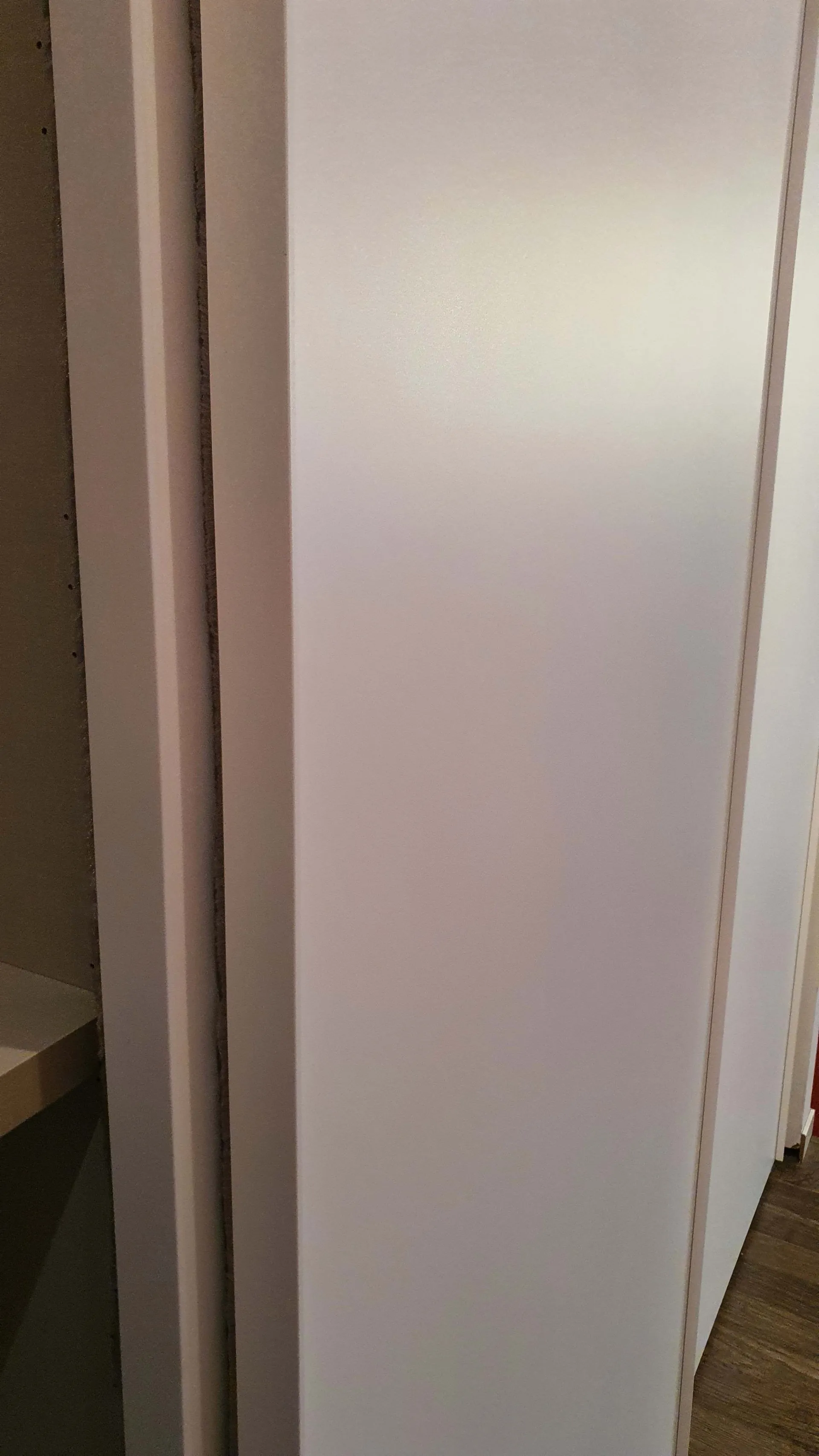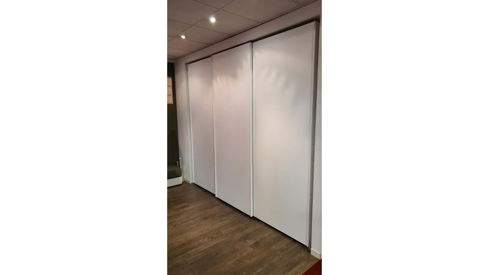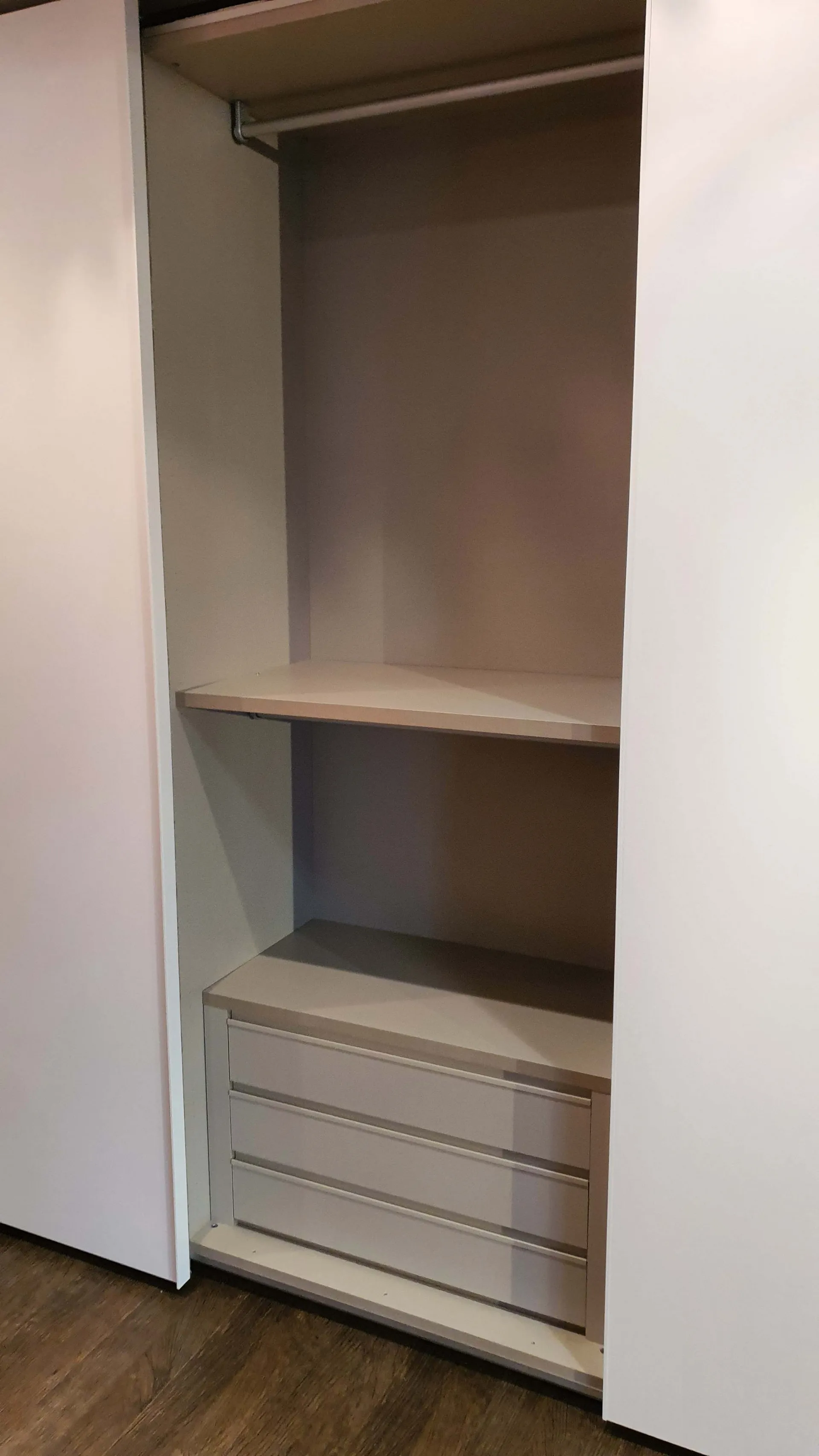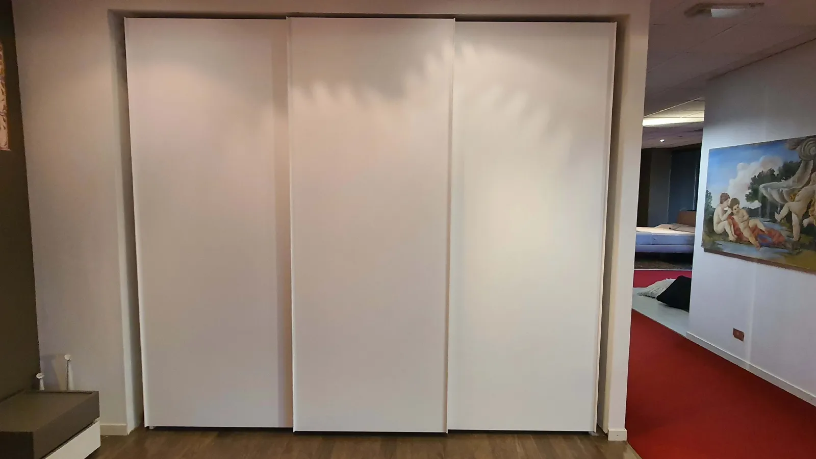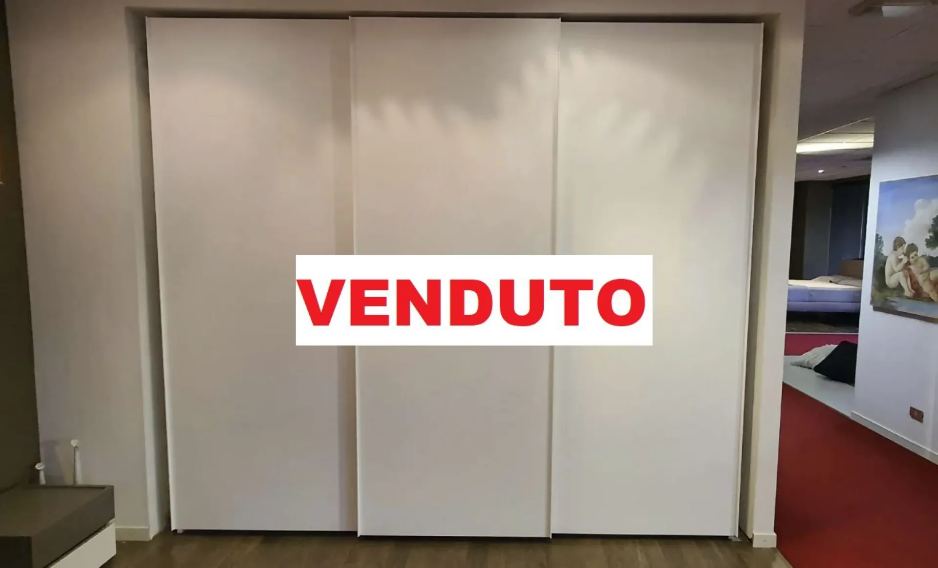 Armadio scorrevole a tre ante mod.Domino Express in finitura LACCATO BIANCO OPACO puro 124, maniglia profilo laccato opaco bianco puro 124, struttura interna finitura setatex, completo di cassettiera interna a 3 cassetti, ingombro totale di cm. L.290,5x258h.x67prof.