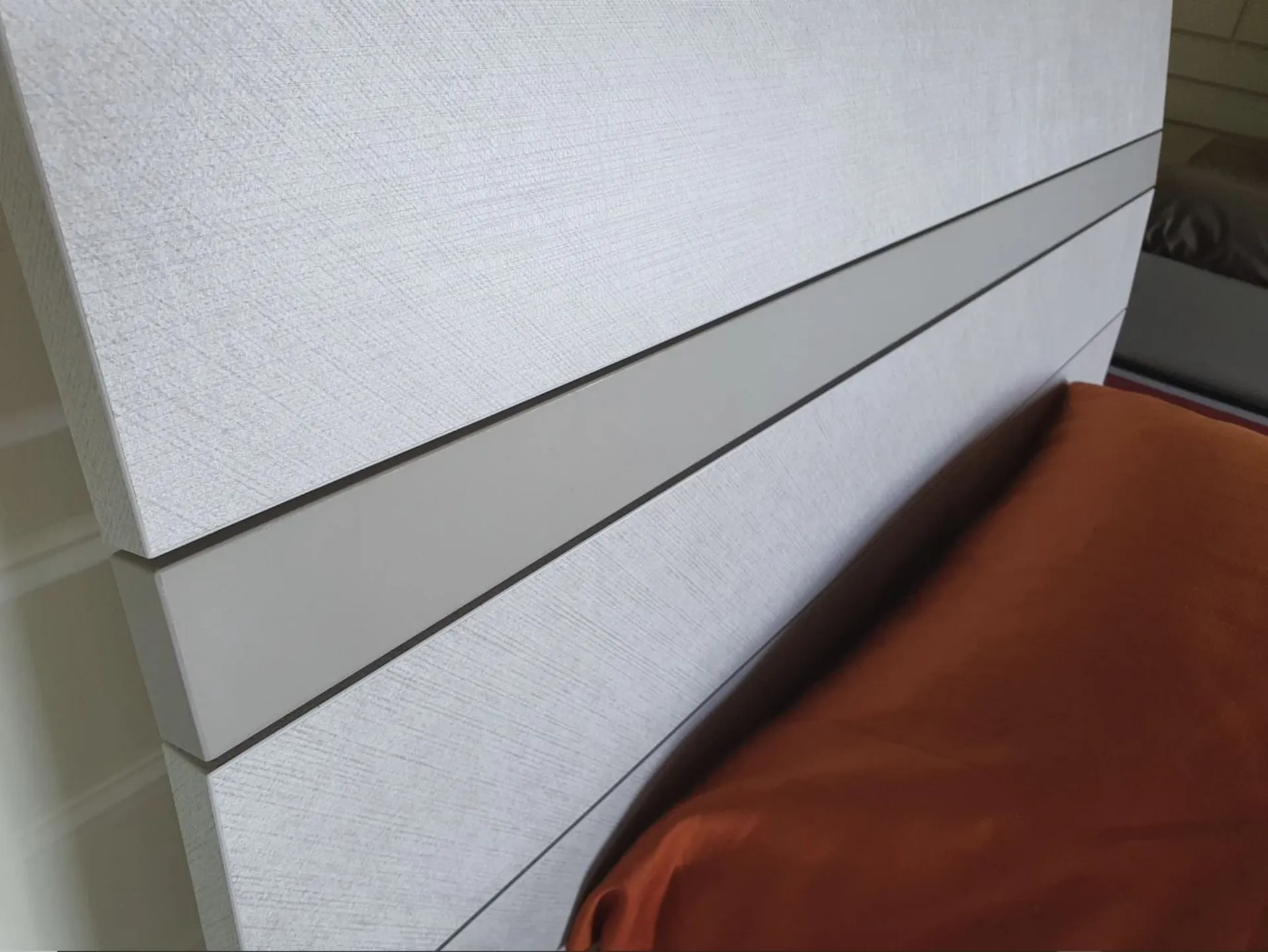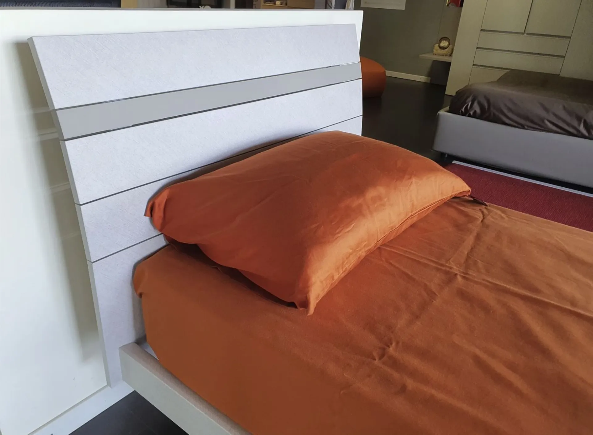 Finitura in materico canvas con fascia testiera in materico arena, piedi cilindrici.
