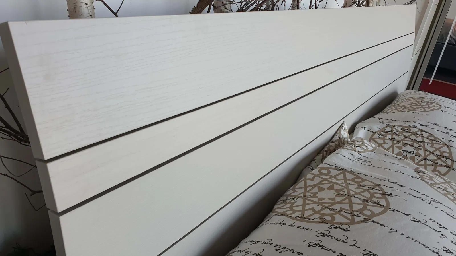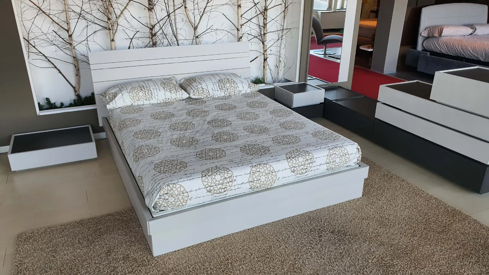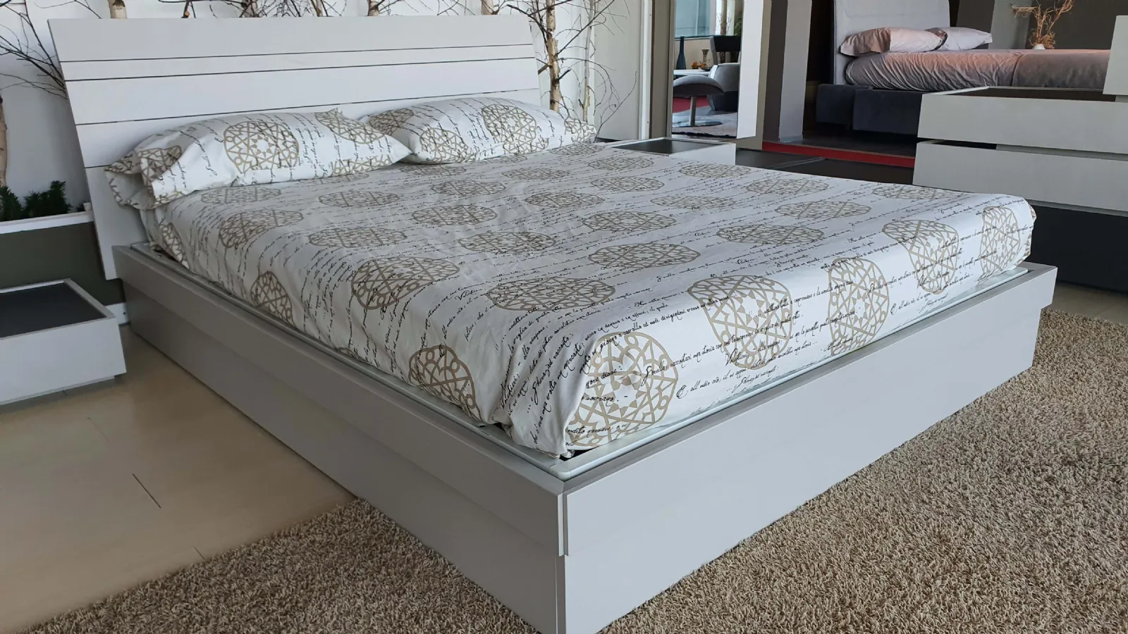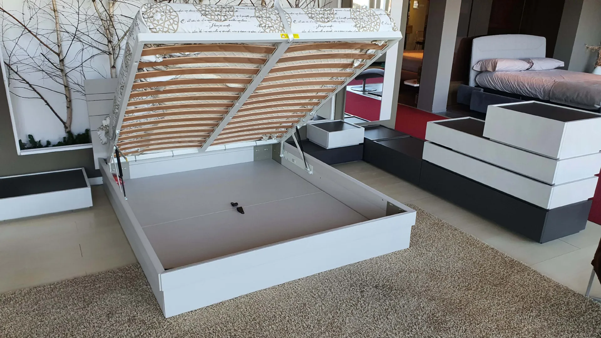 Letto matrimoniale con contenitore mod.JOKER con rete a doghe sollevabile di misura cm.160x200 in finitura materico poro aperto madreperla e con fascia sempre in finitura materico poro aperto colore madreperla. Il letto è facilmente abbinabile a qualsiasi stile di arredamento già presente nella stanza.