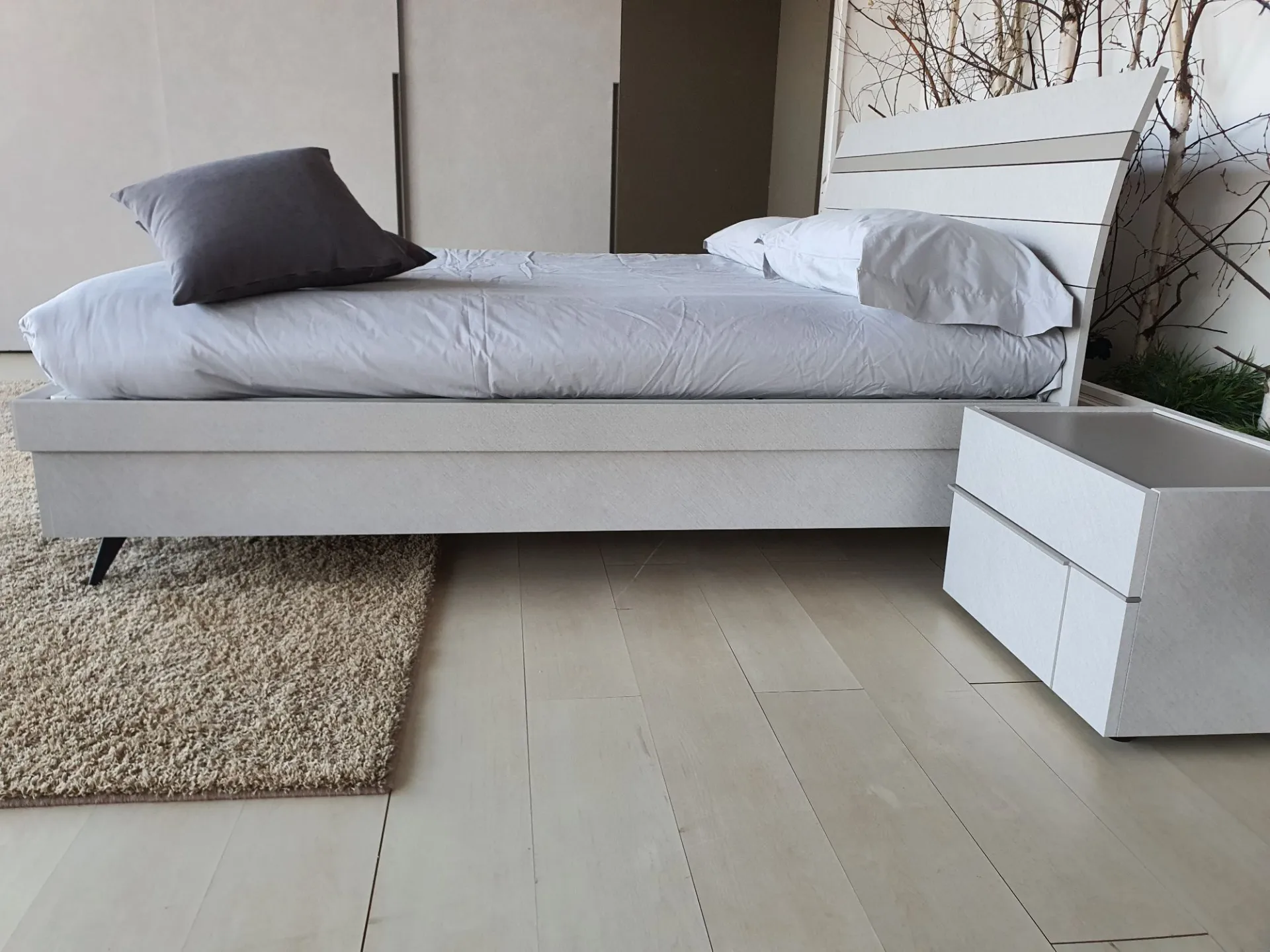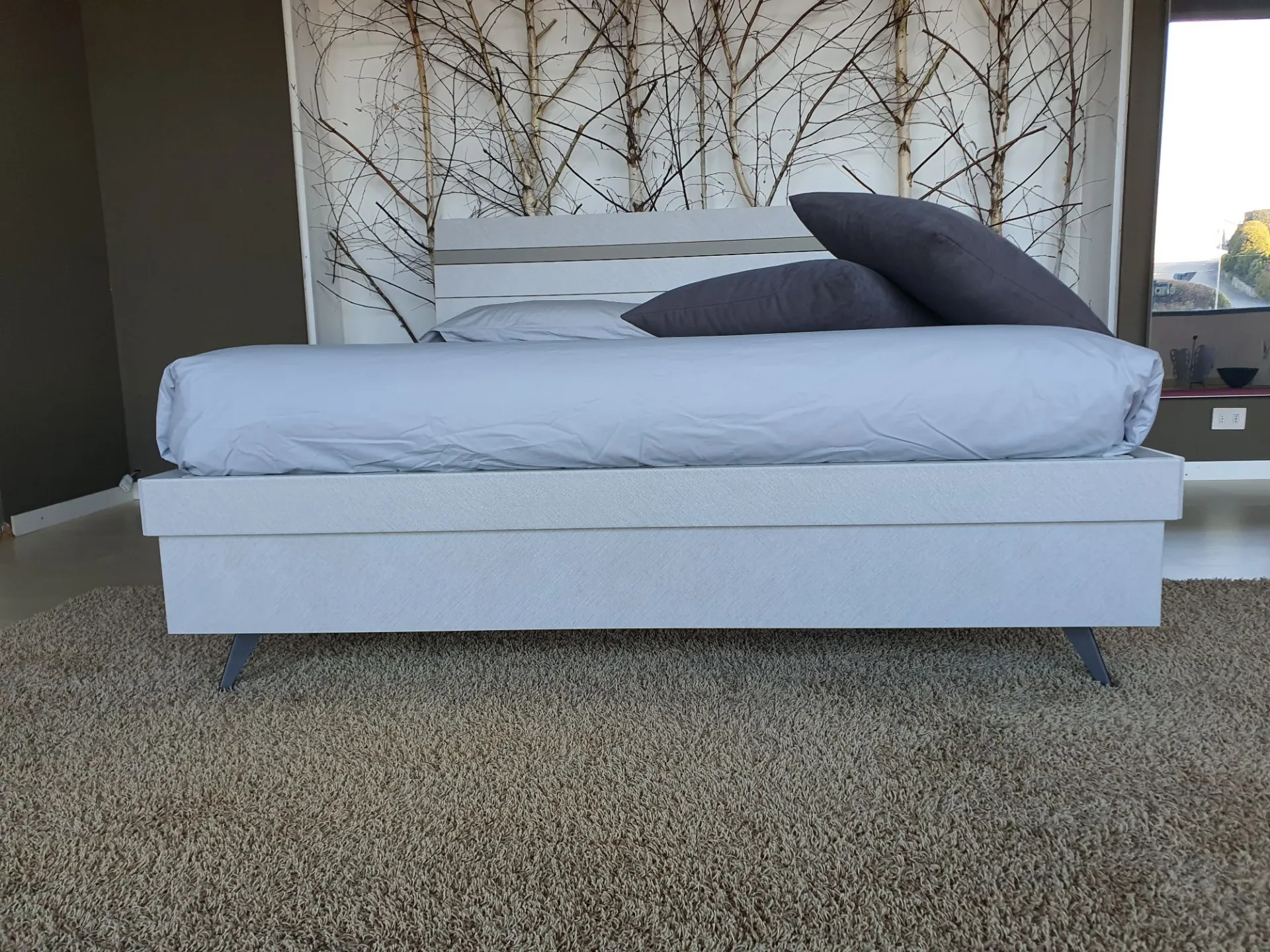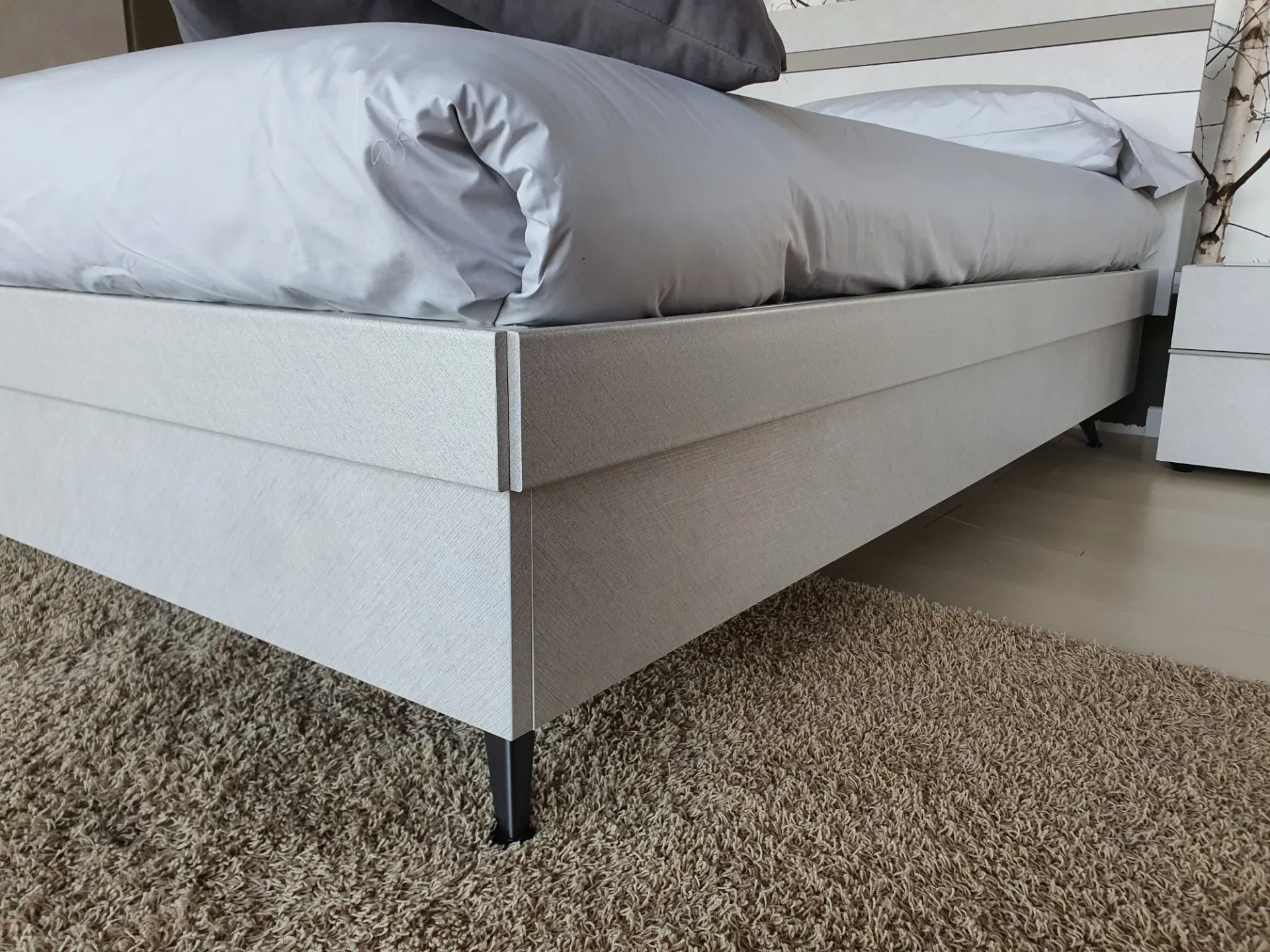Il letto è sollevato da terra grazie ai piedini in metallo color antracite che permettono di pulire comodamente sotto al letto
