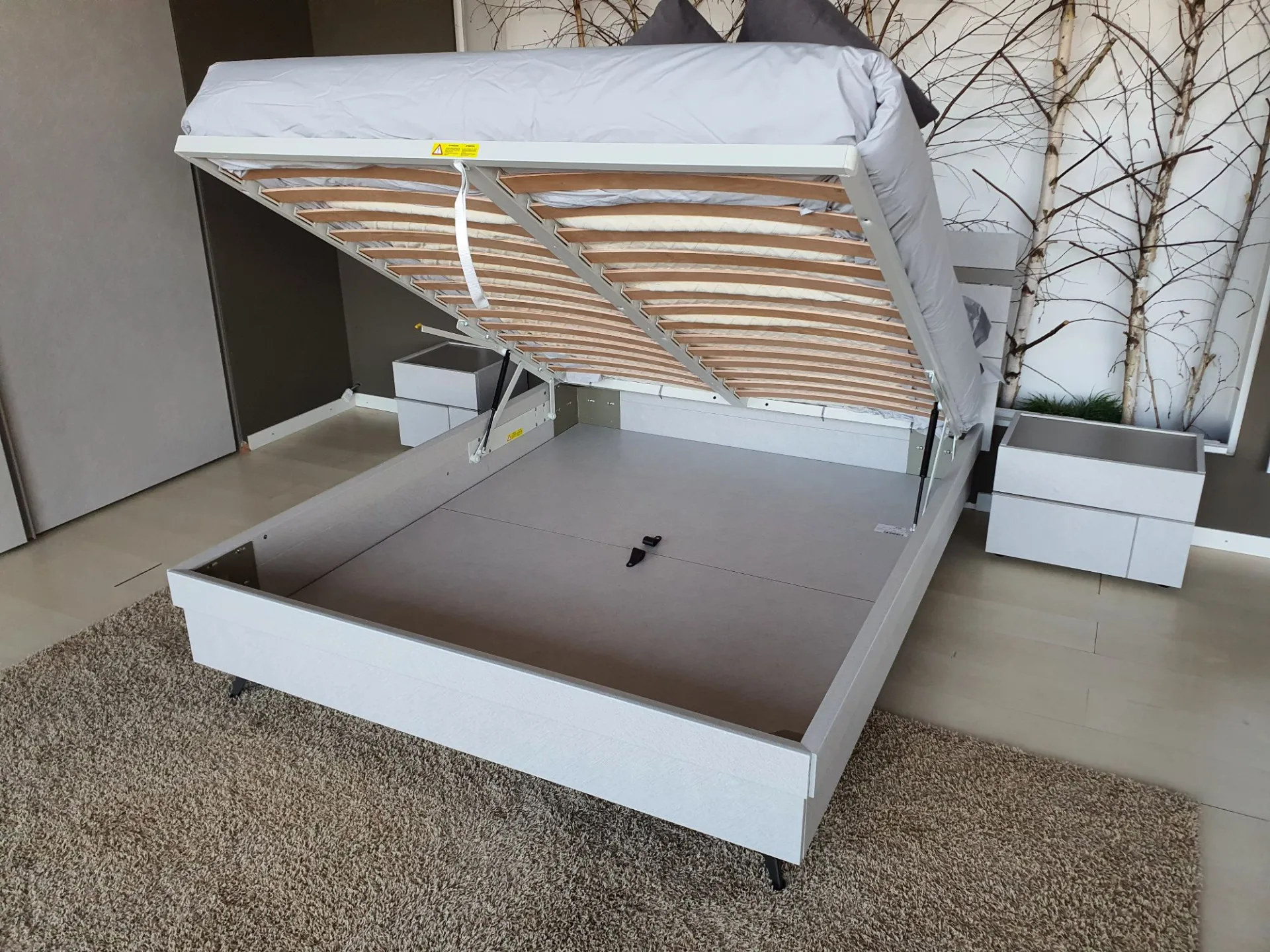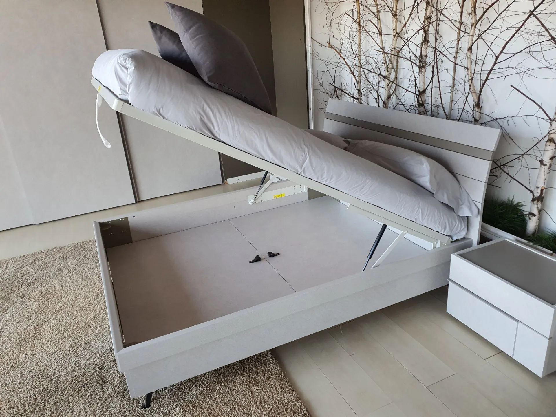 Letto matrimoniale con contenitore mod.JOKER con rete a doghe sollevabile di misura cm.160x200 in finitura CANVAS e con fascia in finitura materico opaco ARENA.