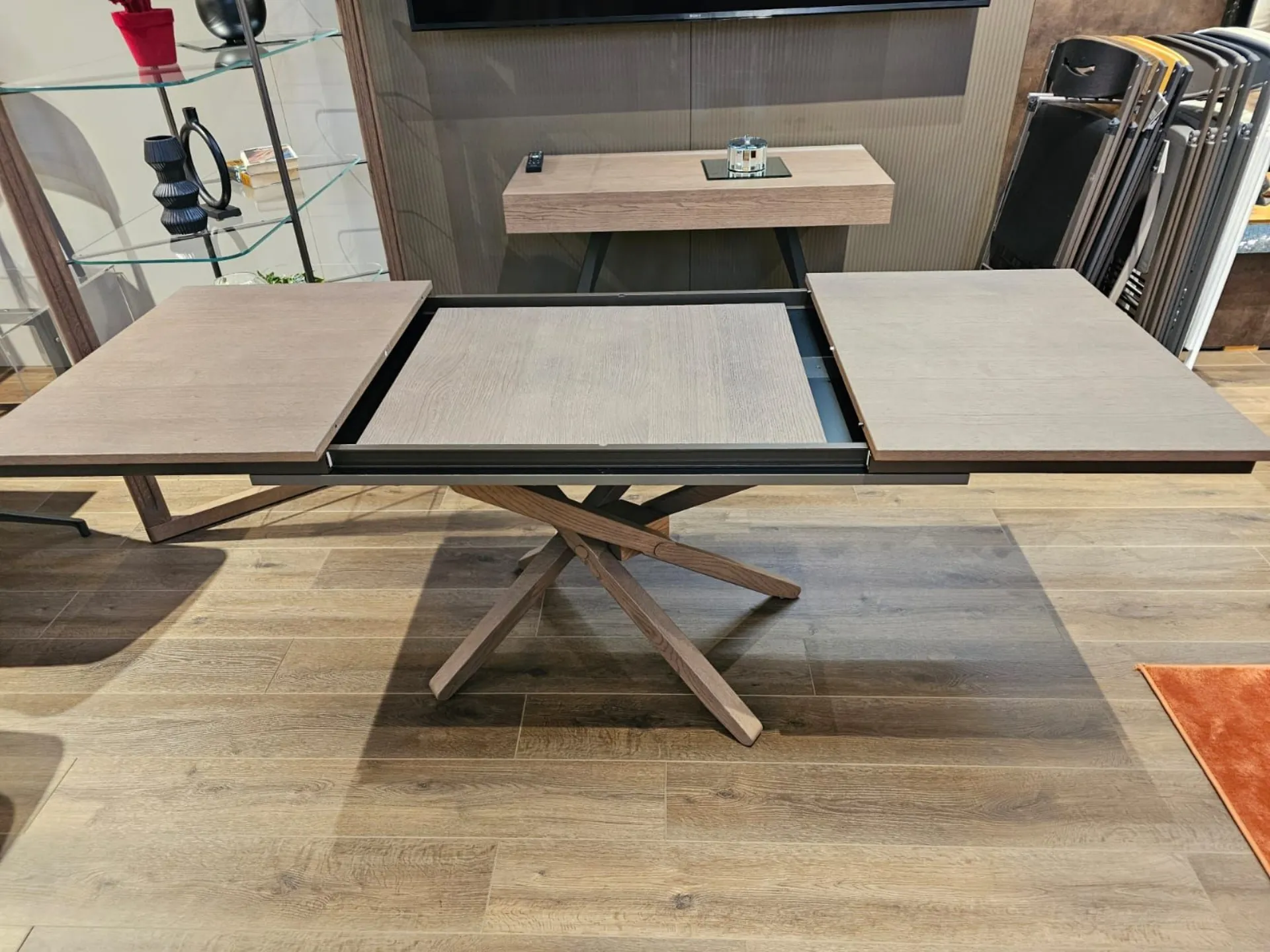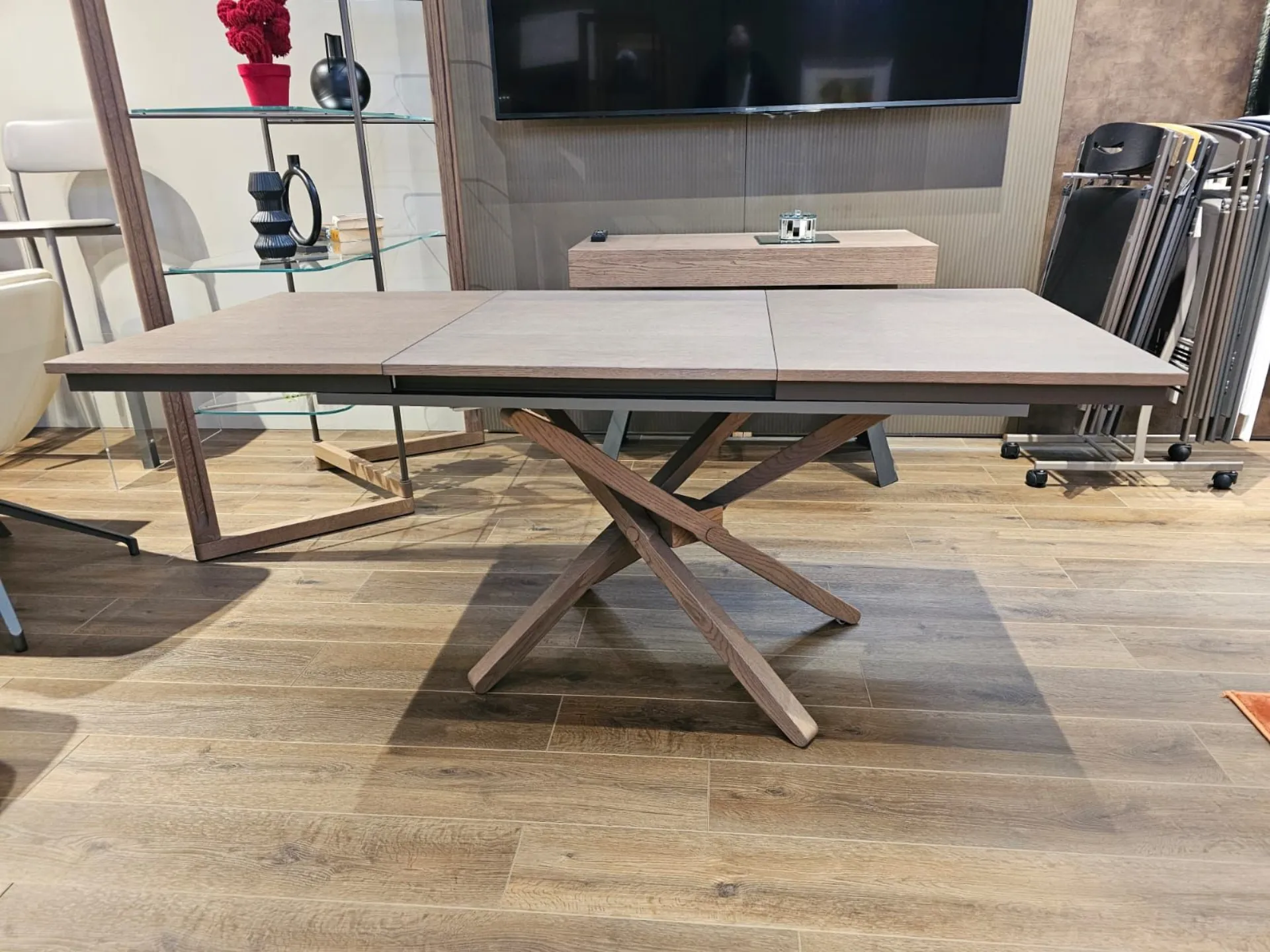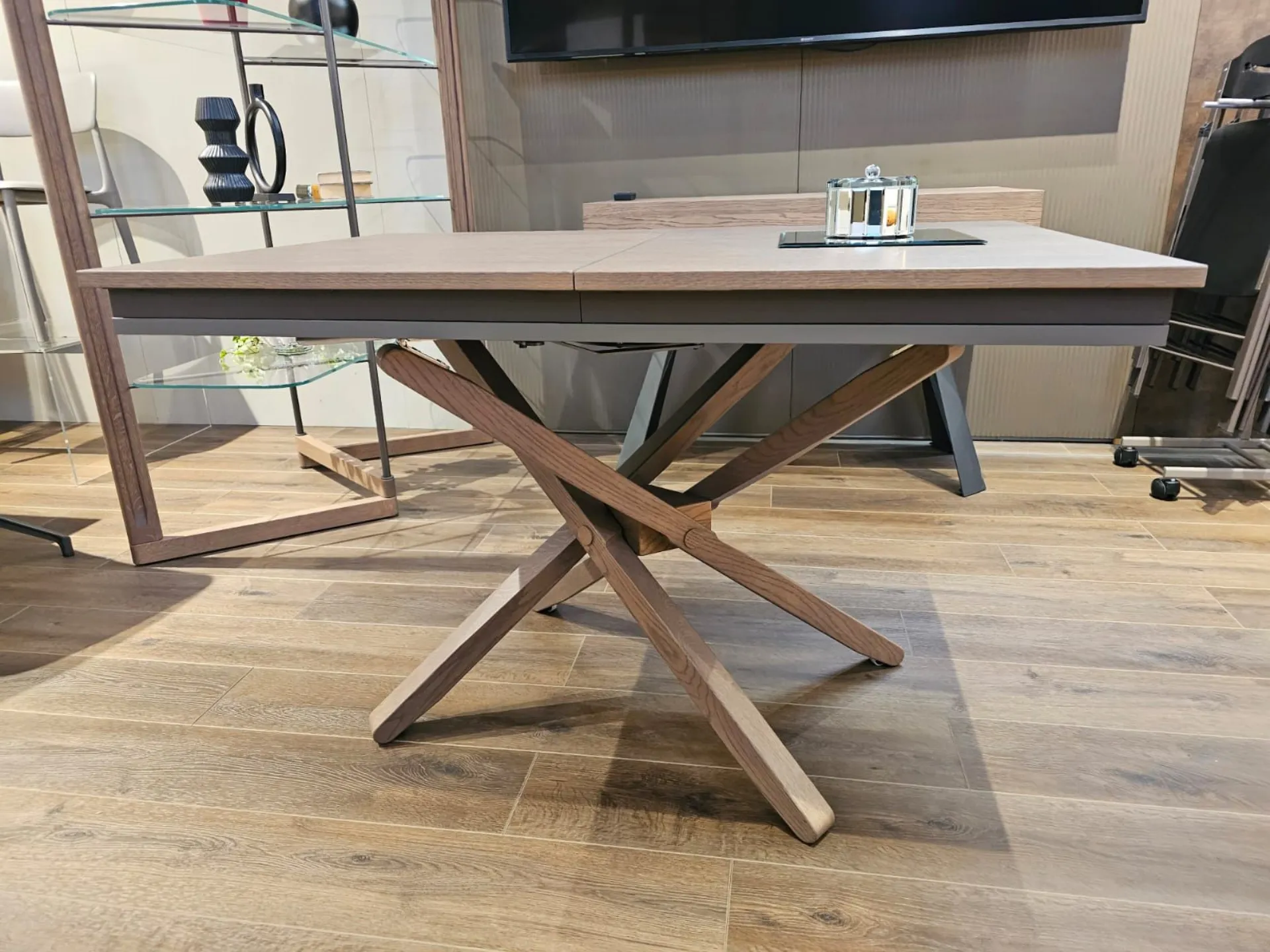 Tavolino trasformabile con basamento incrociato in legno di rovere wild delhi, dotato di allunga che permette al piano di arrivare a 177cm di lunghezza.