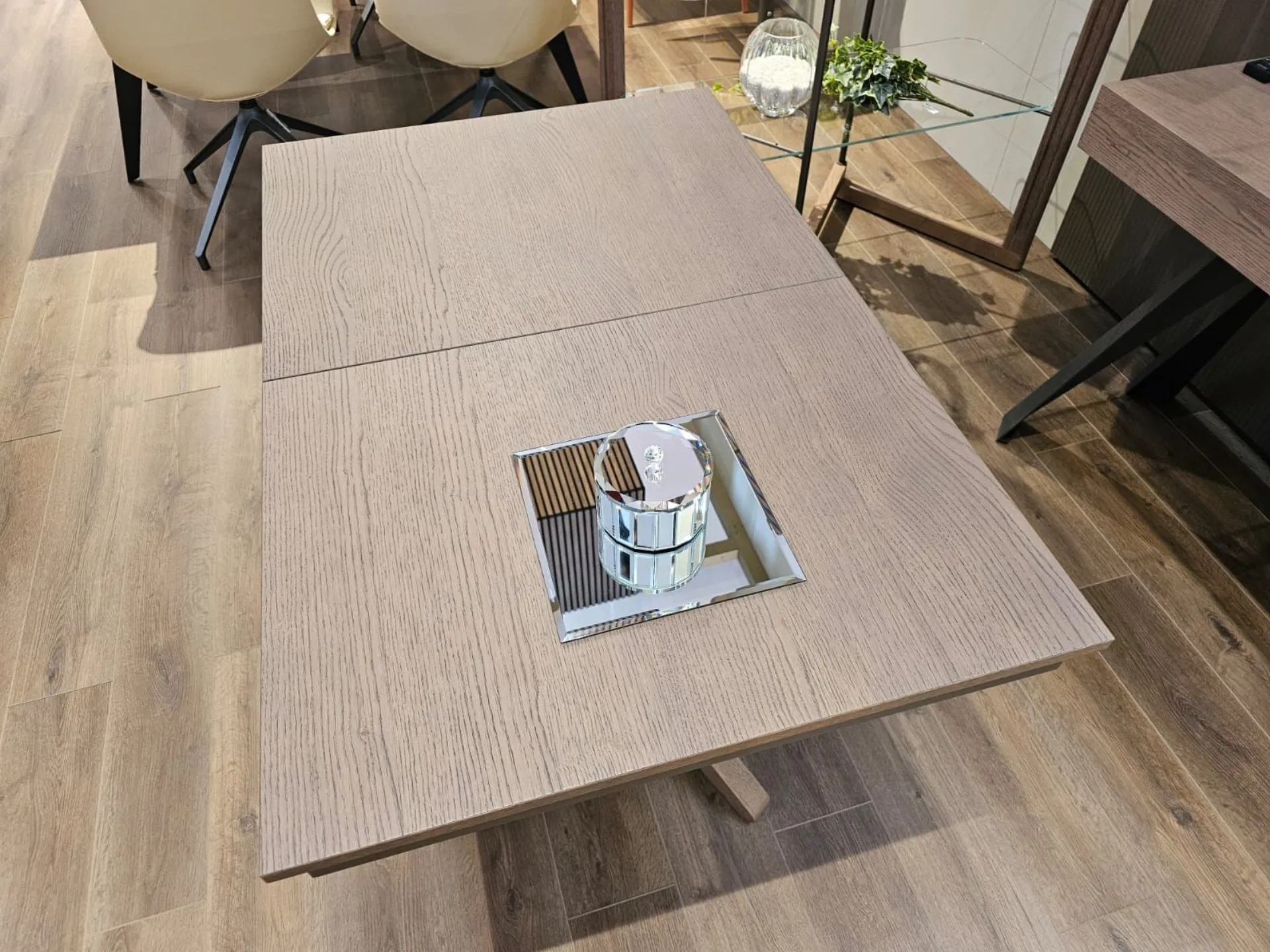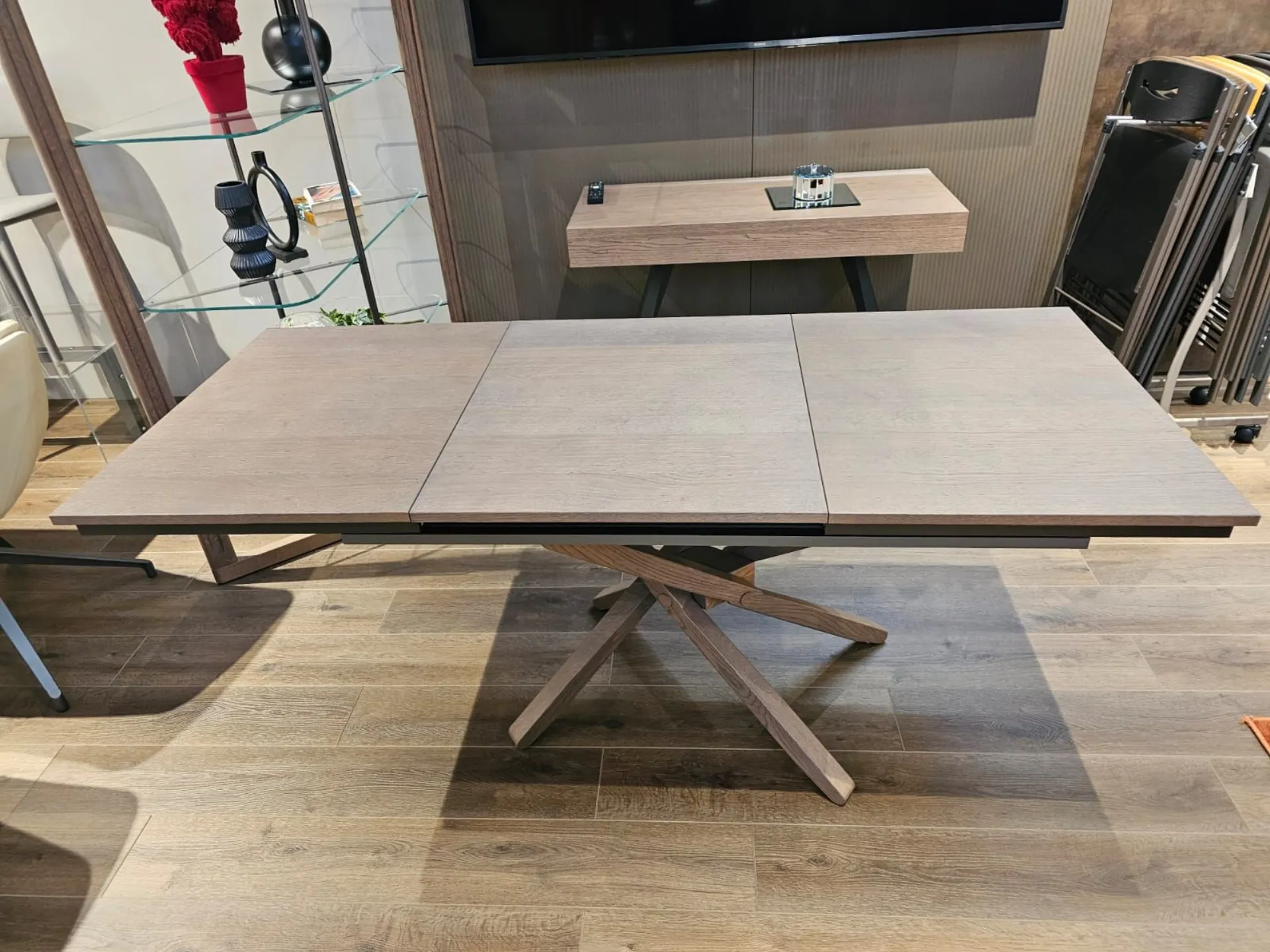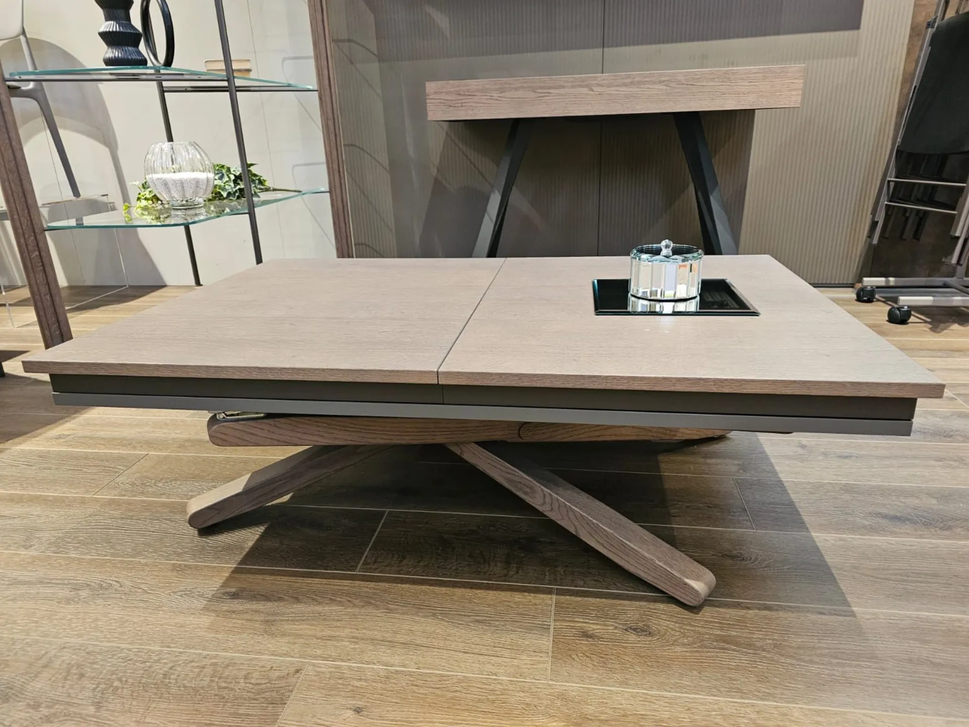 Tavolino trasformabile con basamento incrociato in legno di rovere wild delhi, dotato di allunga che permette al piano di arrivare a 177cm di lunghezza.