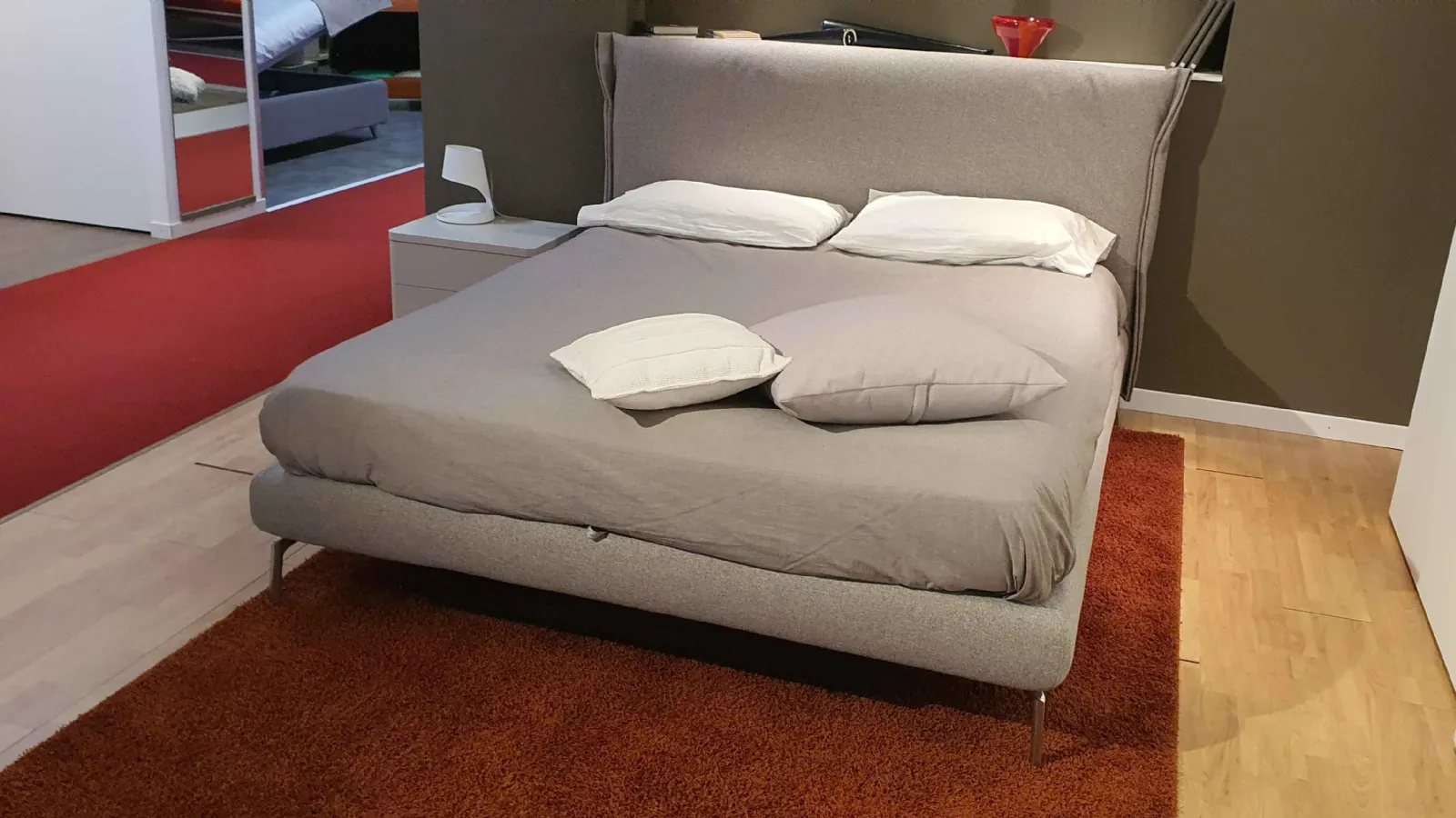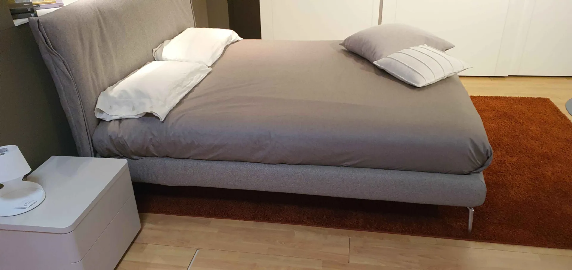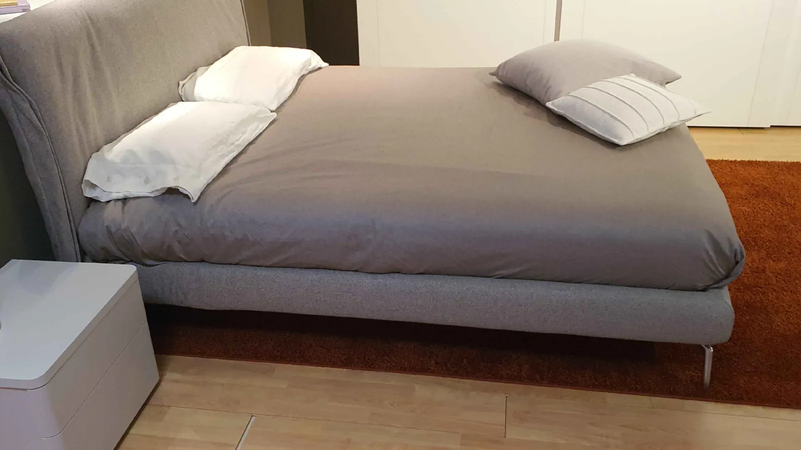 E' composto da testata curvata ed avvolgente. Il voulant laterale è ripiegato a formare una morbida semiluna, in perfetta armonia con le curve del letto e sono rivestiti con tessuto sfoderabile e lavabile in tonalità grigia cat.C.. Il letto è sollevato da terra con piedini optional in finitura cromata.