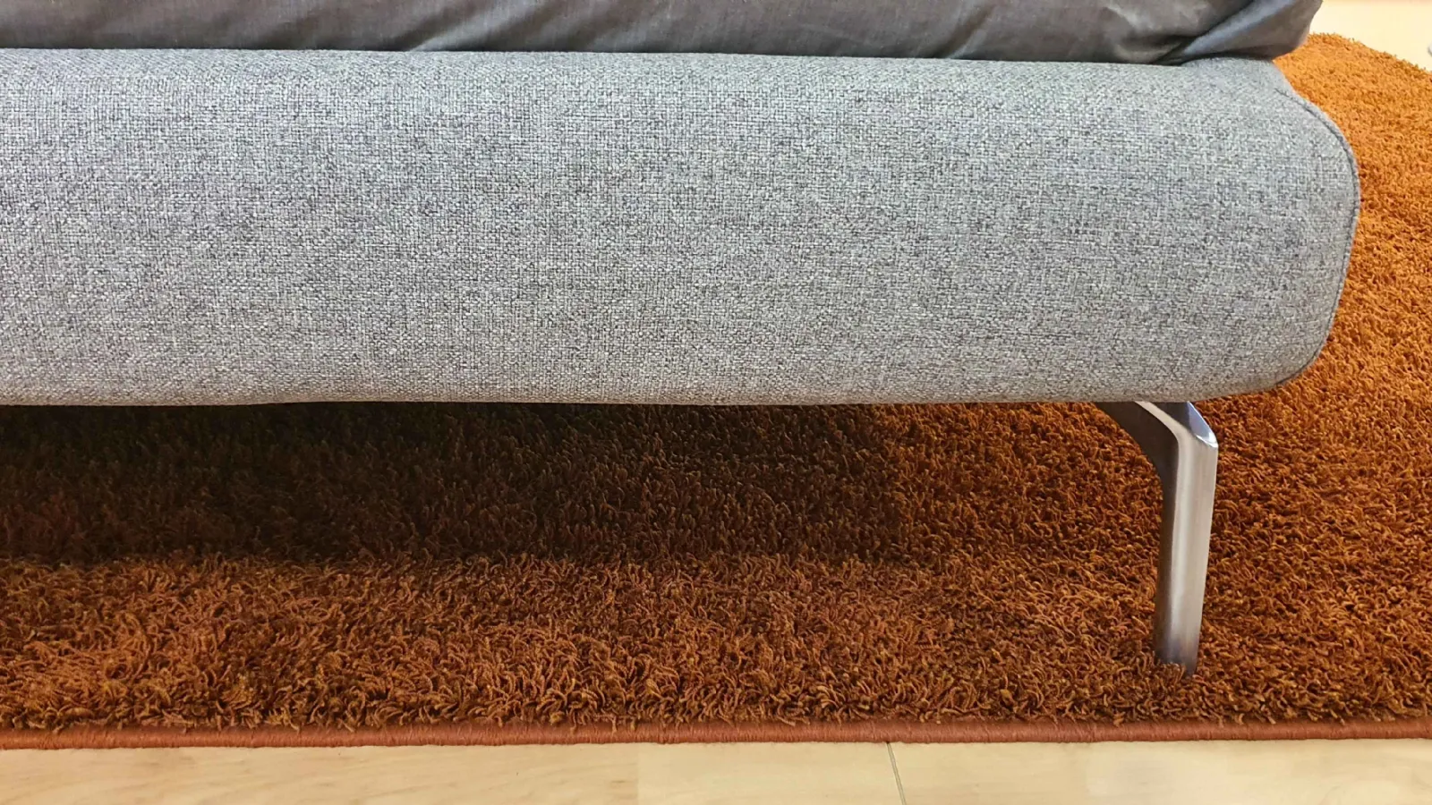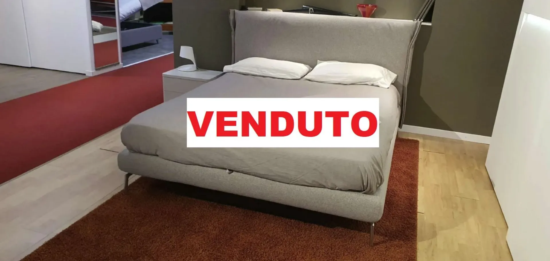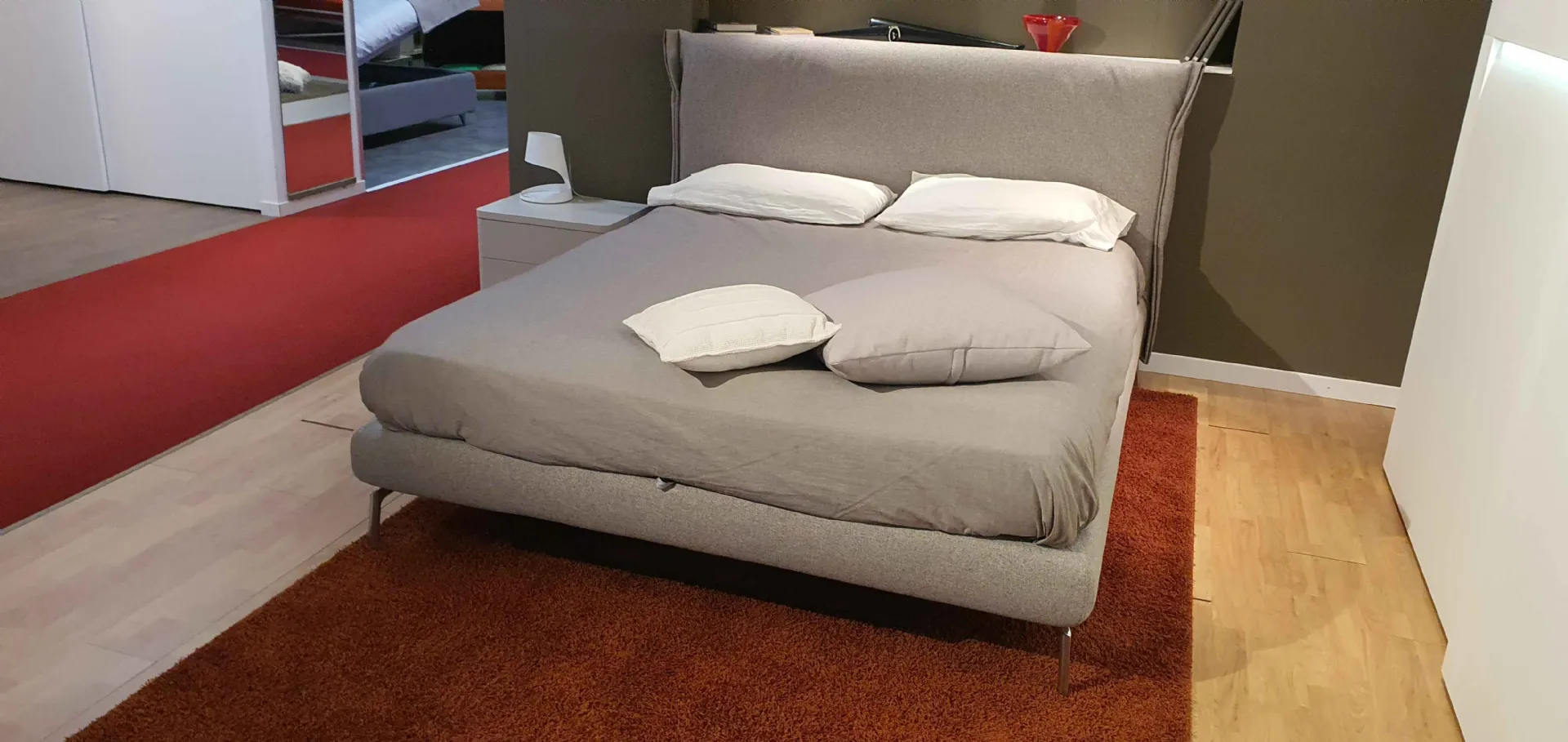 E' composto da testata curvata ed avvolgente. Il voulant laterale è ripiegato a formare una morbida semiluna, in perfetta armonia con le curve del letto e sono rivestiti con tessuto sfoderabile e lavabile in tonalità grigia cat.C.. Il letto è sollevato da terra con piedini optional in finitura cromata.