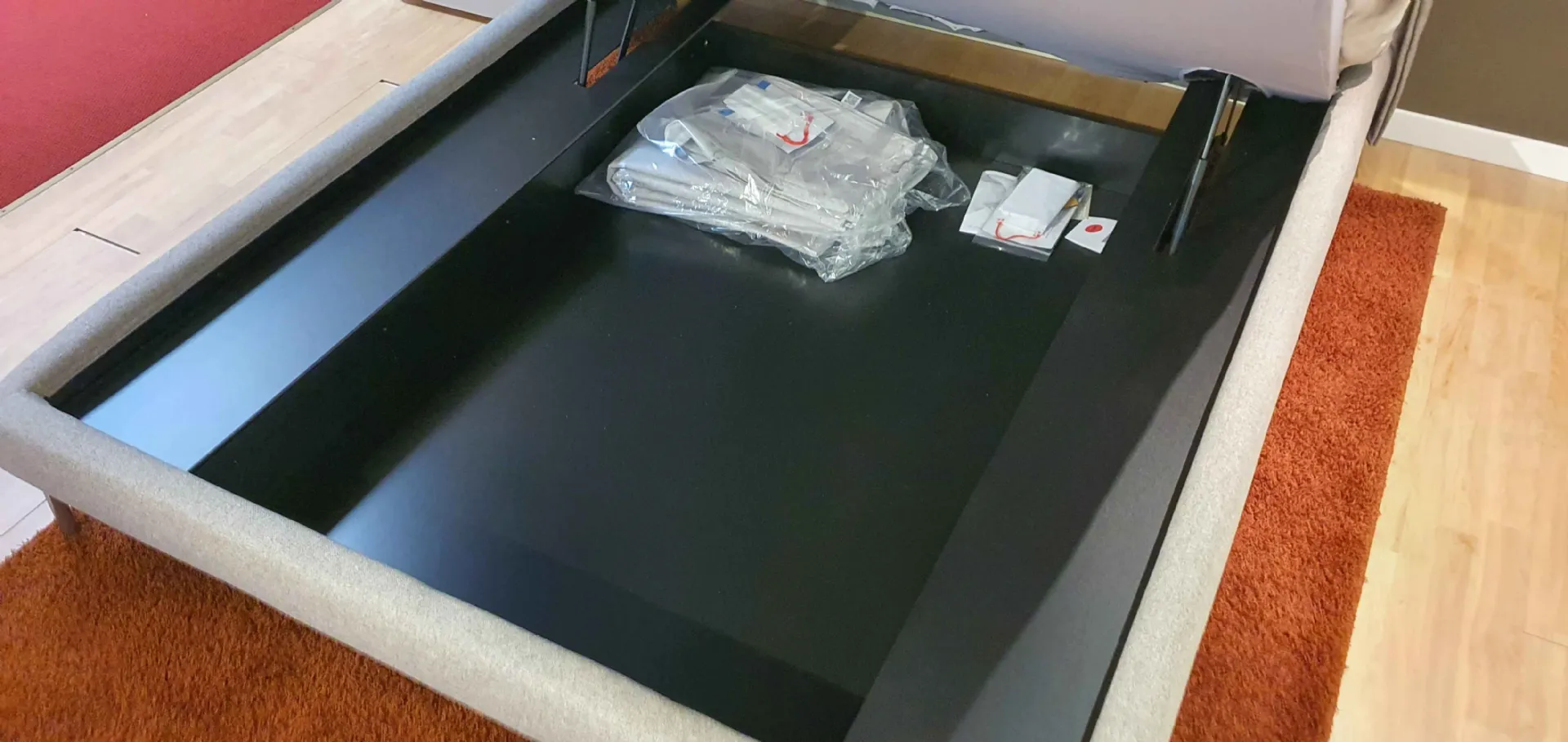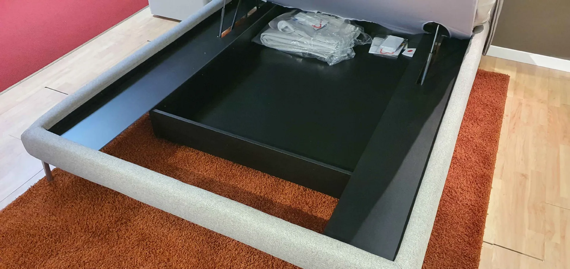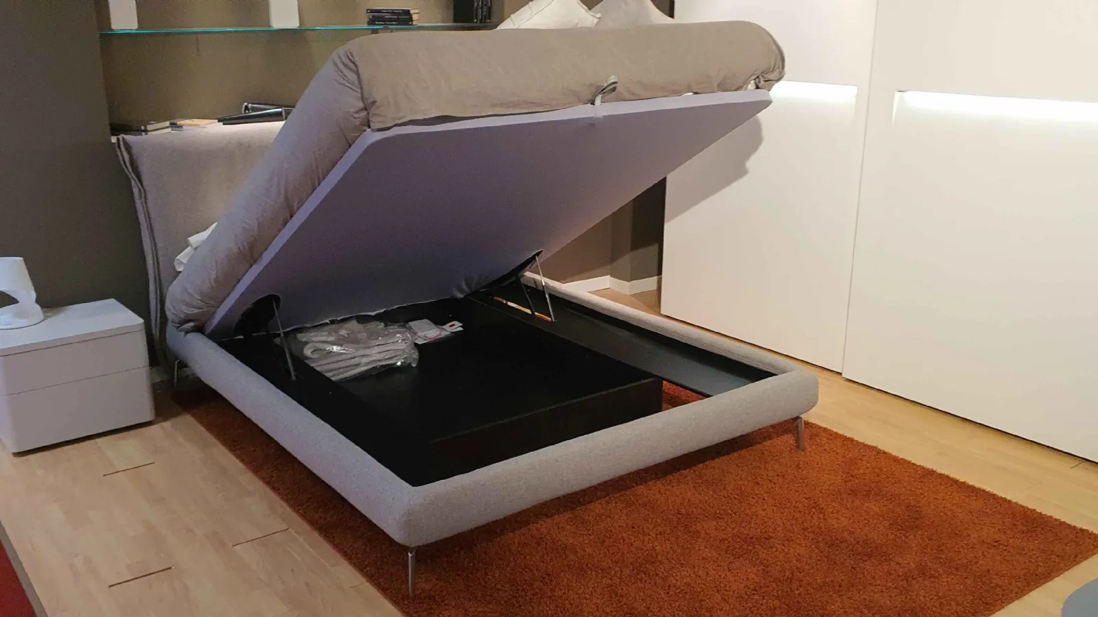 E' un letto confortevole e 'leggero'. Infatti, pur avendo al suo interno il contenitore, ha un giroletto piccolo ed essenziale che nasconde il vano contenitore al suo interno.