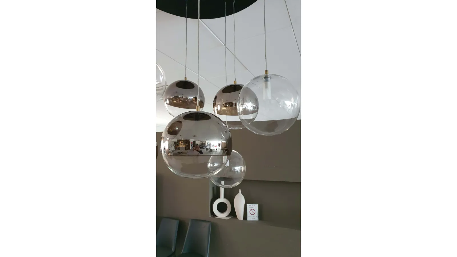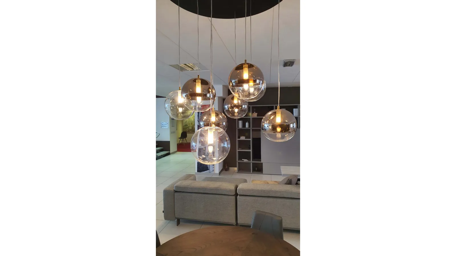 Il piatto di fissaggio a soffitto è in legno finitura rovere carbone e le ball sono in vetro temperato con dettagli in colore bronzo