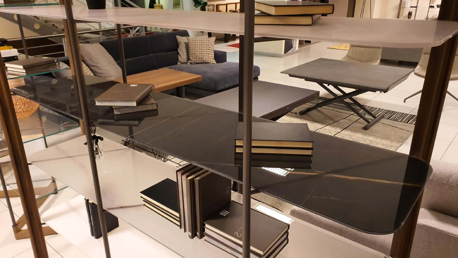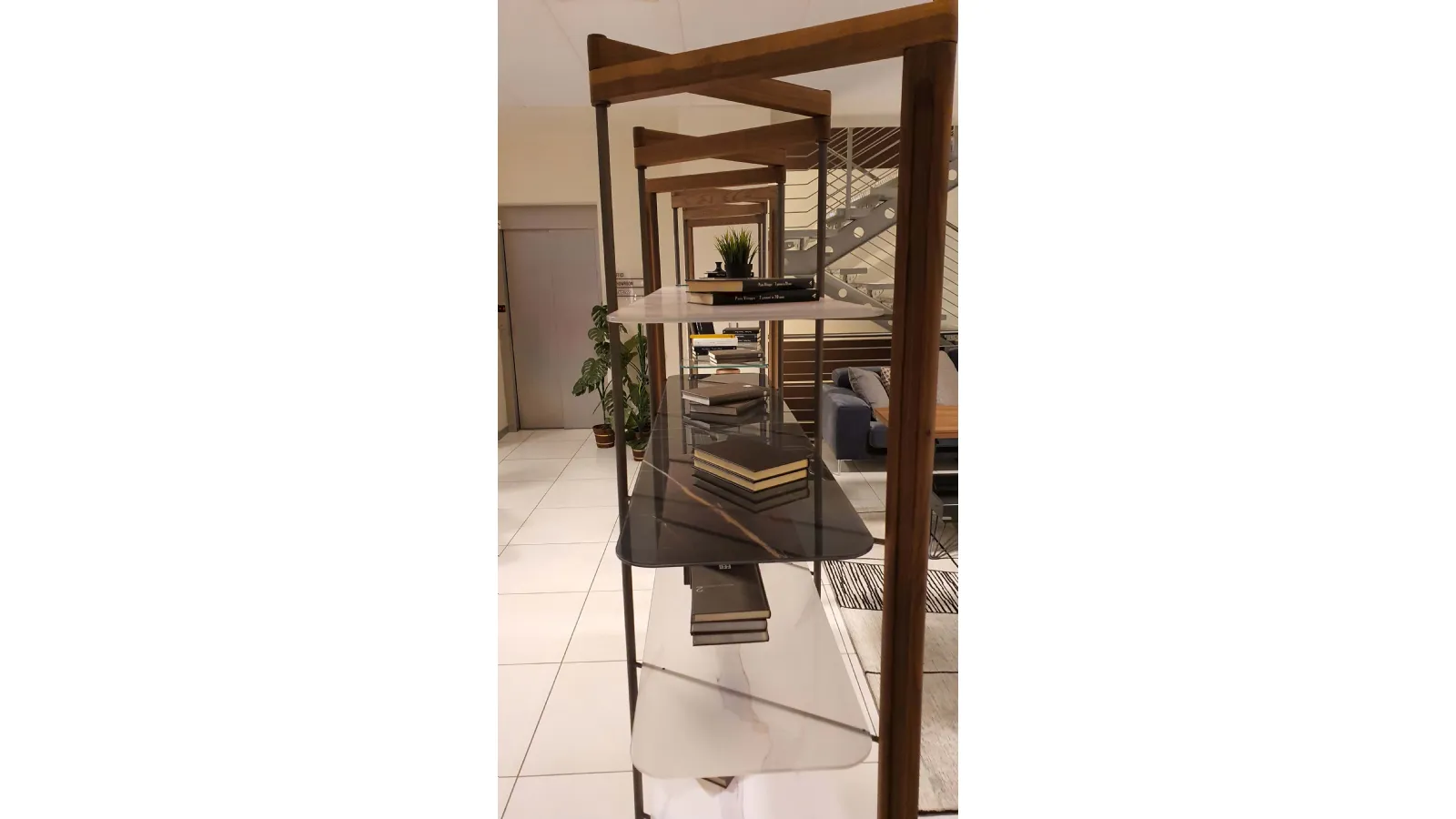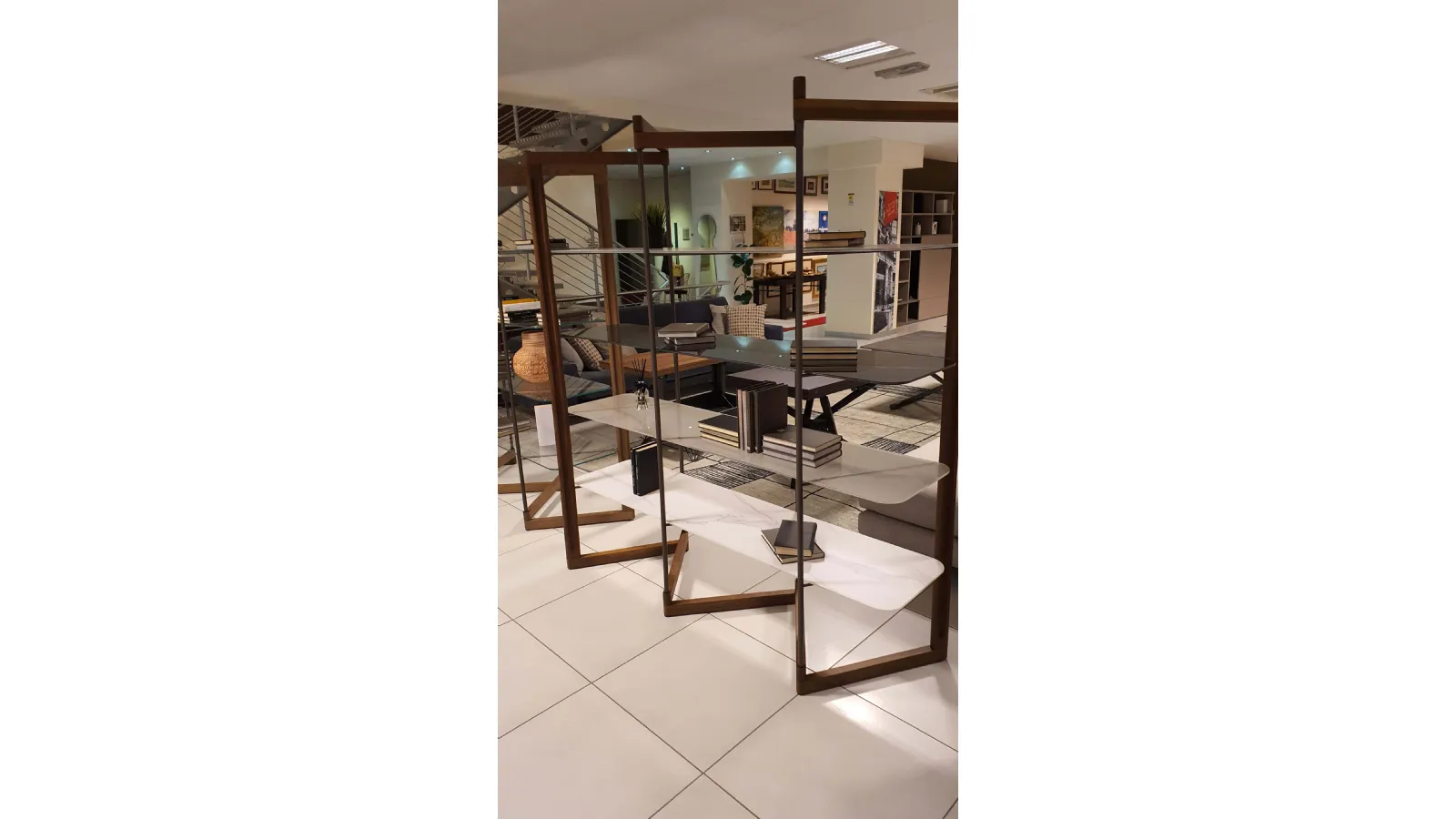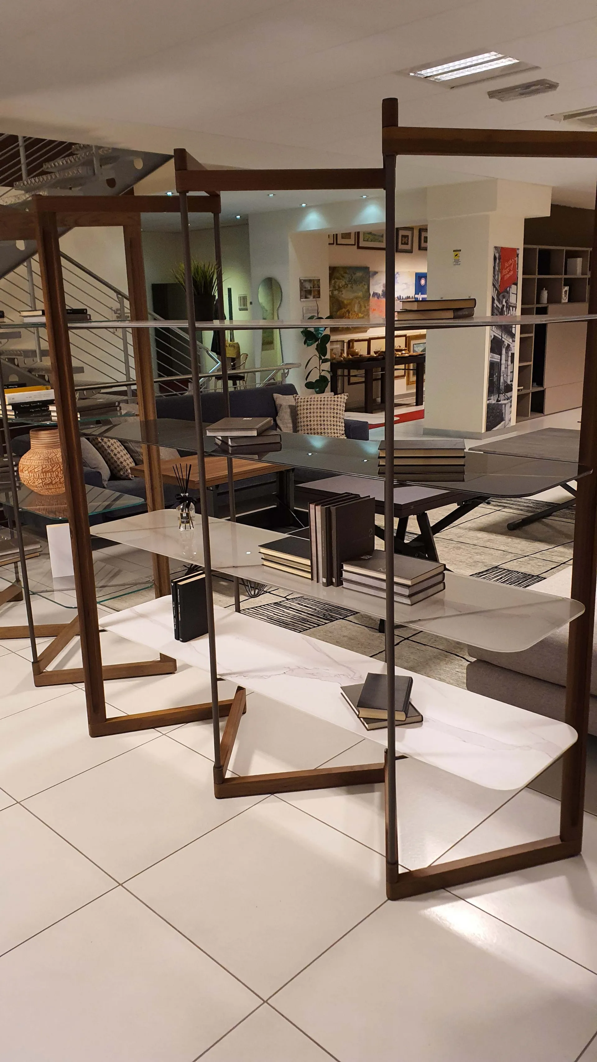 PANTO è la libreria modulare che rievoca le forme del pantografo. Attraverso la combinazione dei ripiani in marble glass ONICE, marble glass NERO e marble glass CALACATTA GOLD, è in grado di espandersi e restringersi mutando la sua forma e funzione. Autoportante come separatore di ambienti o posizionata a parete, è perfetta per tutti coloro che desiderano abitualmente riorganizzare spazi attivi. La struttura è in LEGNO NOCE CANALETTO con montanti in metallo finitura BRONZO e mensole in MARBLE GLASS DI VARIE FINITURE La sua misura è di cm L.186xP.48xH.199