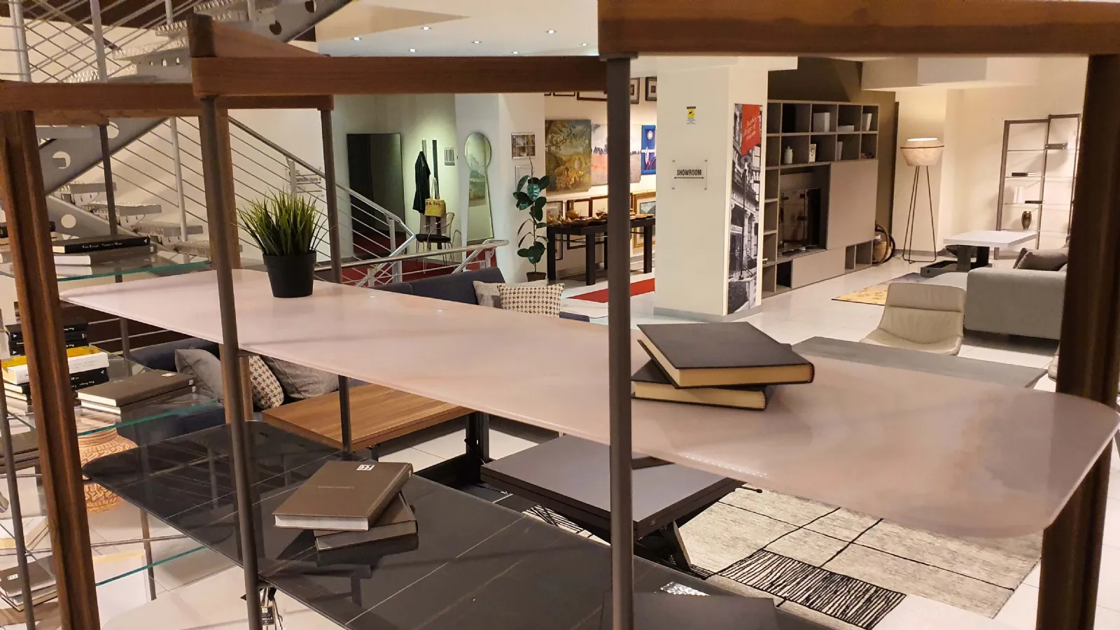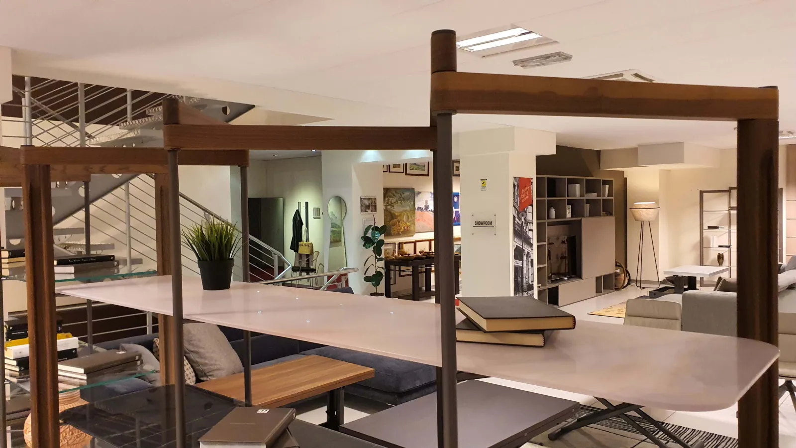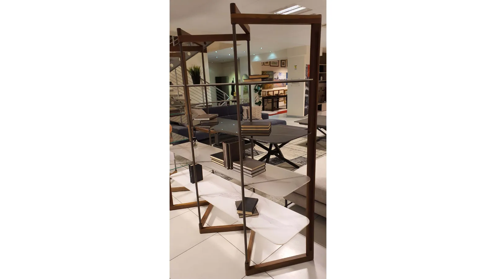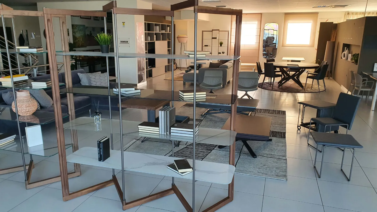 PANTO è la libreria modulare che rievoca le forme del pantografo. Attraverso la combinazione dei ripiani in marble glass ONICE, marble glass NERO e marble glass CALACATTA GOLD, è in grado di espandersi e restringersi mutando la sua forma e funzione. Autoportante come separatore di ambienti o posizionata a parete, è perfetta per tutti coloro che desiderano abitualmente riorganizzare spazi attivi. La struttura è in LEGNO NOCE CANALETTO con montanti in metallo finitura BRONZO e mensole in MARBLE GLASS DI VARIE FINITURE La sua misura è di cm L.186xP.48xH.199