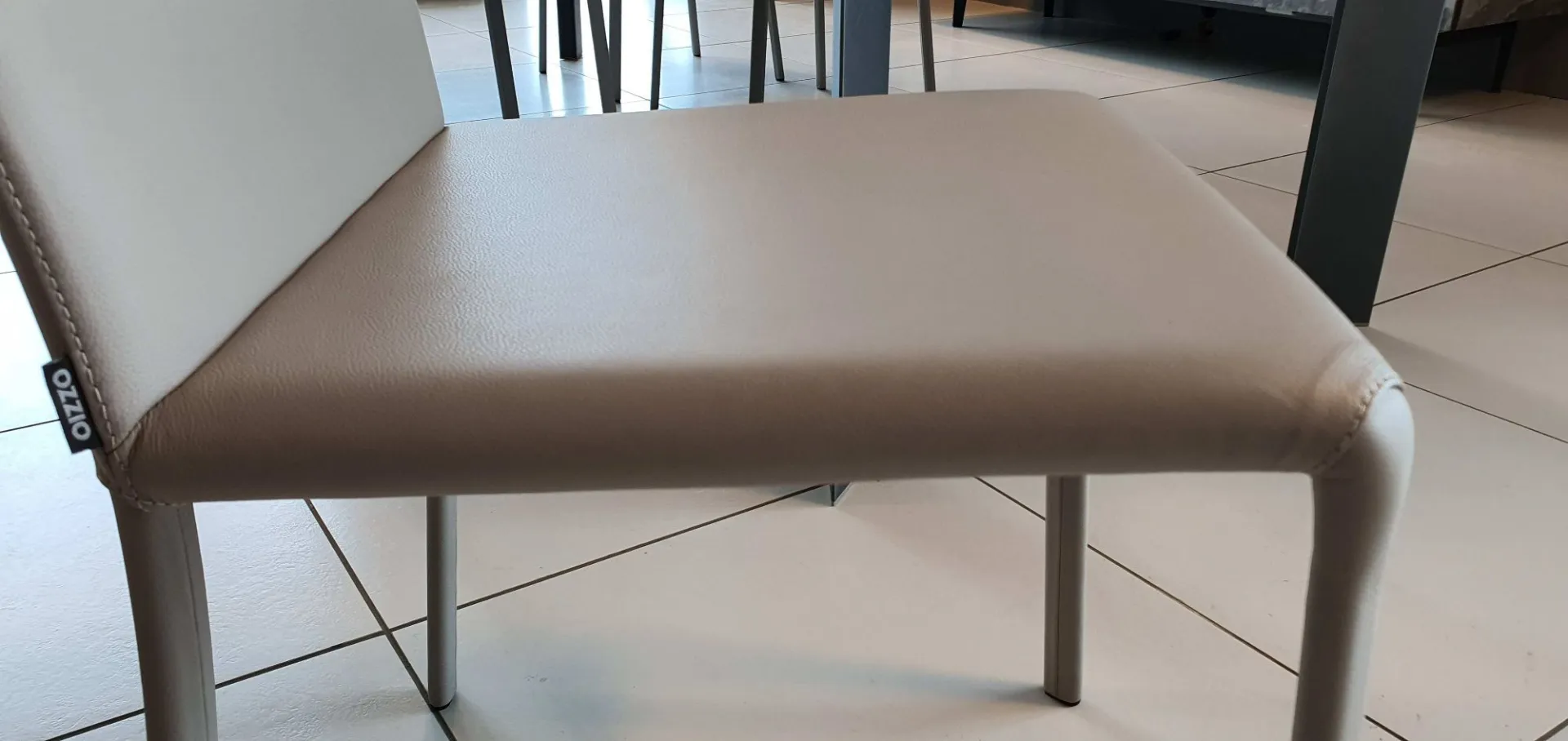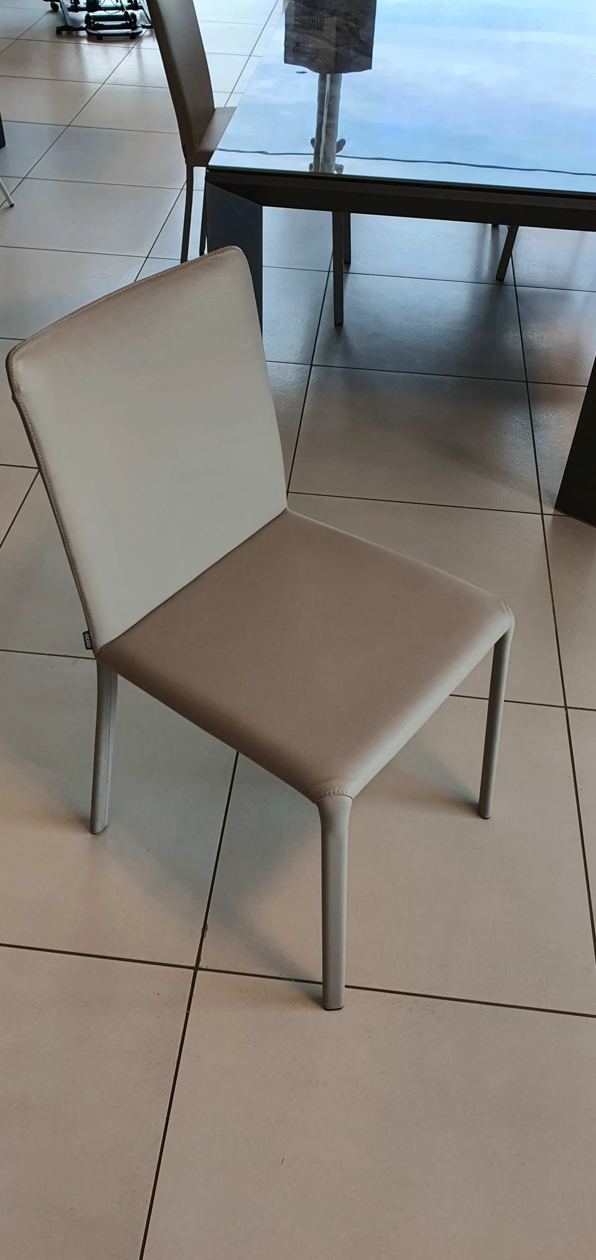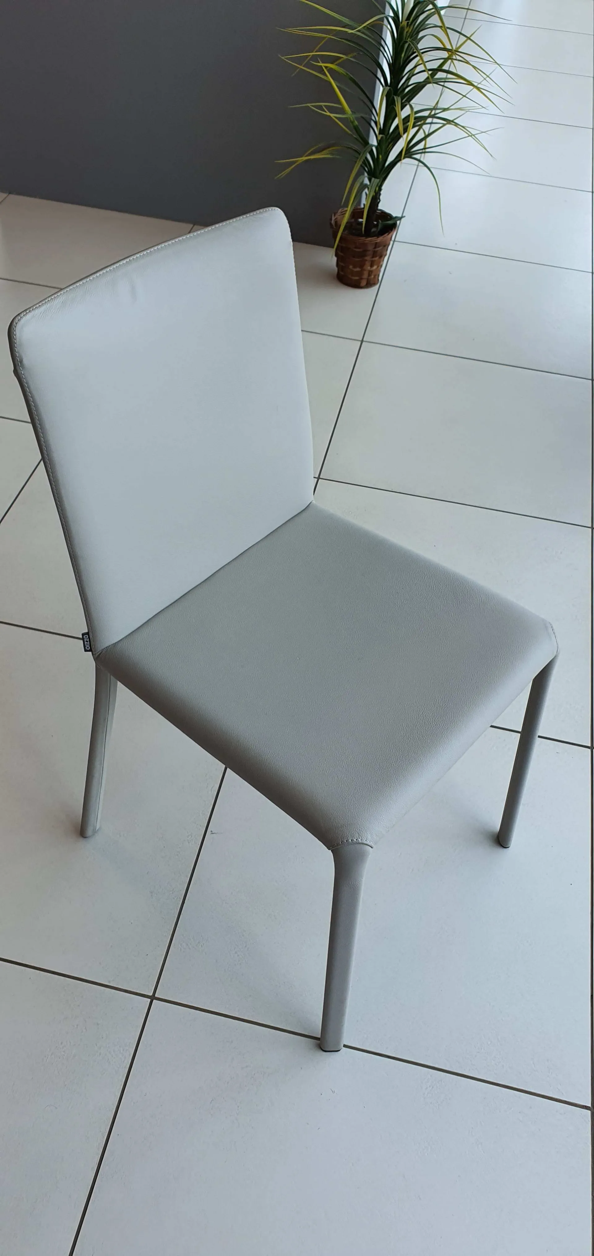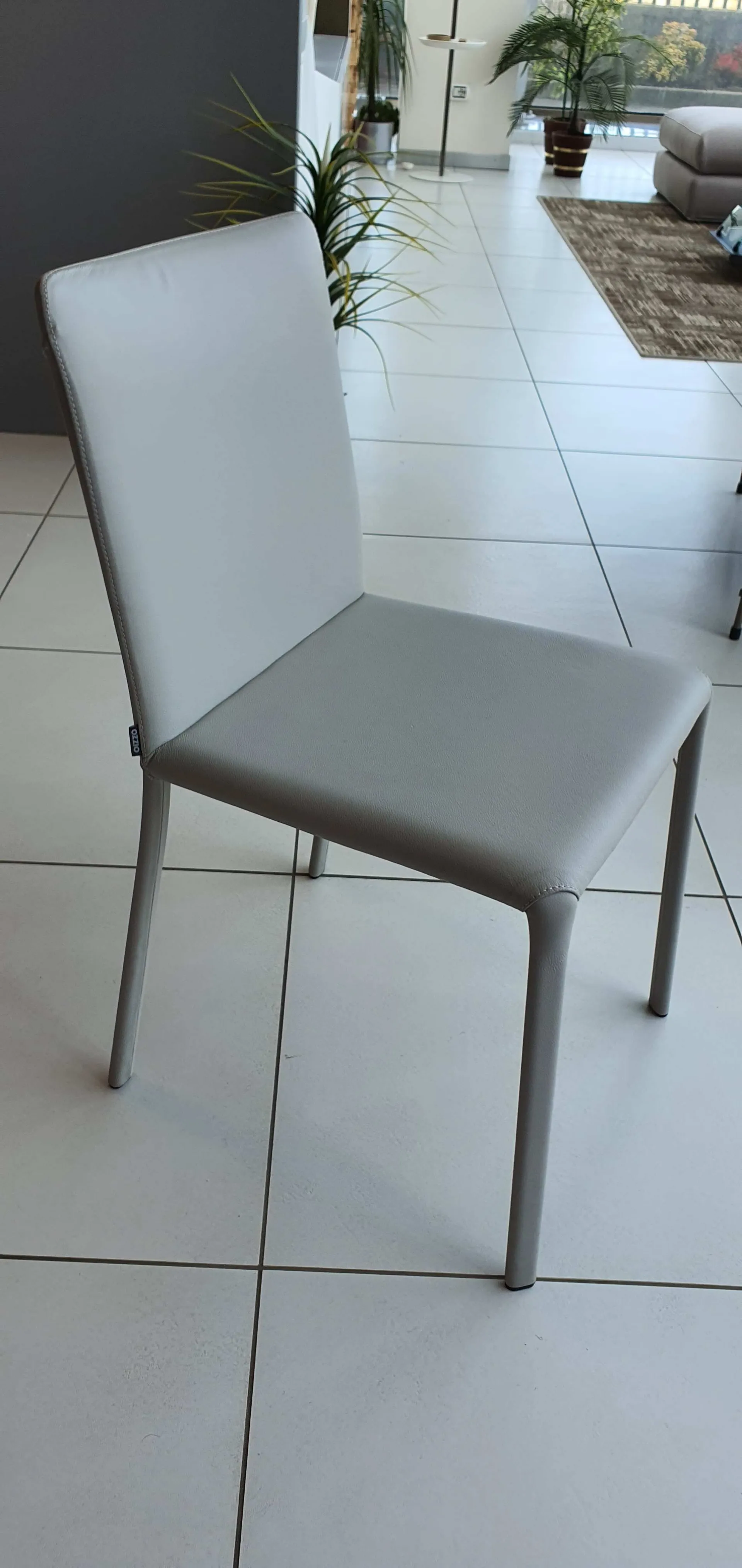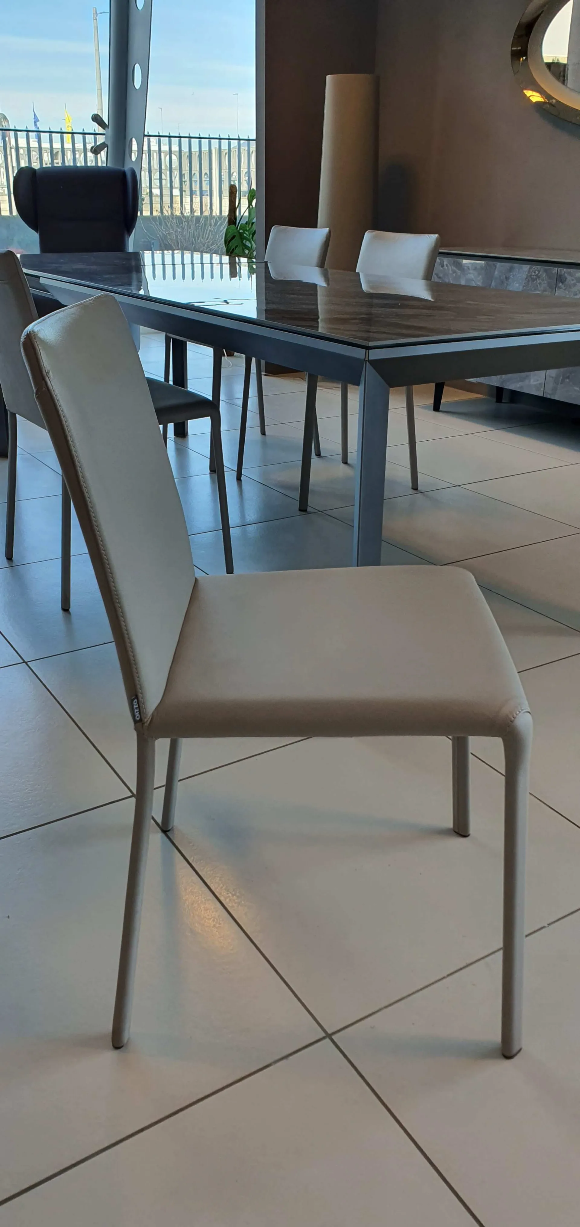 Lunette è una sedia con struttura in metallo completamente rivestita in pelle naturale.Il suo design essenziale si armonizza con i tavoli dal design moderno come quello mostrato in foto. Il colore della pelle è in grigio tenue . E’ una sedia preziosa con cuciture tono su tono a vista.