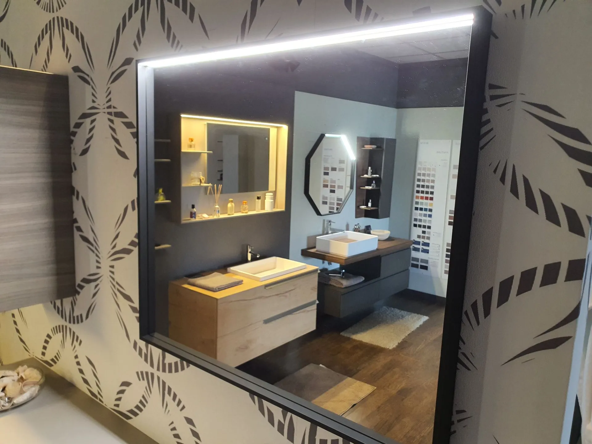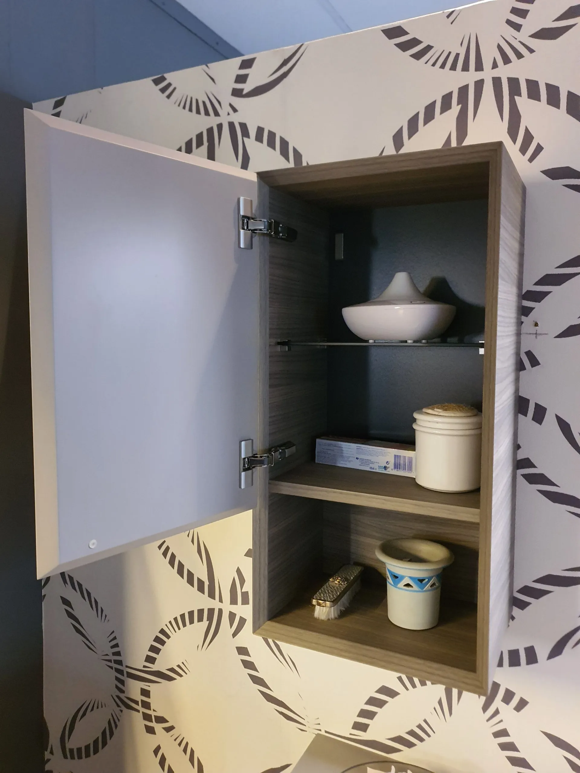 Specchiera sospesa di misura cm L.80xH.70 con profilo in metallo e pensile laterale con anta battente.