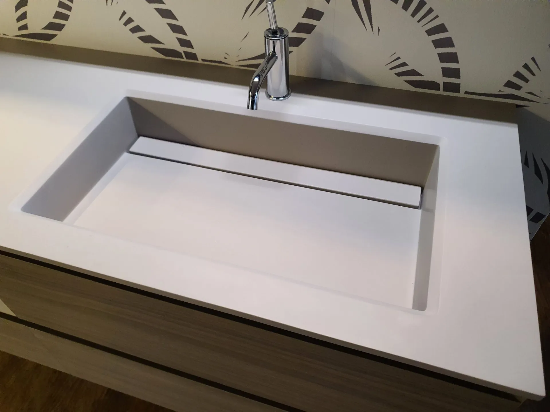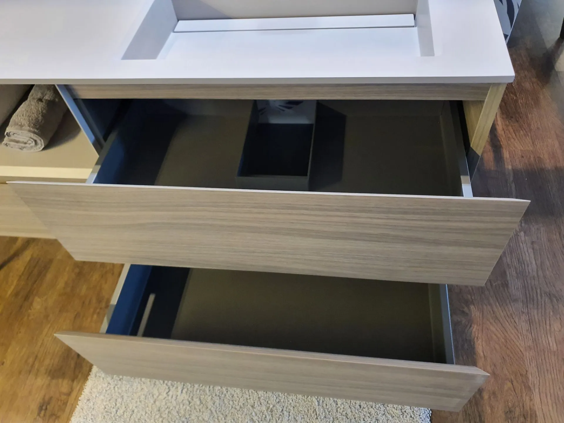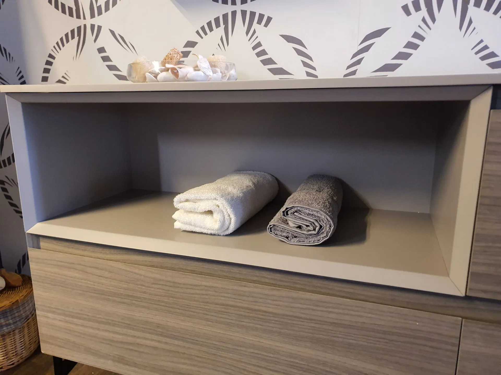 La finitura è in nobilitato Noce Rigato Grigio e top con vasca integrata in Gelcolor Tortora opaco.