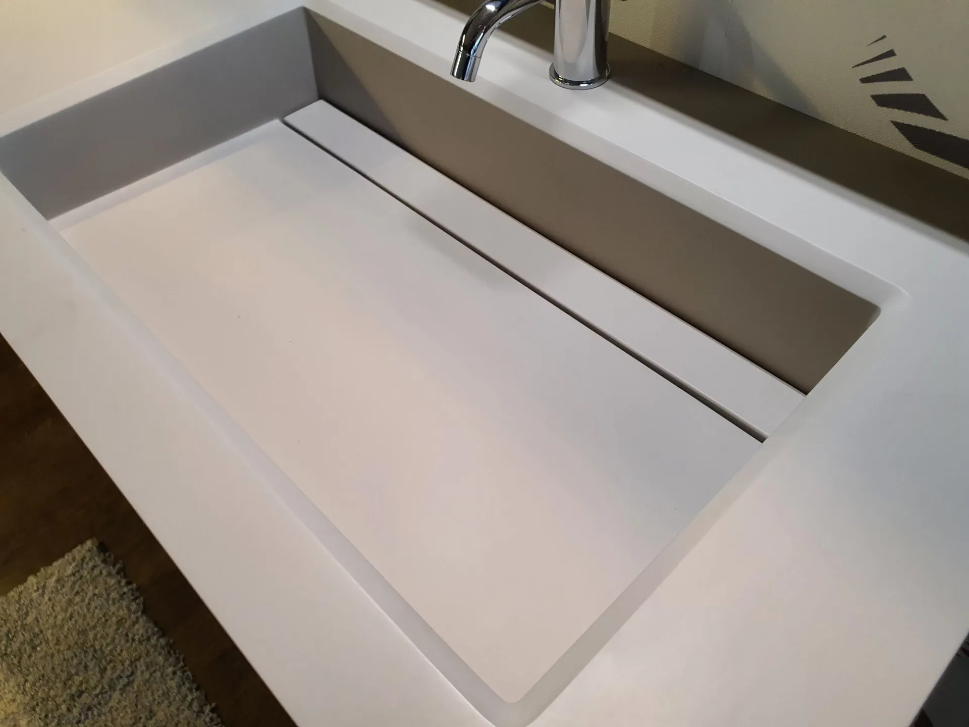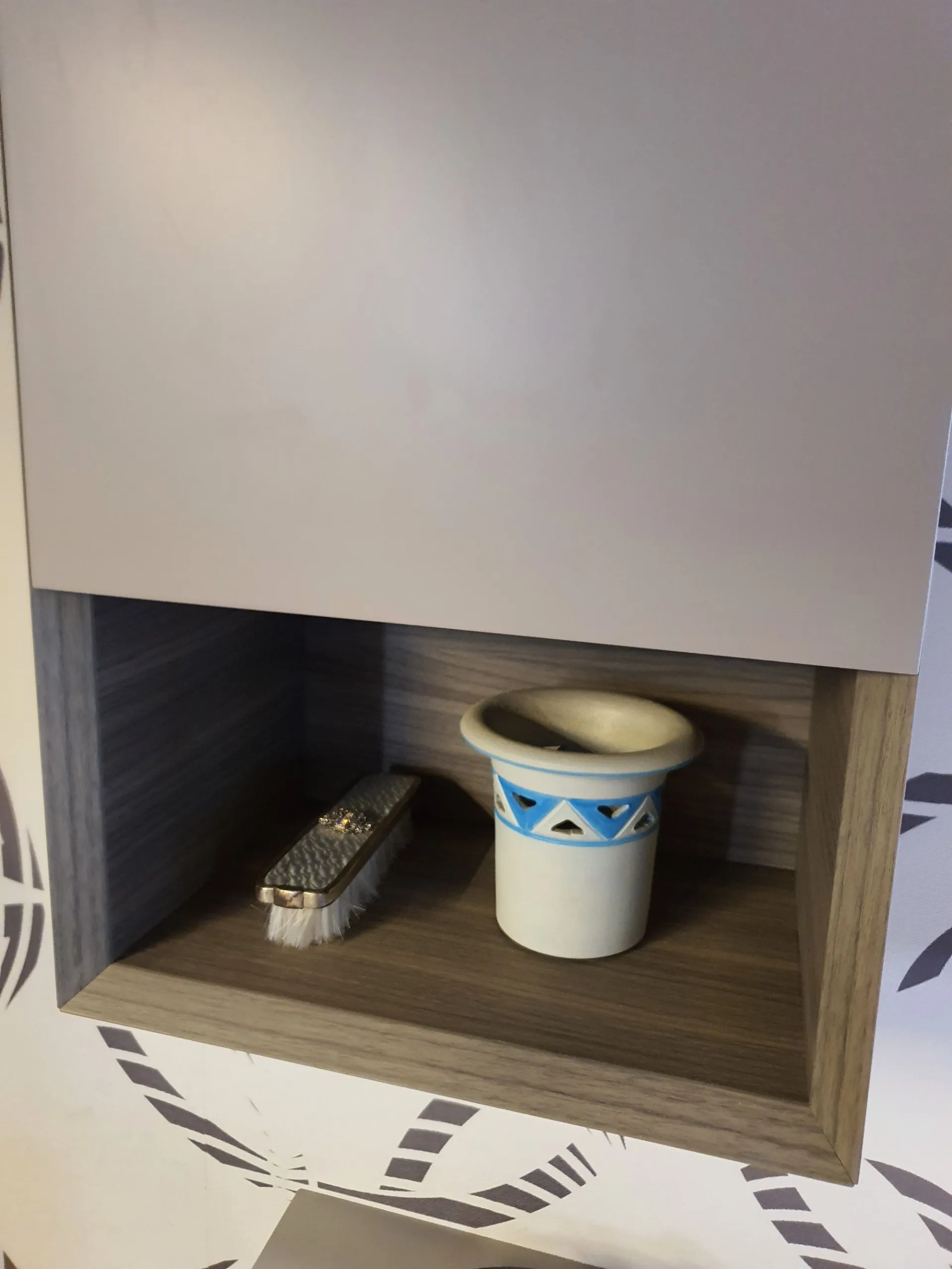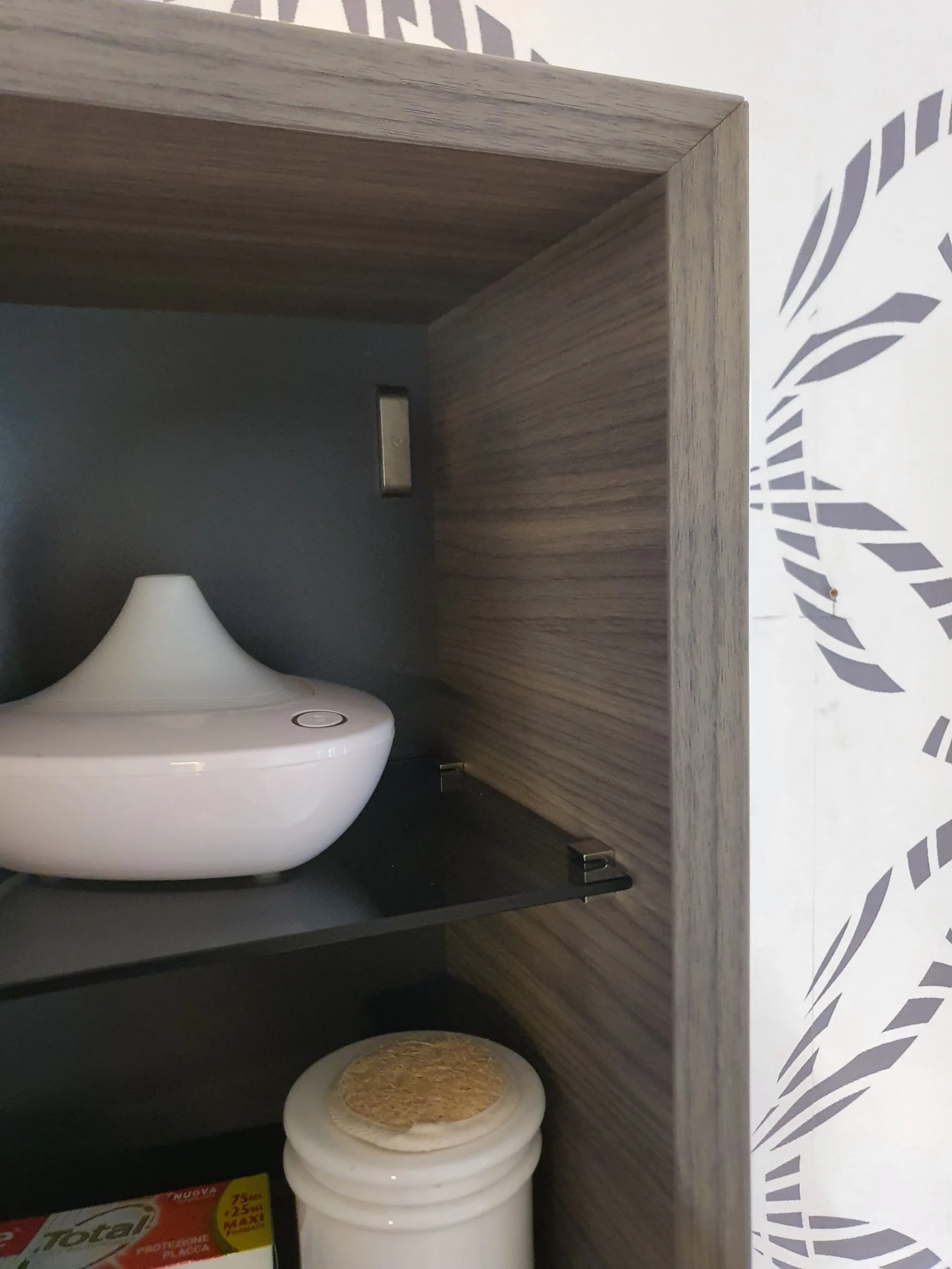 La finitura è in nobilitato Noce Rigato Grigio e top con vasca integrata in Gelcolor Tortora opaco.