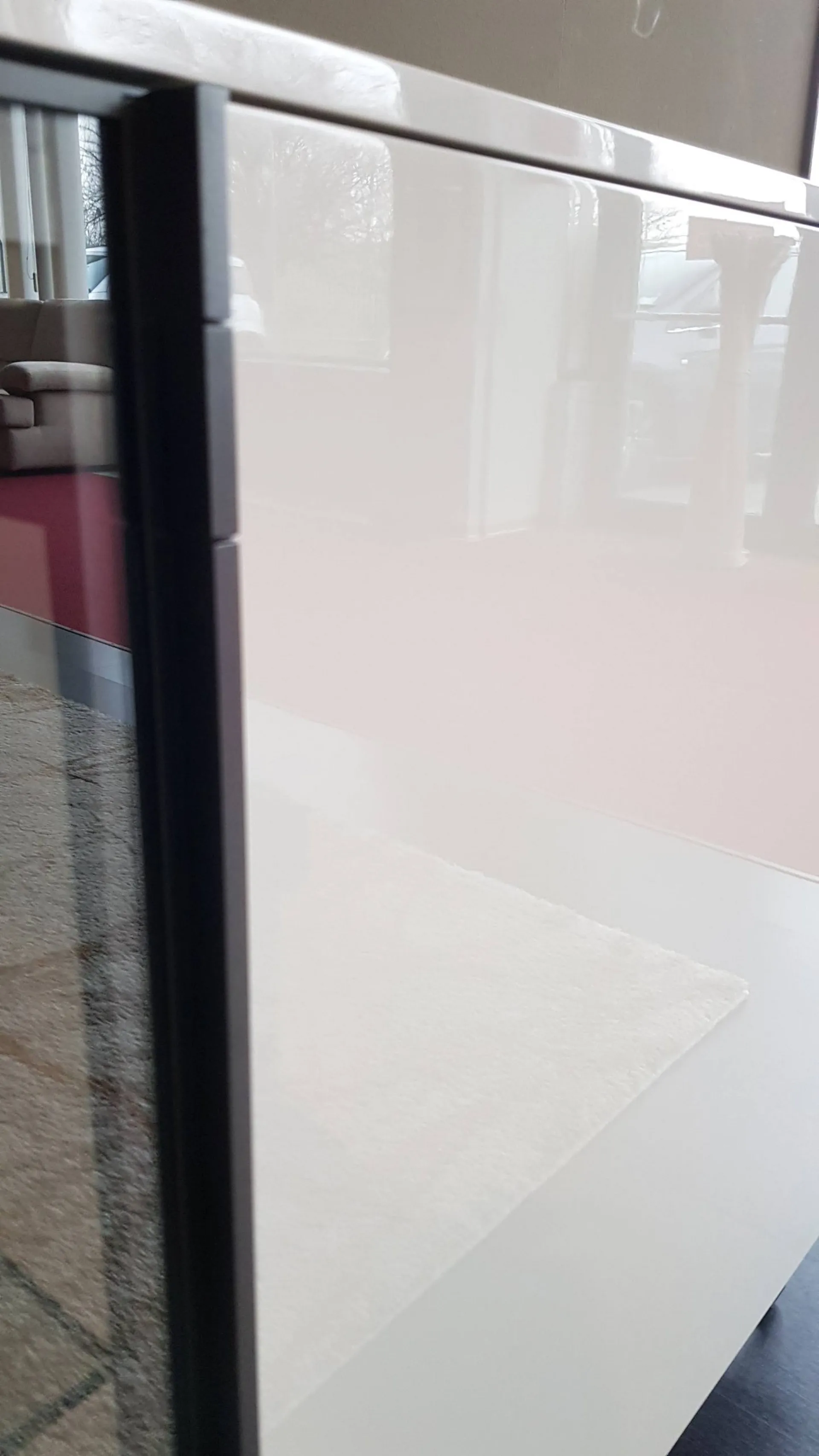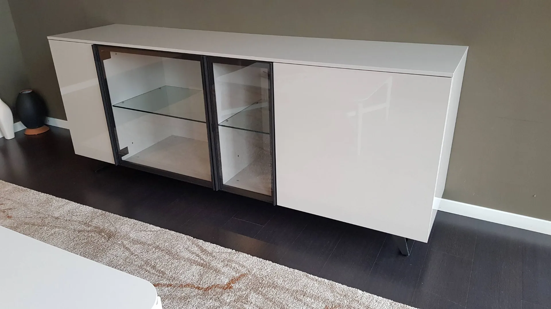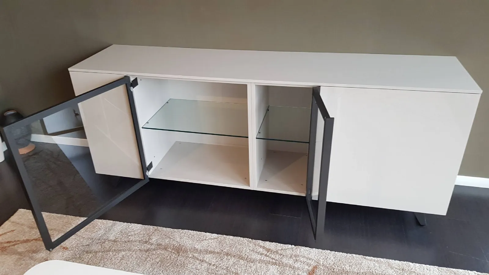 Madia originale dal design elegante, capiente ma leggera, con struttura laccata lucida colore madreperla, ante laterali SX e DX in finitura laccata lucida colore madreperla, apertura push&pull, n.2 ante centrali mod. METROPOLIS SX e DX ad apertura a 180° con telaio colore antracite e vetro trasparente, basamento in metallo colore antracite, ripiani interni in vetro trasparente , meccanismi di apertura eleganti, poco visibili e regolabili lungo i tre assi, dimensioni totali cm 216.2 x p 51.5 x h 85.5