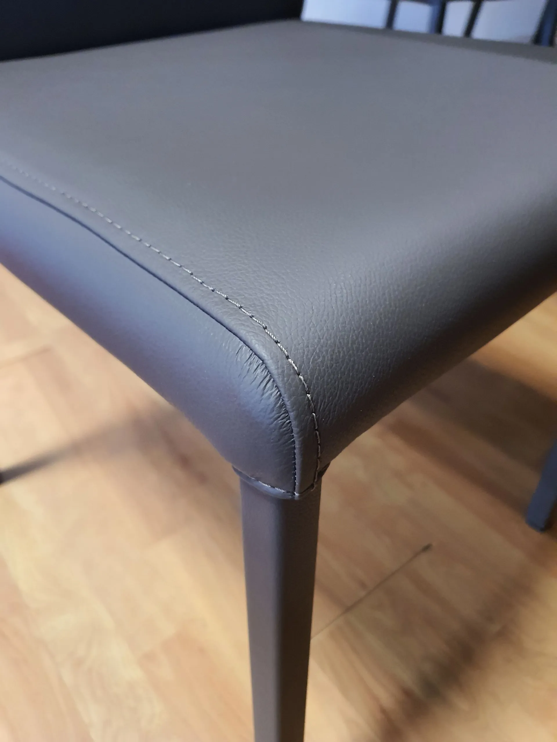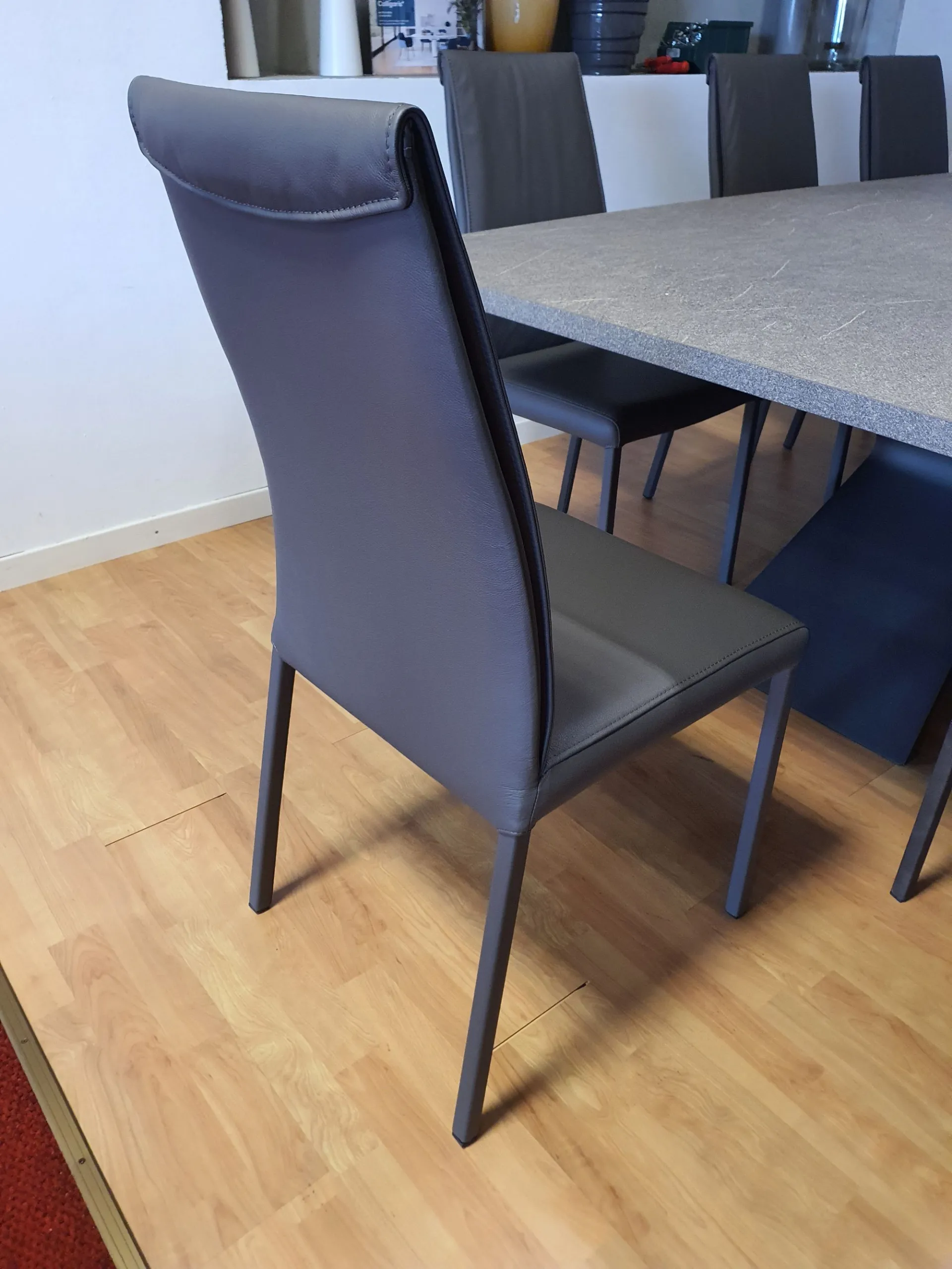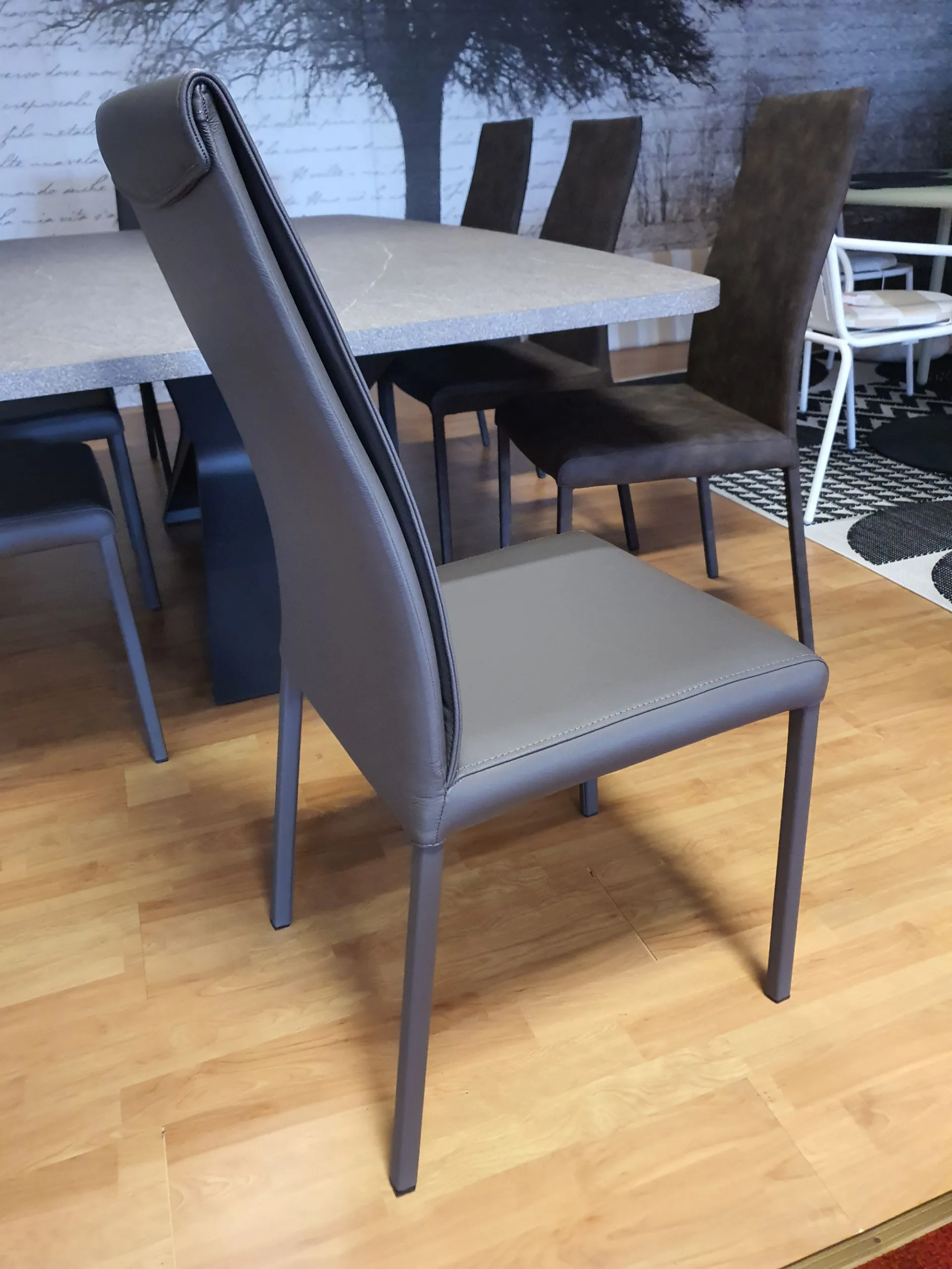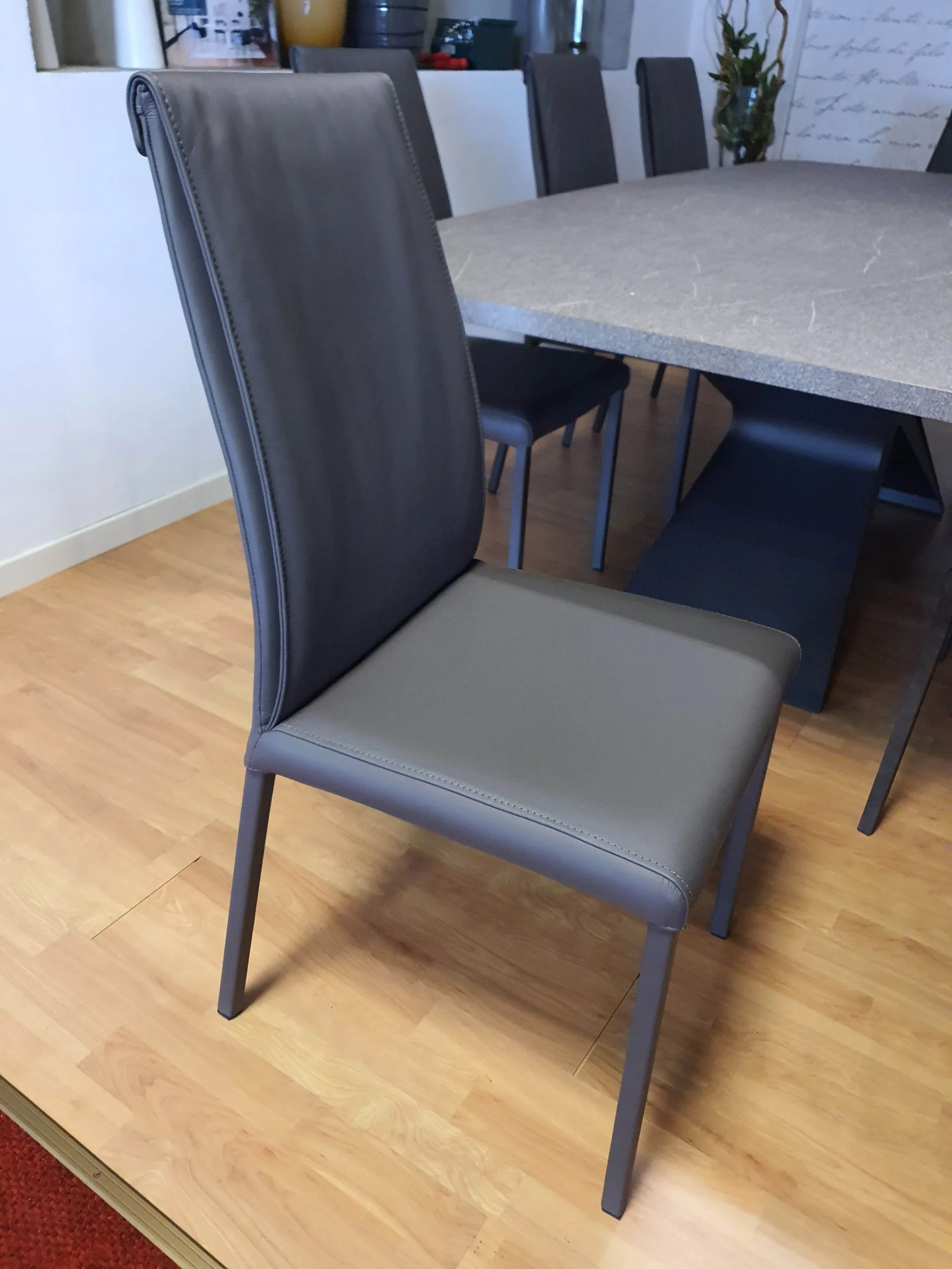 Comoda sedia imbottita Megan di Ozzio Italia. Completamente rivestita in pelle vera color mastice.