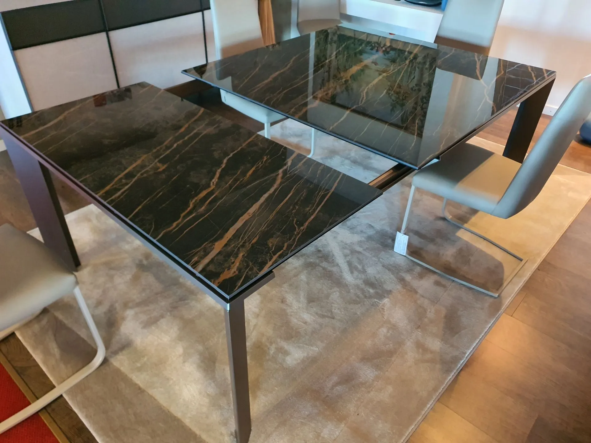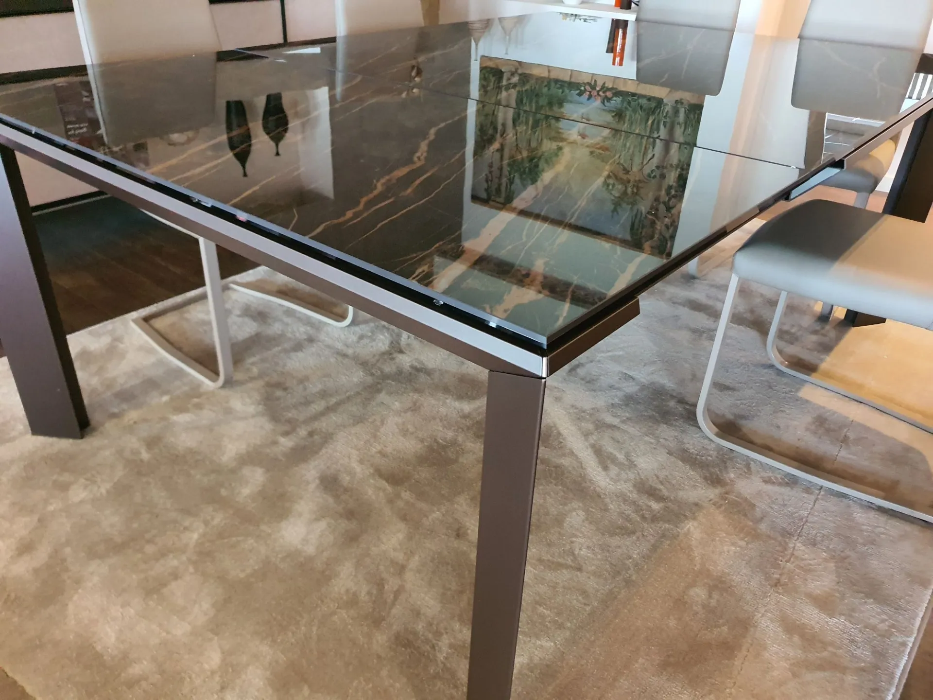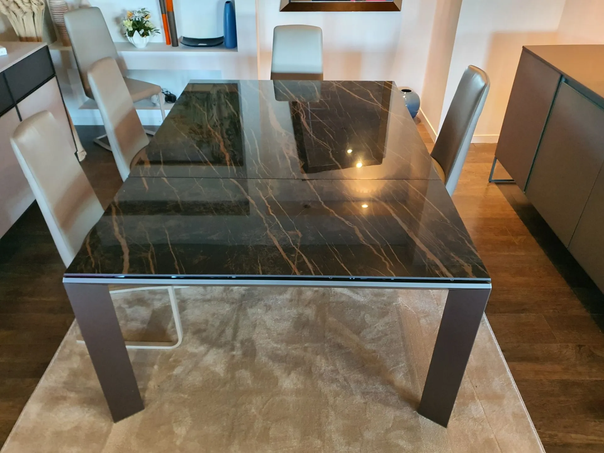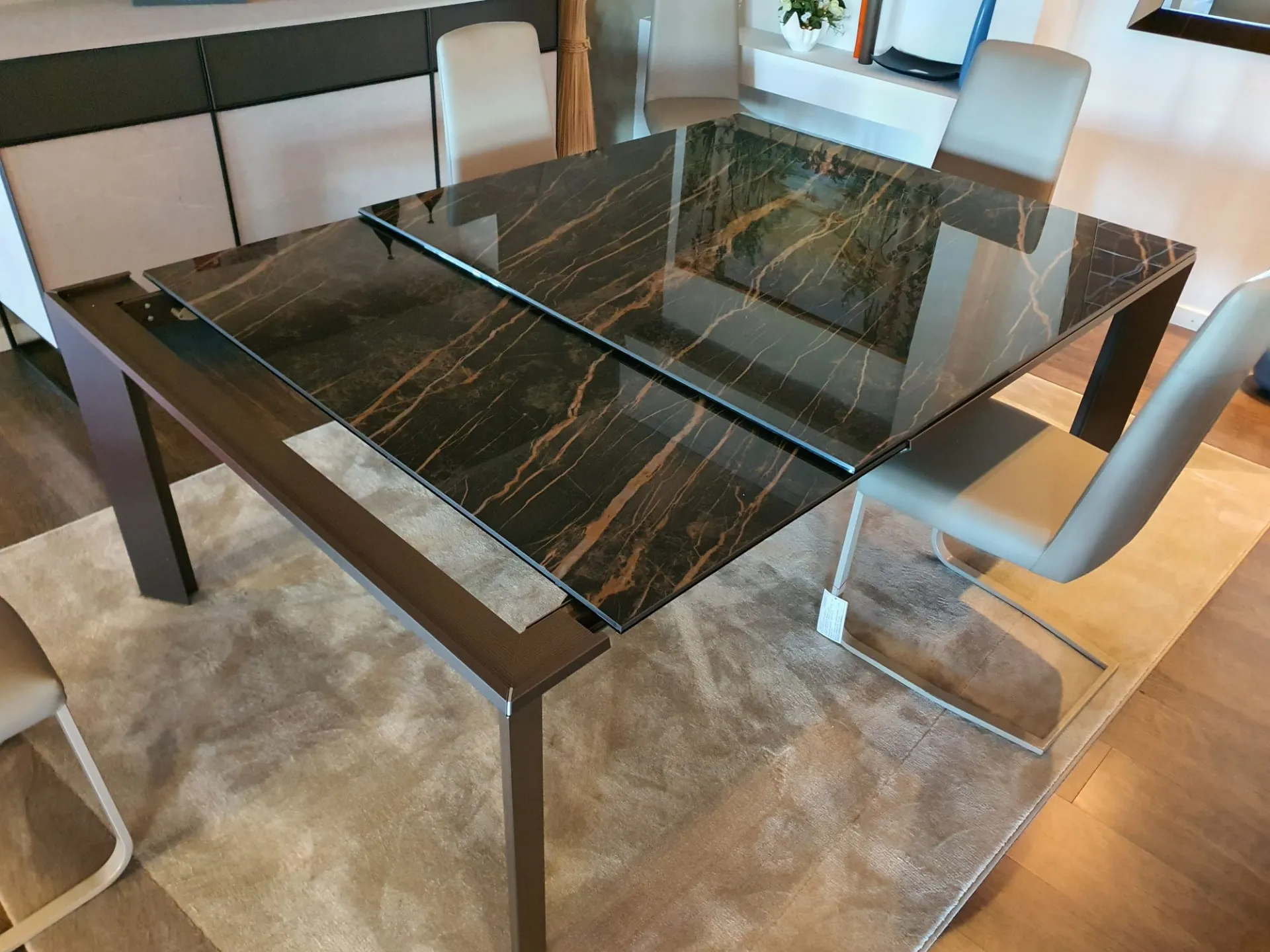 Tavolo allungabile mod.Metrò in estruso di alluminio con piano in ceramica lucida emperador e gambe in metallo colore bronzo