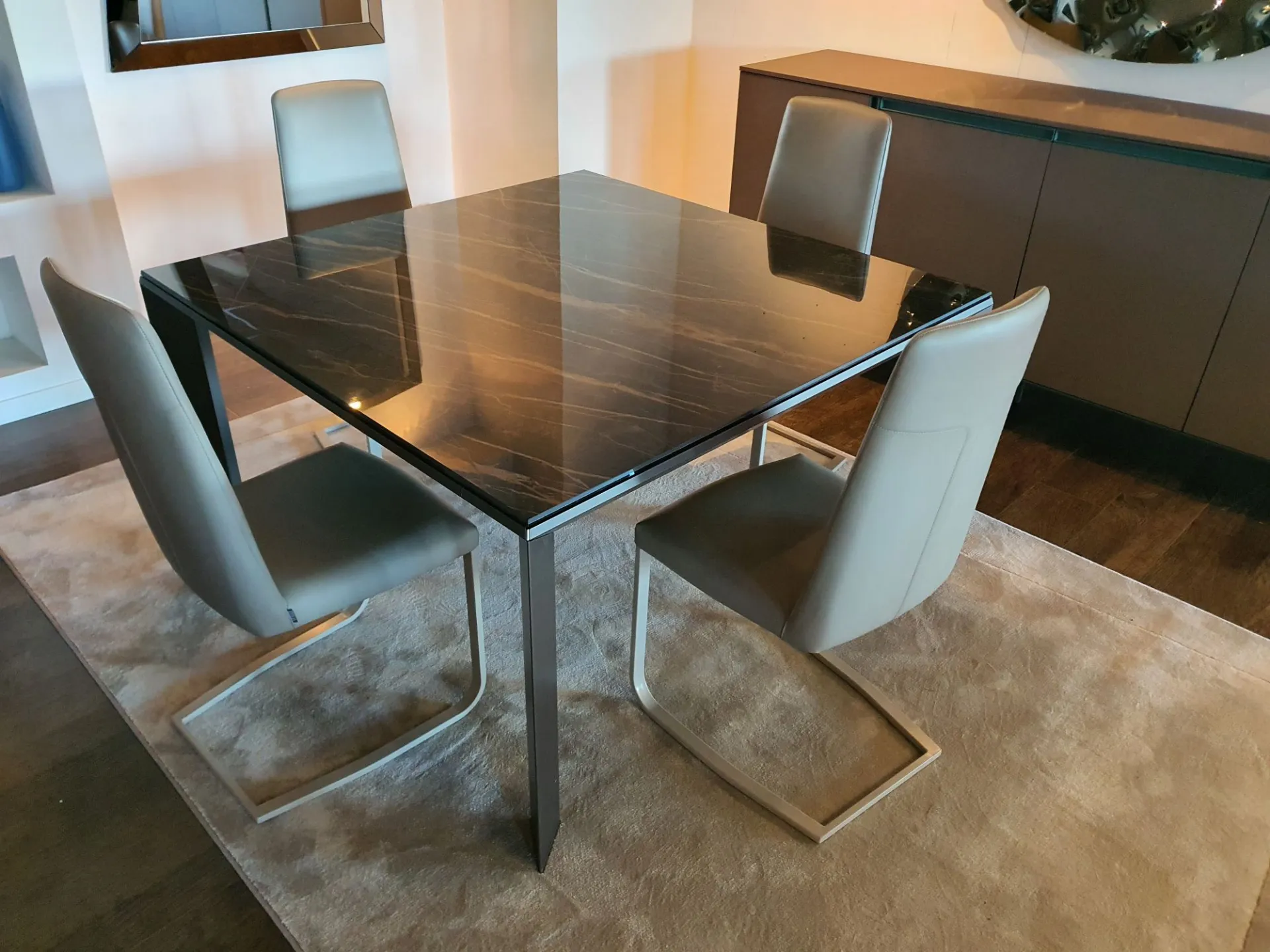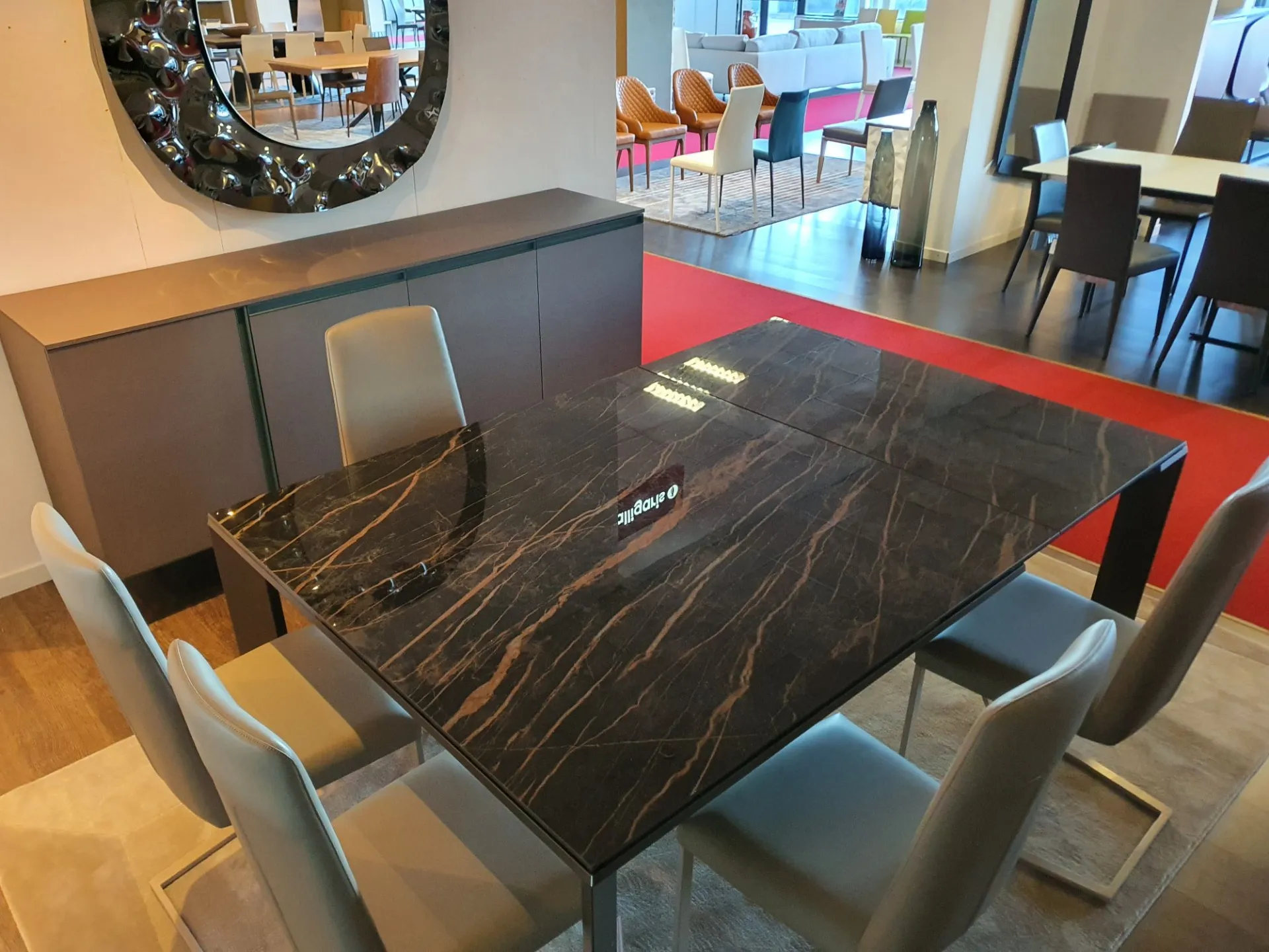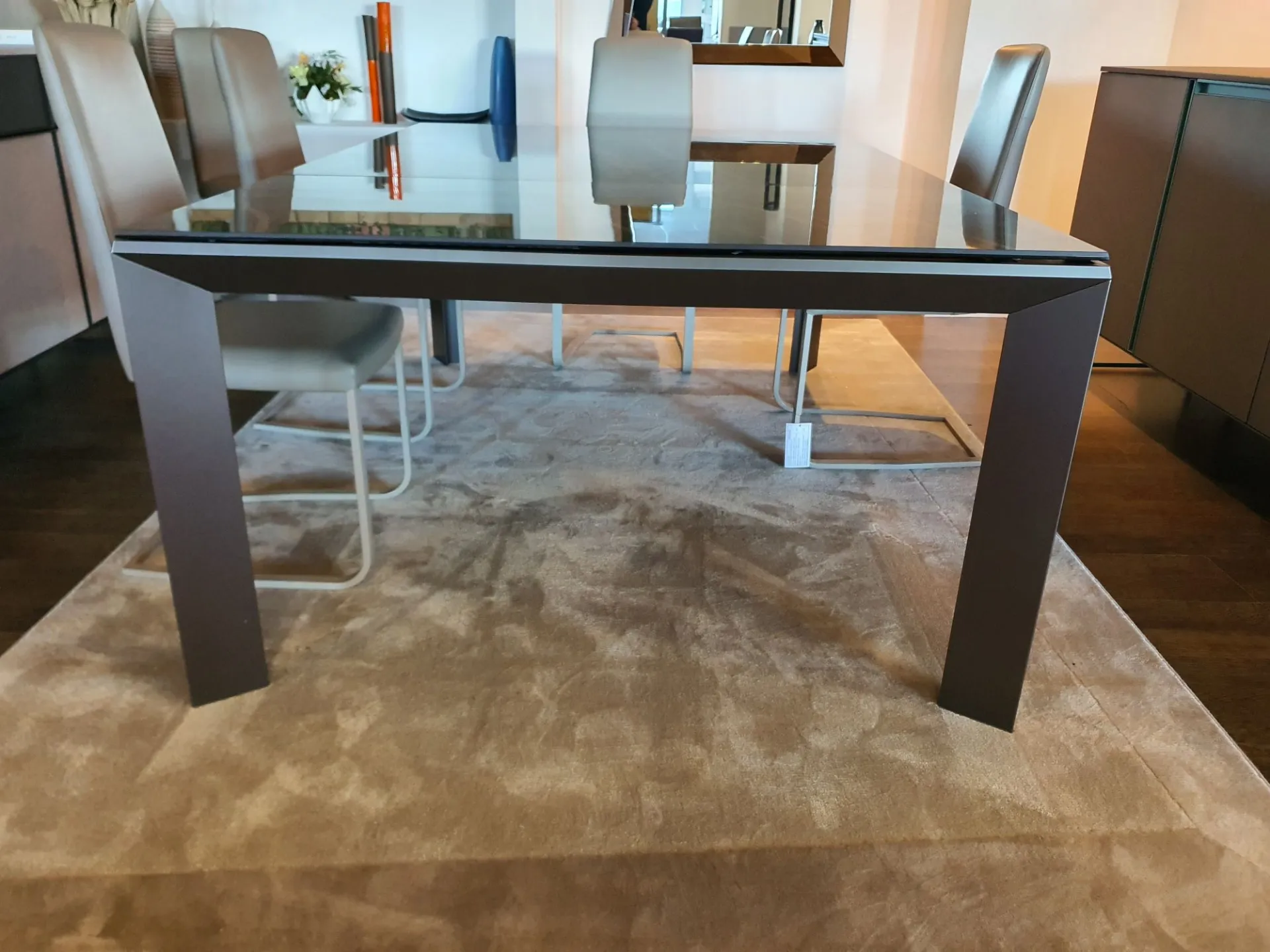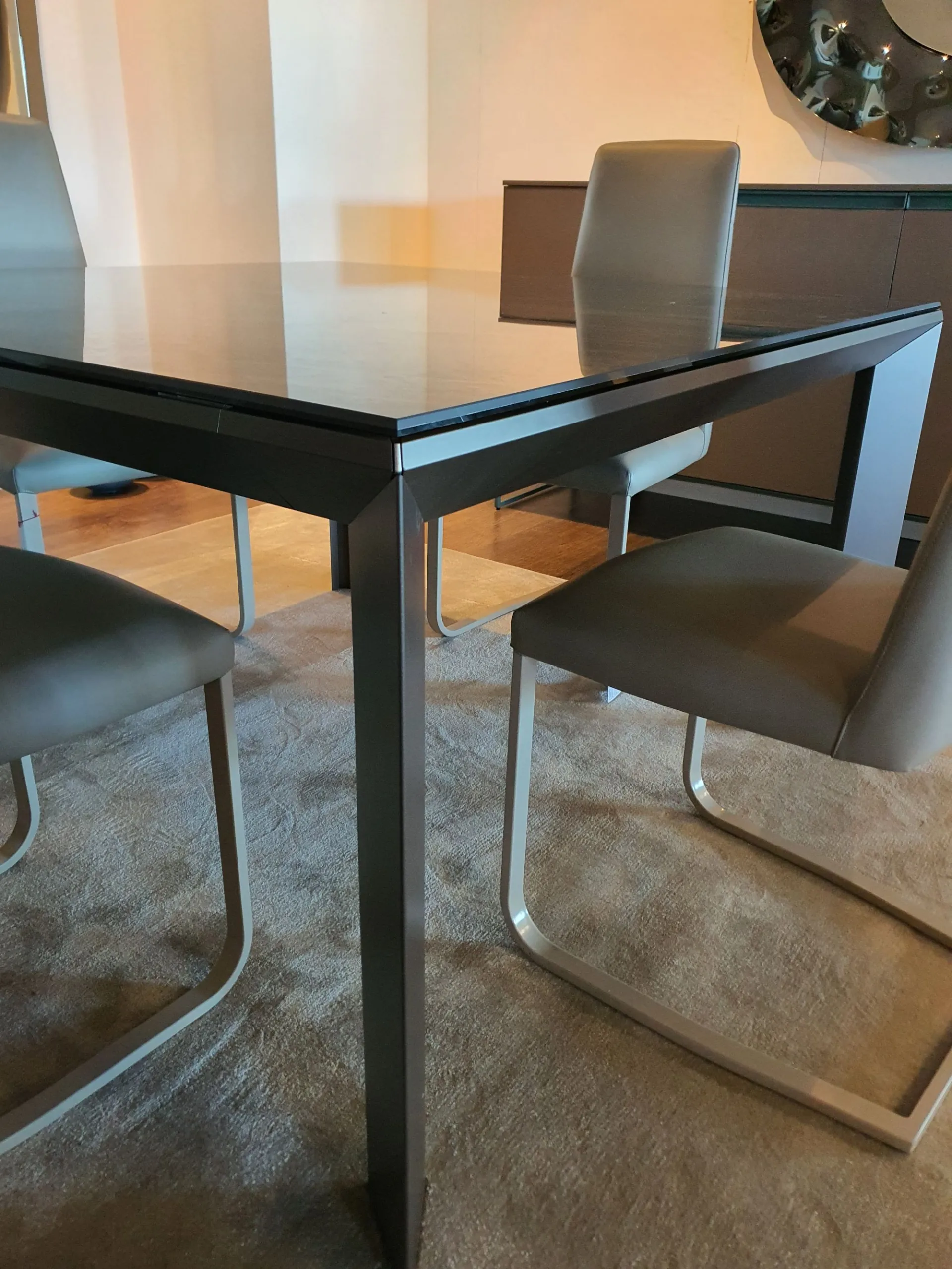 Tavolo allungabile mod.Metrò in estruso di alluminio con piano in ceramica lucida emperador e gambe in metallo colore bronzo