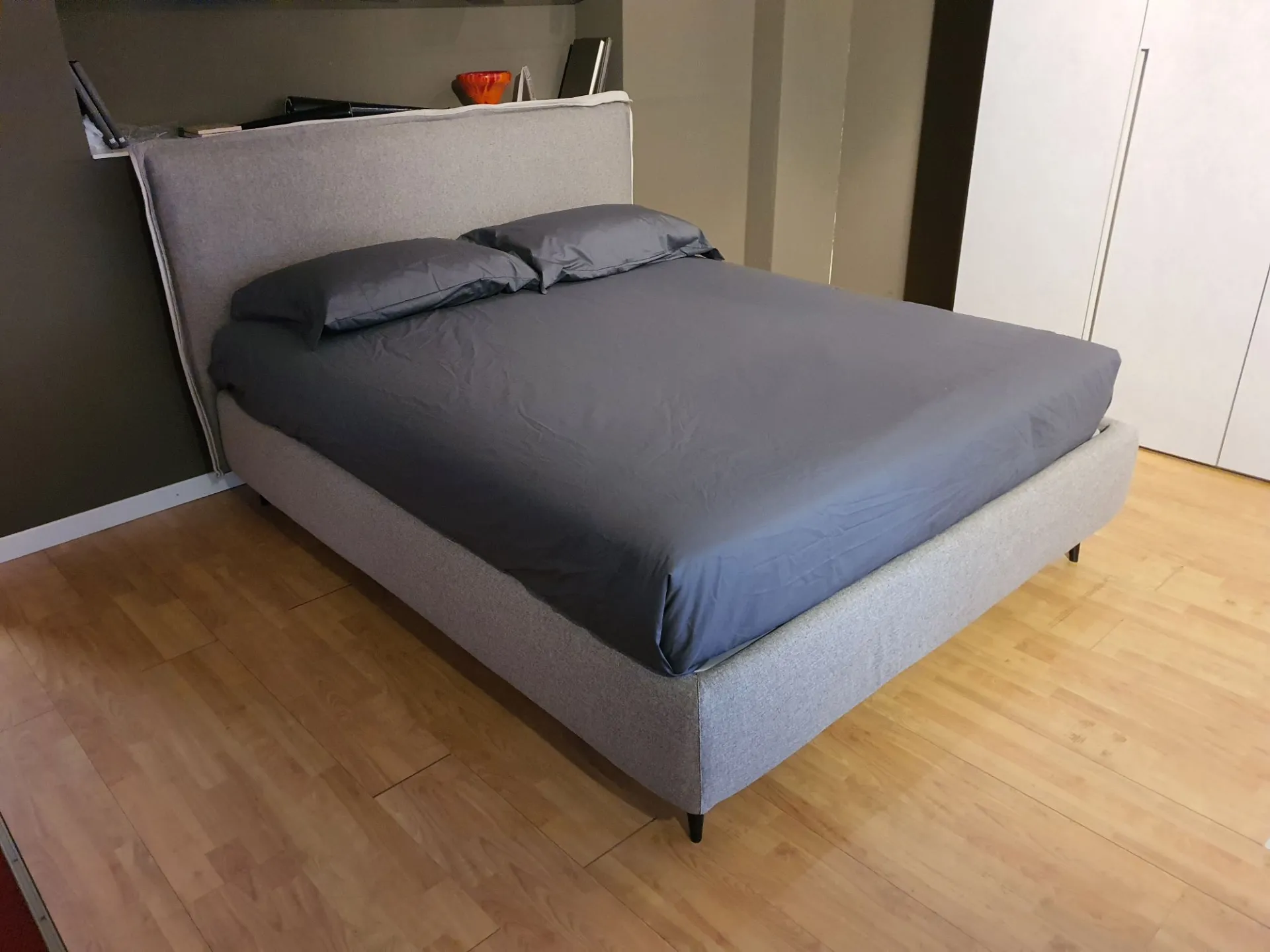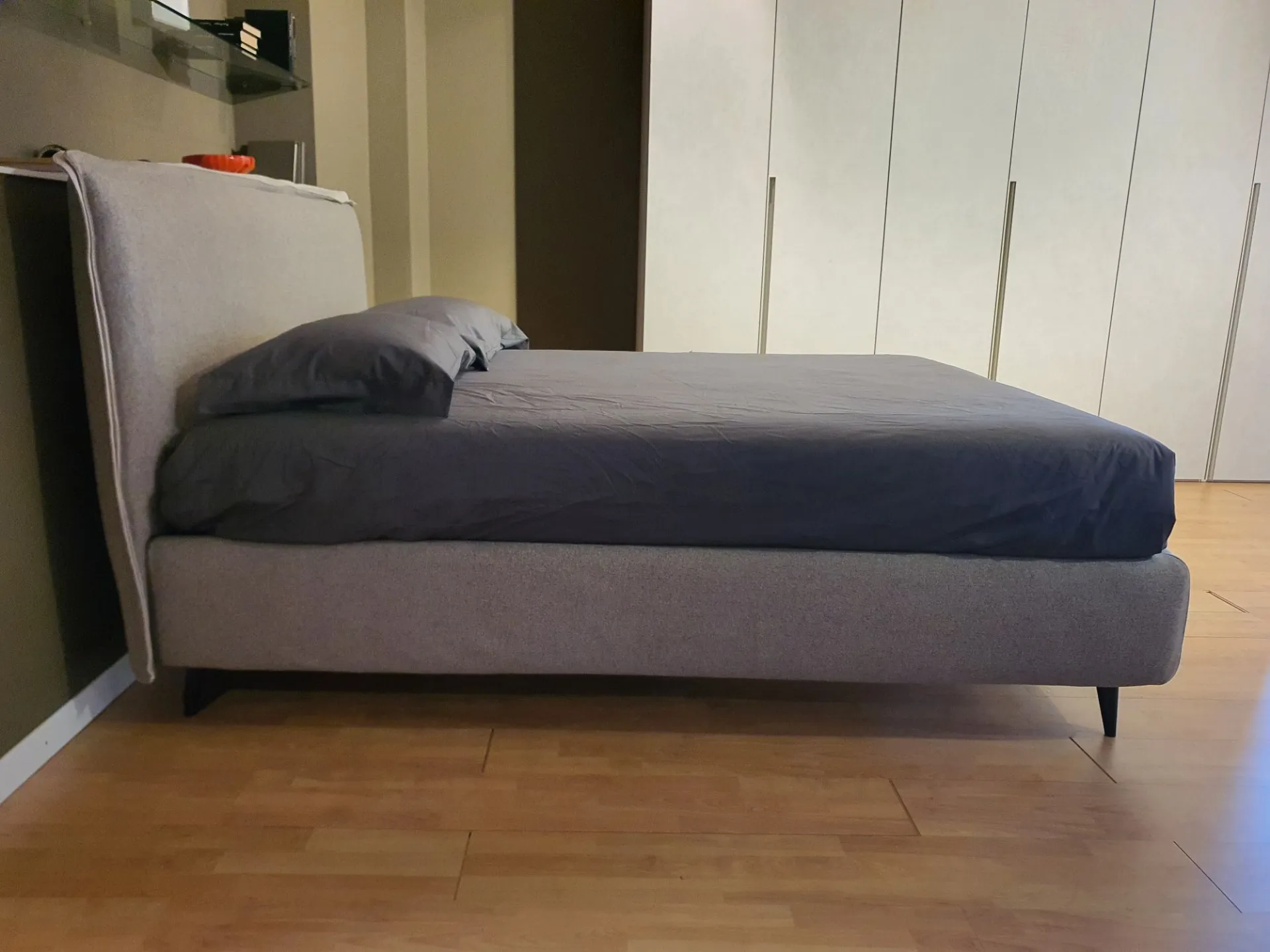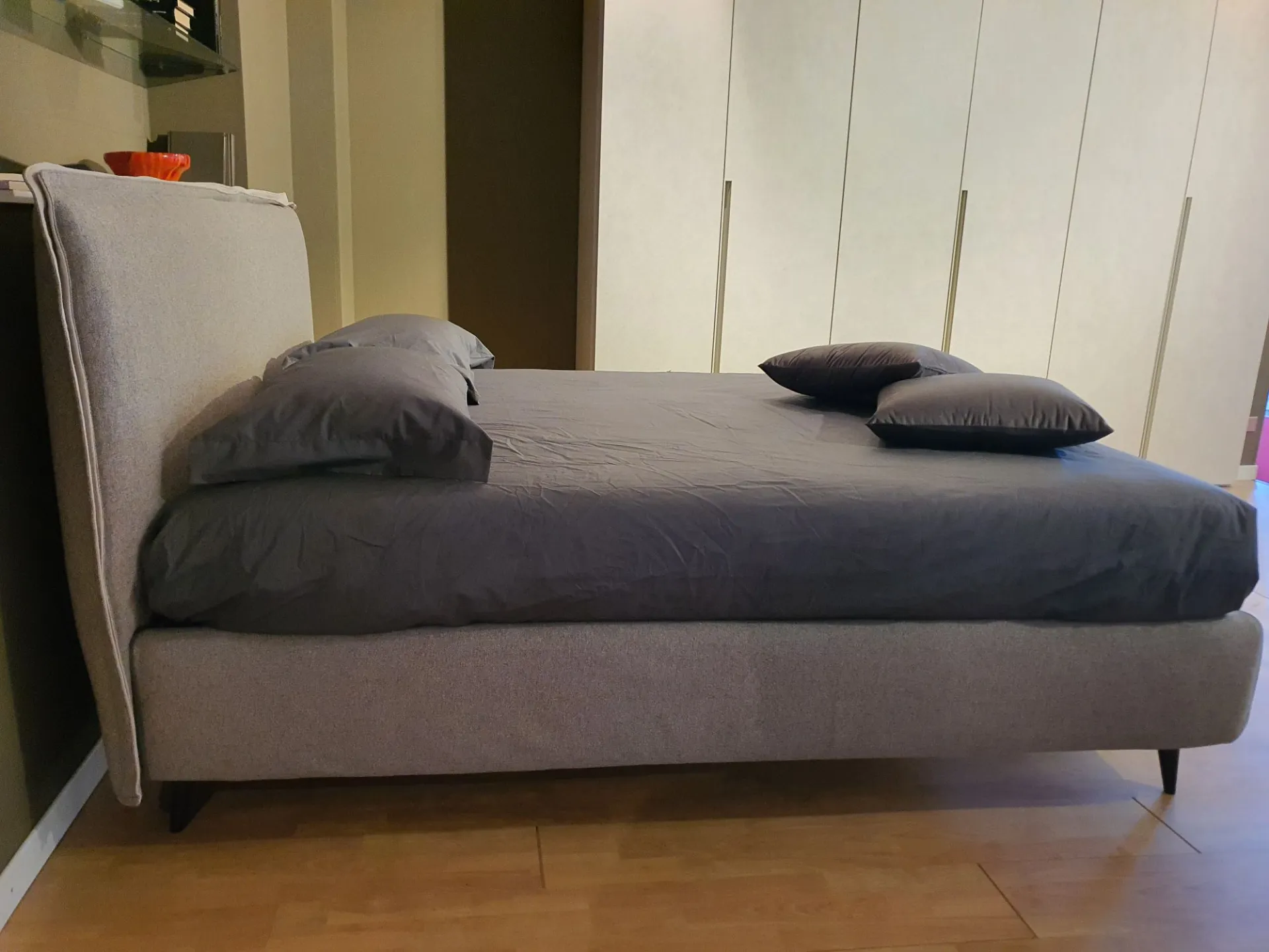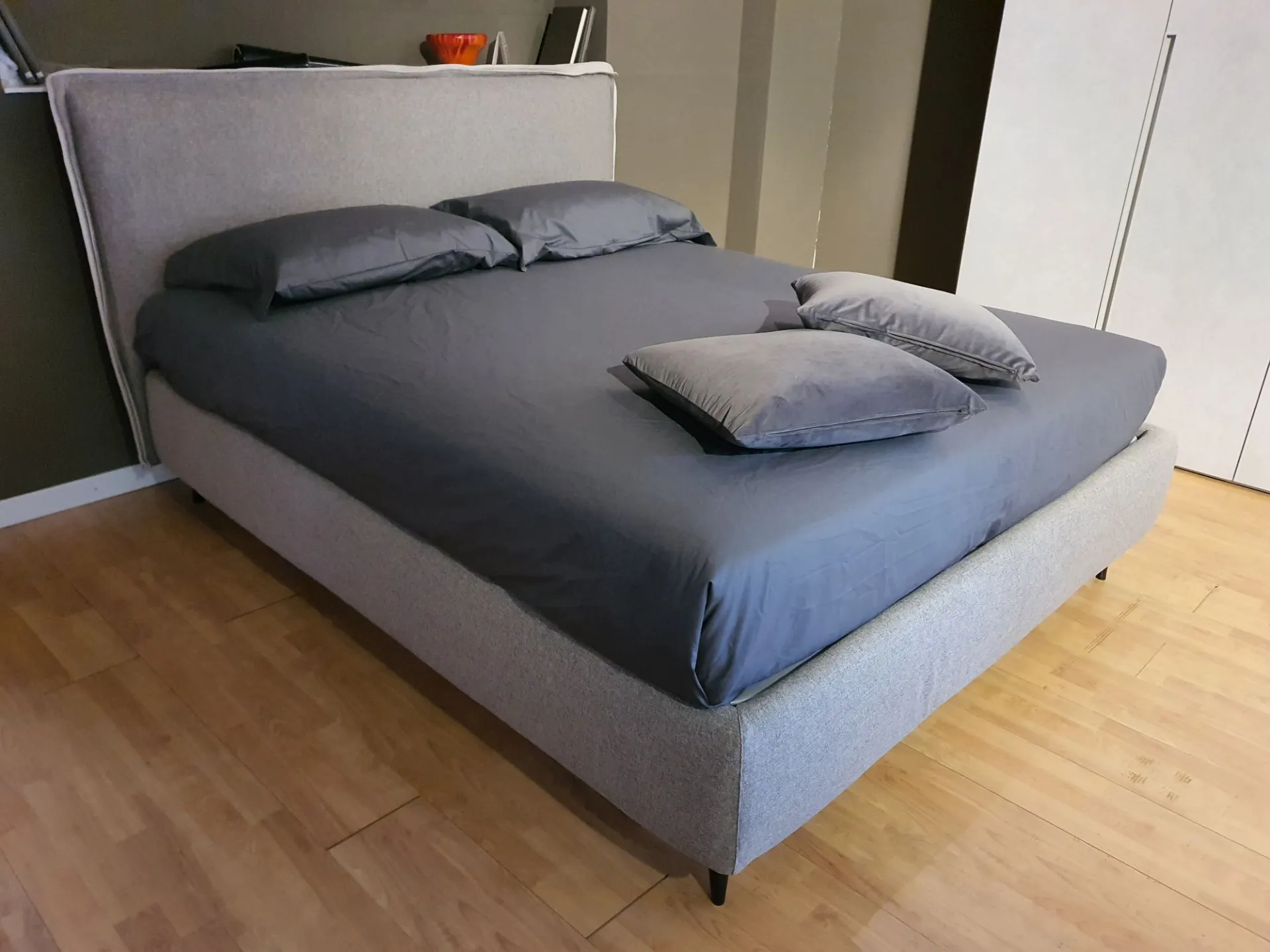 Il letto è sollevato dal pavimento grazie ai piedini mod.Obliquo Legno h.15 finitura wengè. Il rivestimento è in tessuto sfoderabile colore grigio con bordino in tessuto beige chiaro