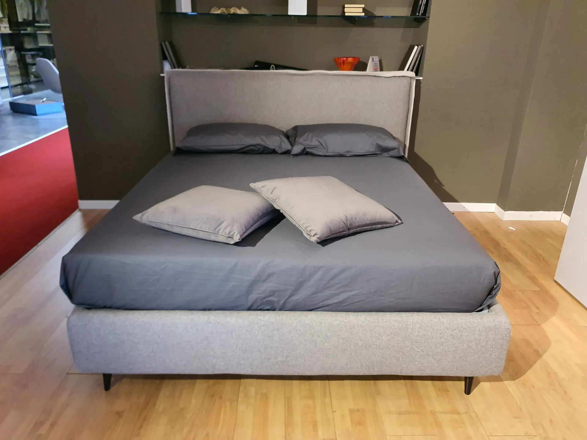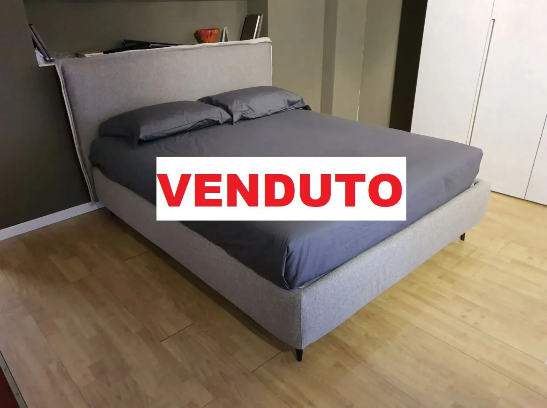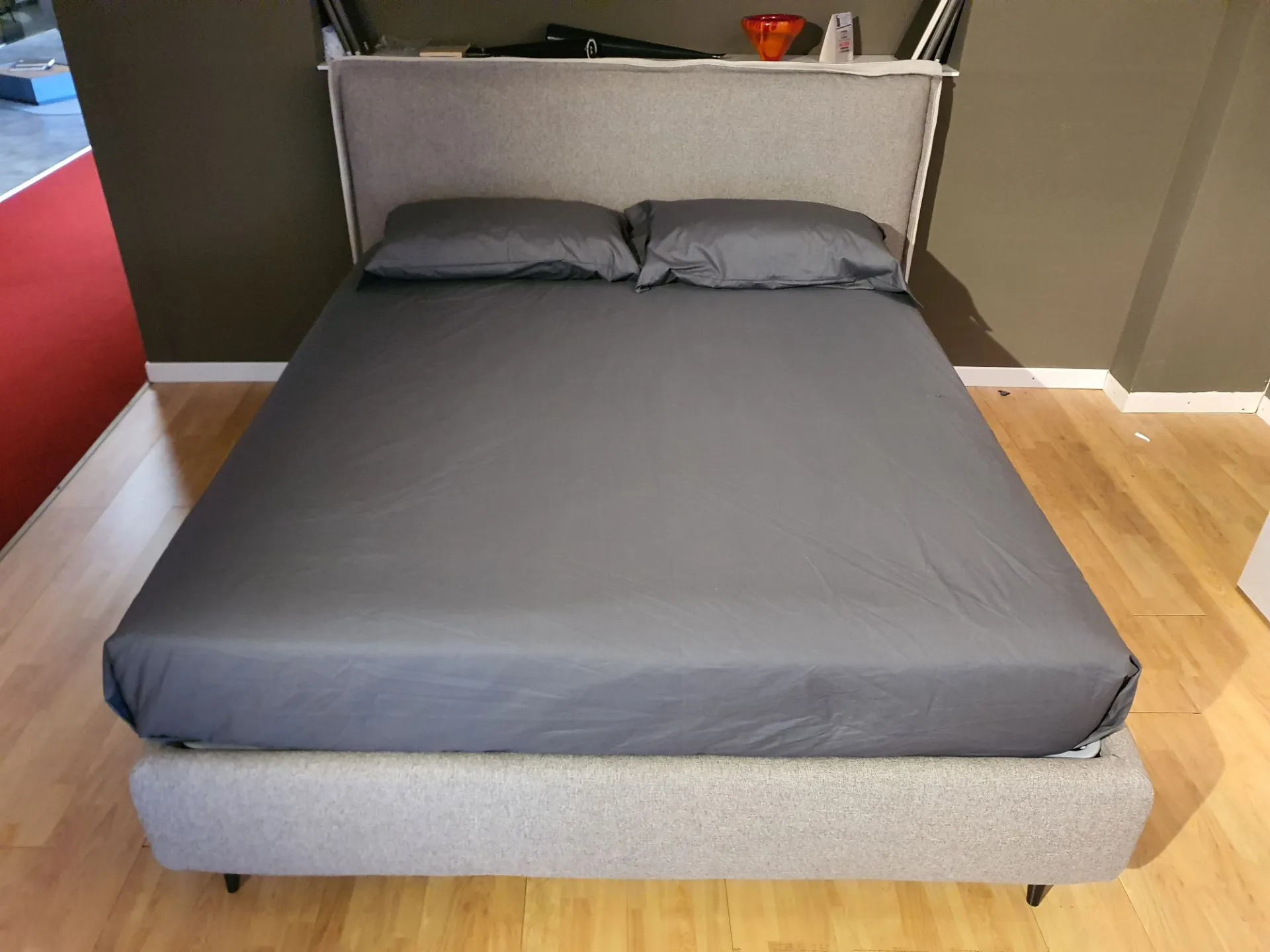 Il letto è sollevato dal pavimento grazie ai piedini mod.Obliquo Legno h.15 finitura wengè. Il rivestimento è in tessuto sfoderabile colore grigio con bordino in tessuto beige chiaro
