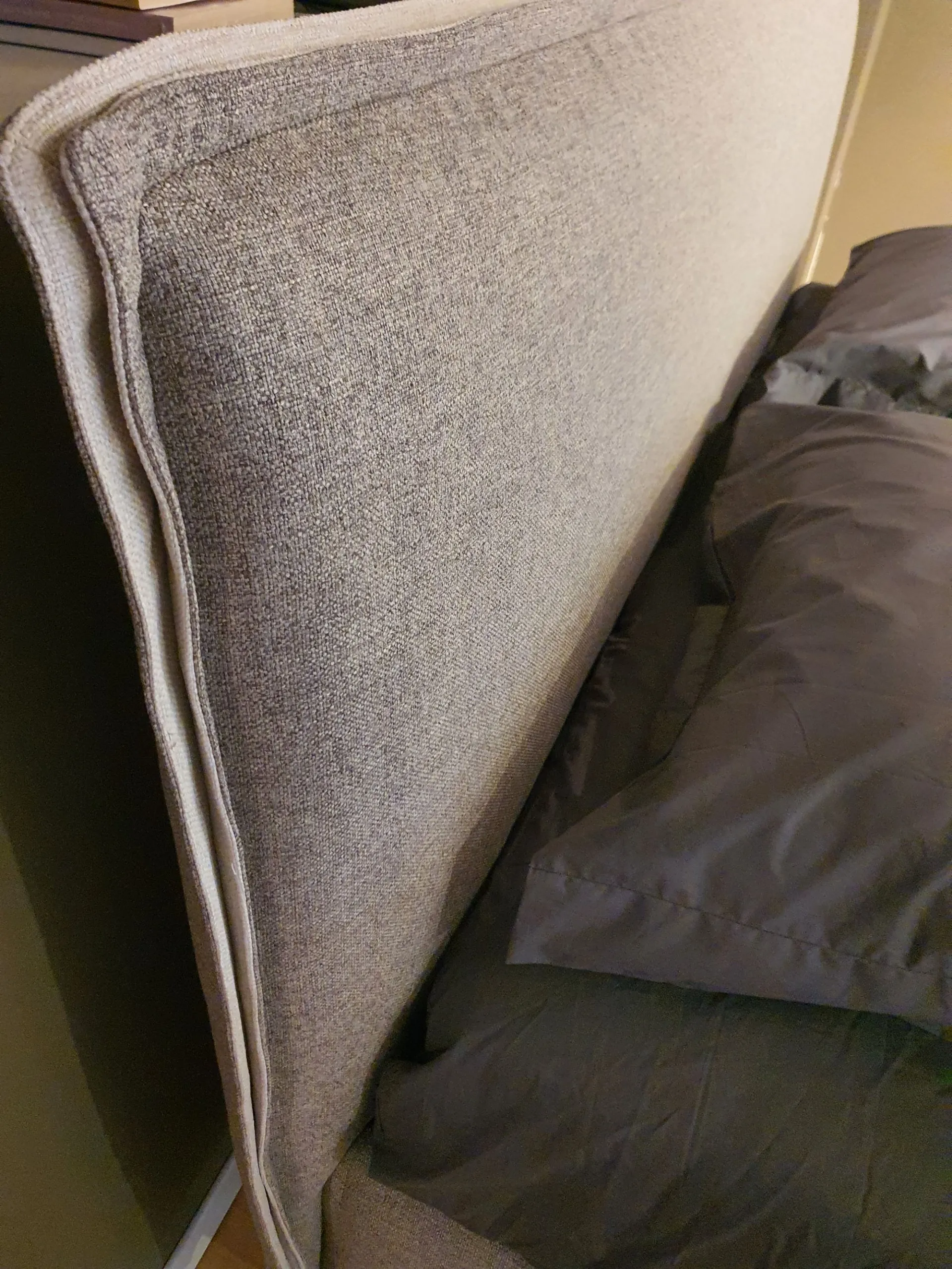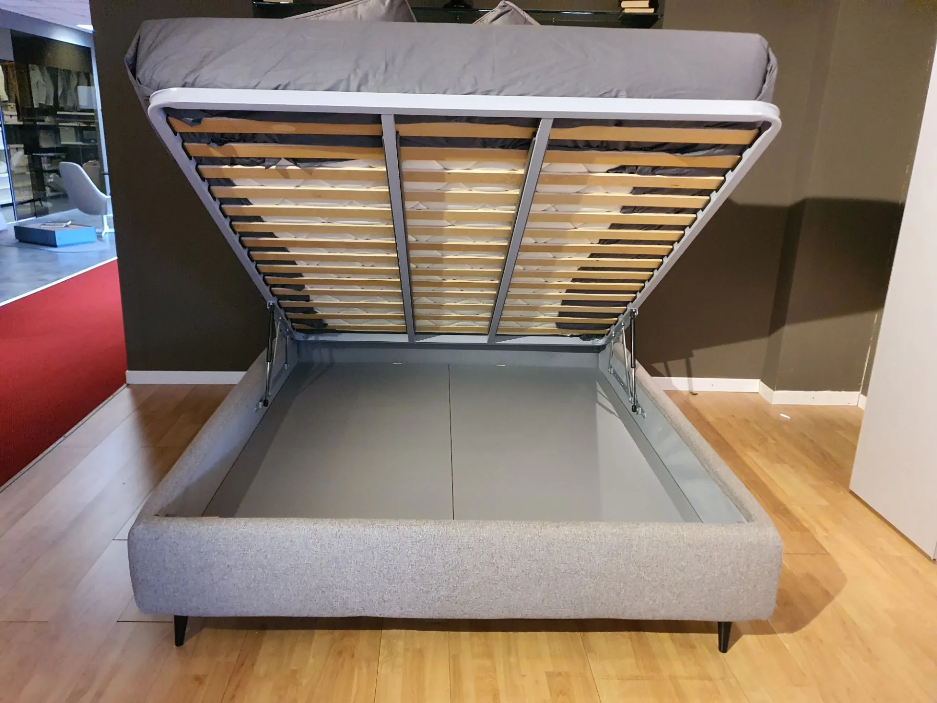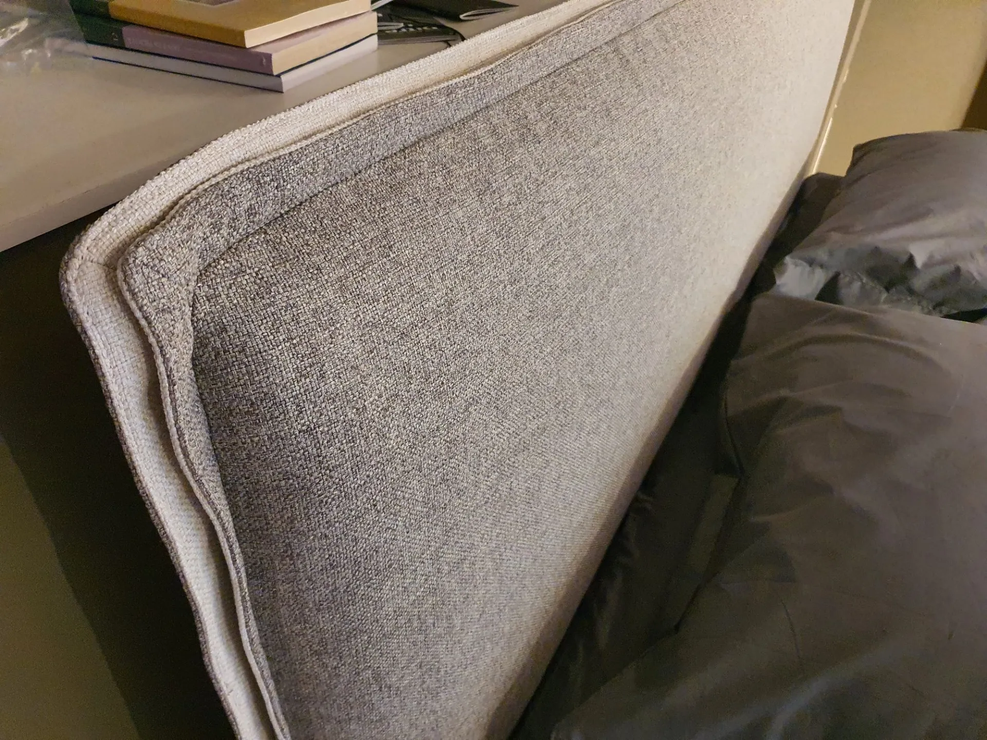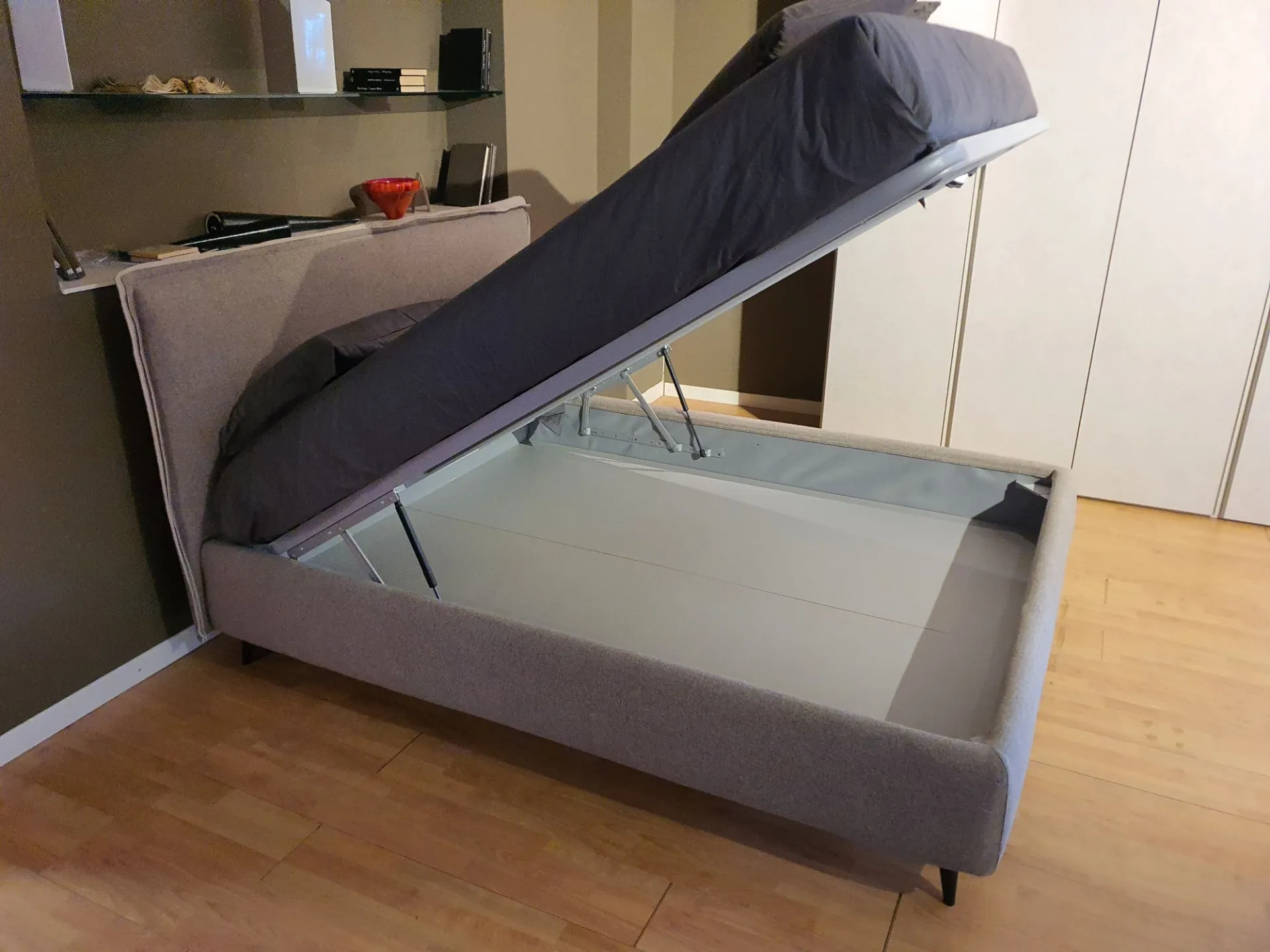 Il letto è sollevato dal pavimento grazie ai piedini mod.Obliquo Legno h.15 finitura wengè. Il rivestimento è in tessuto sfoderabile colore grigio con bordino in tessuto beige chiaro