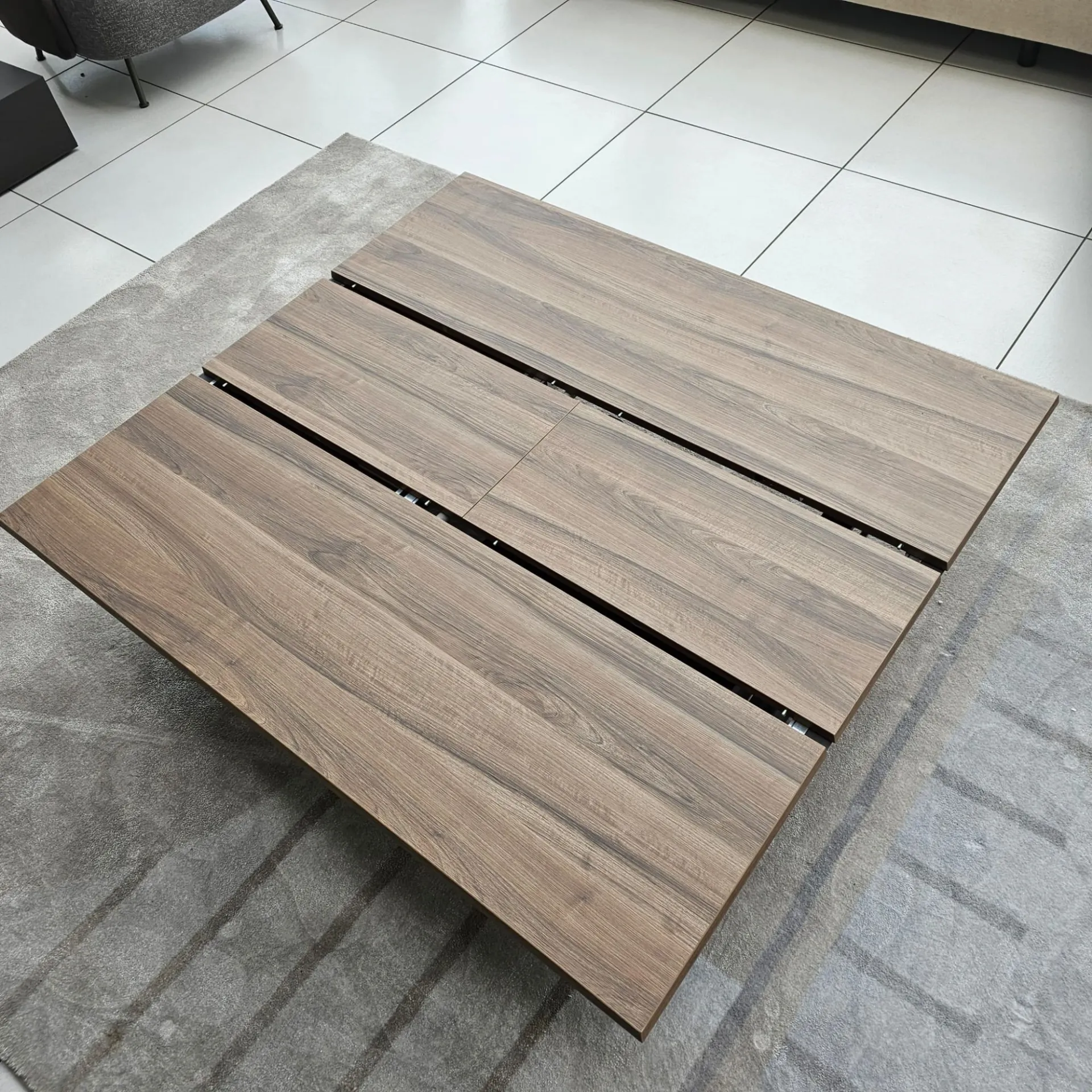 Tavolo Trasformabile MORE & MORE allungabile e allargabile, alzata con pistone a gas e ruote, meccanismo di allungamento in alluminio, piano in ecolegno canaletto, base in metallo bronzo.
