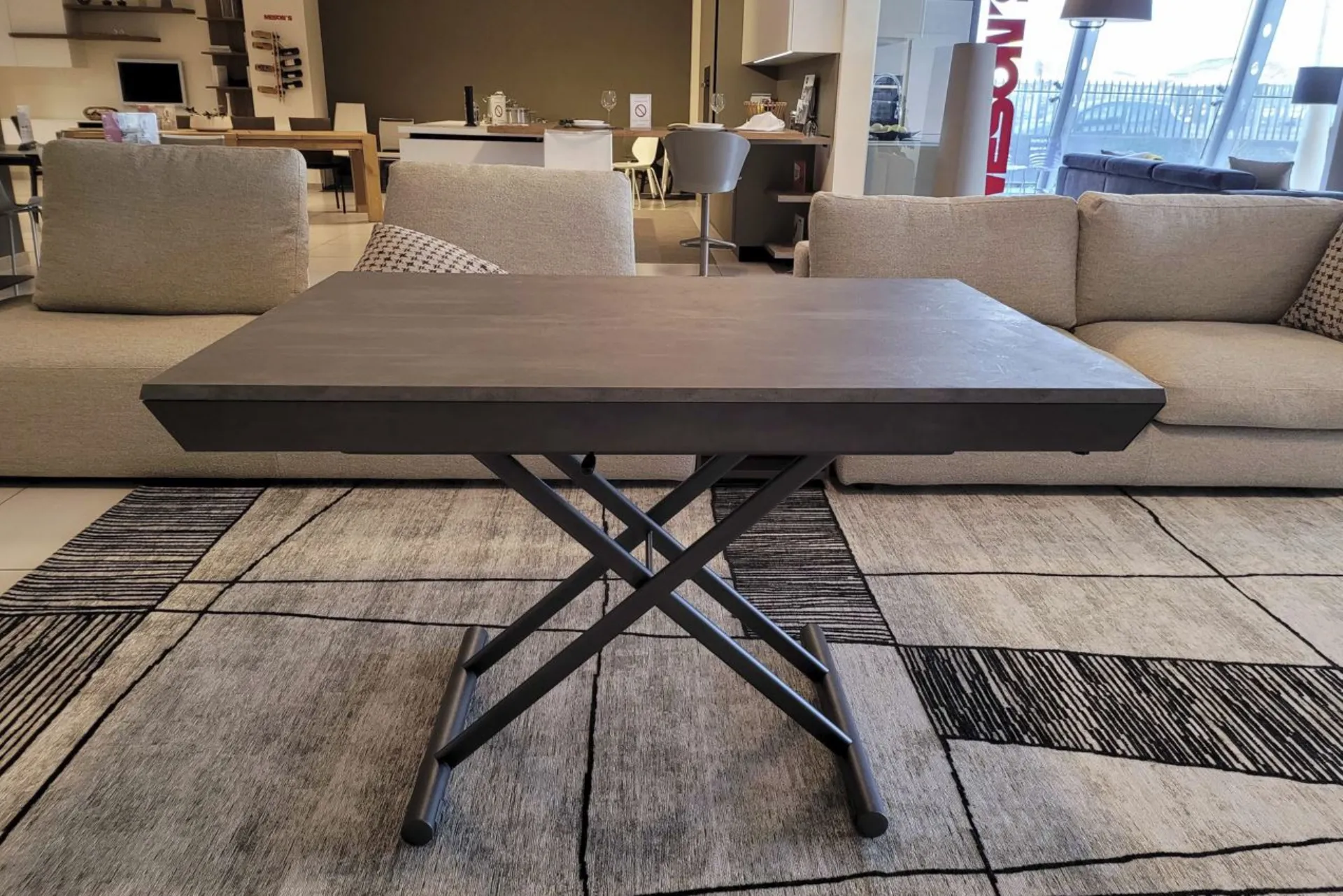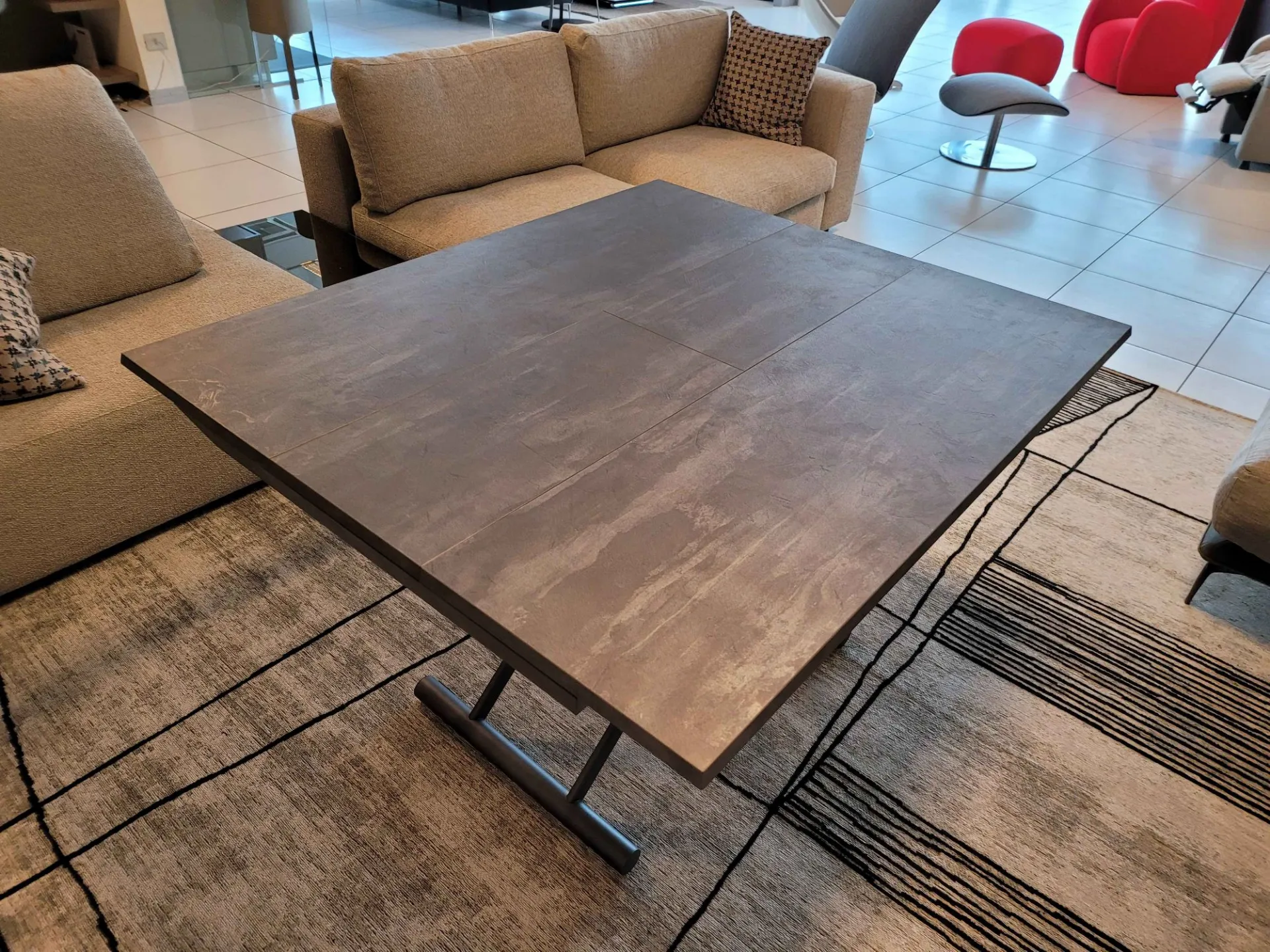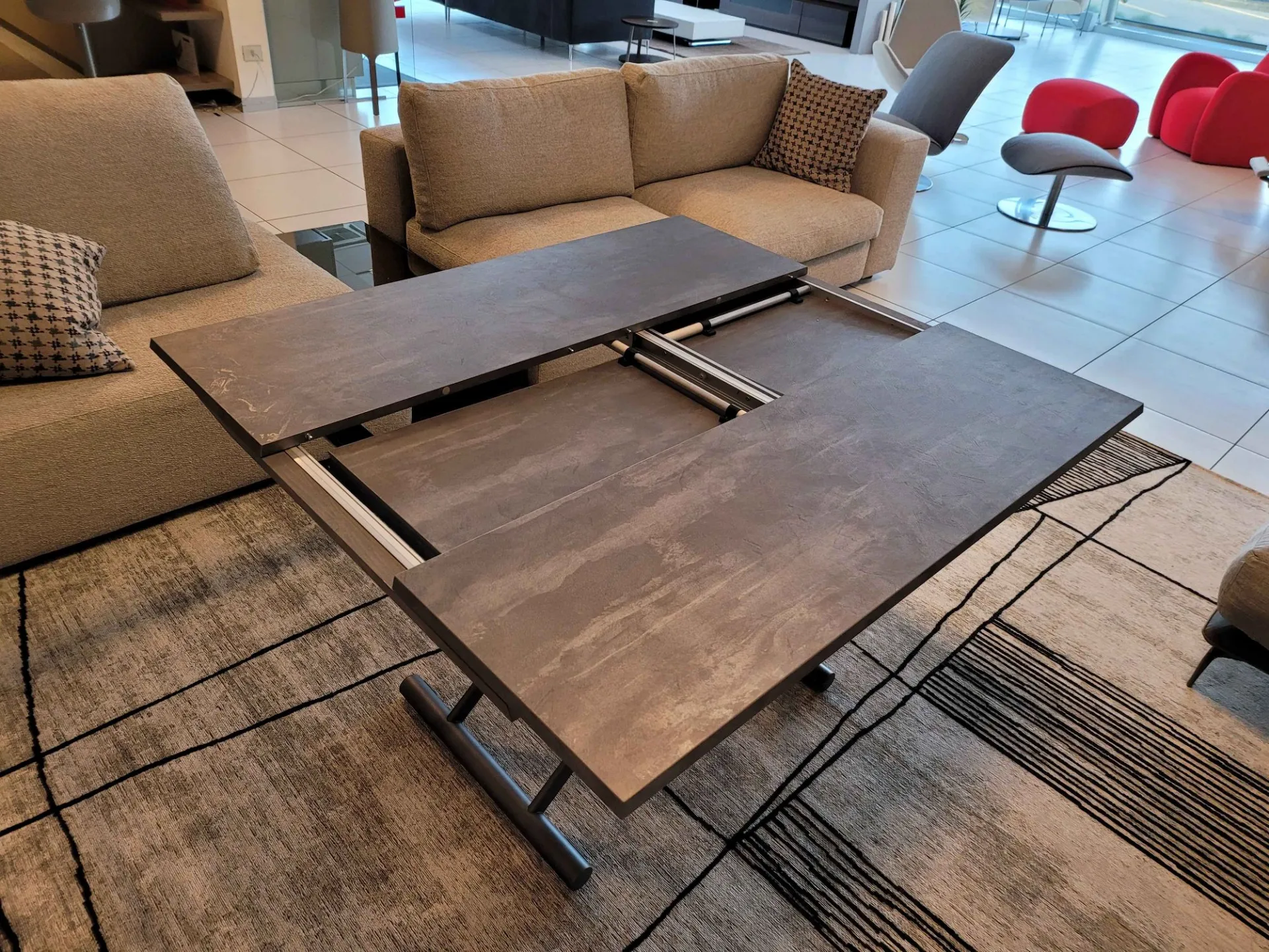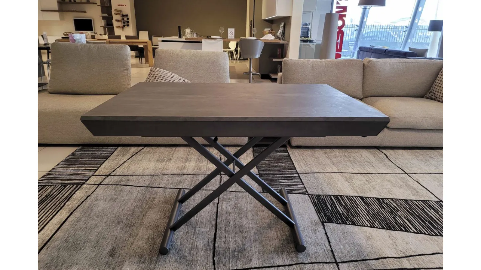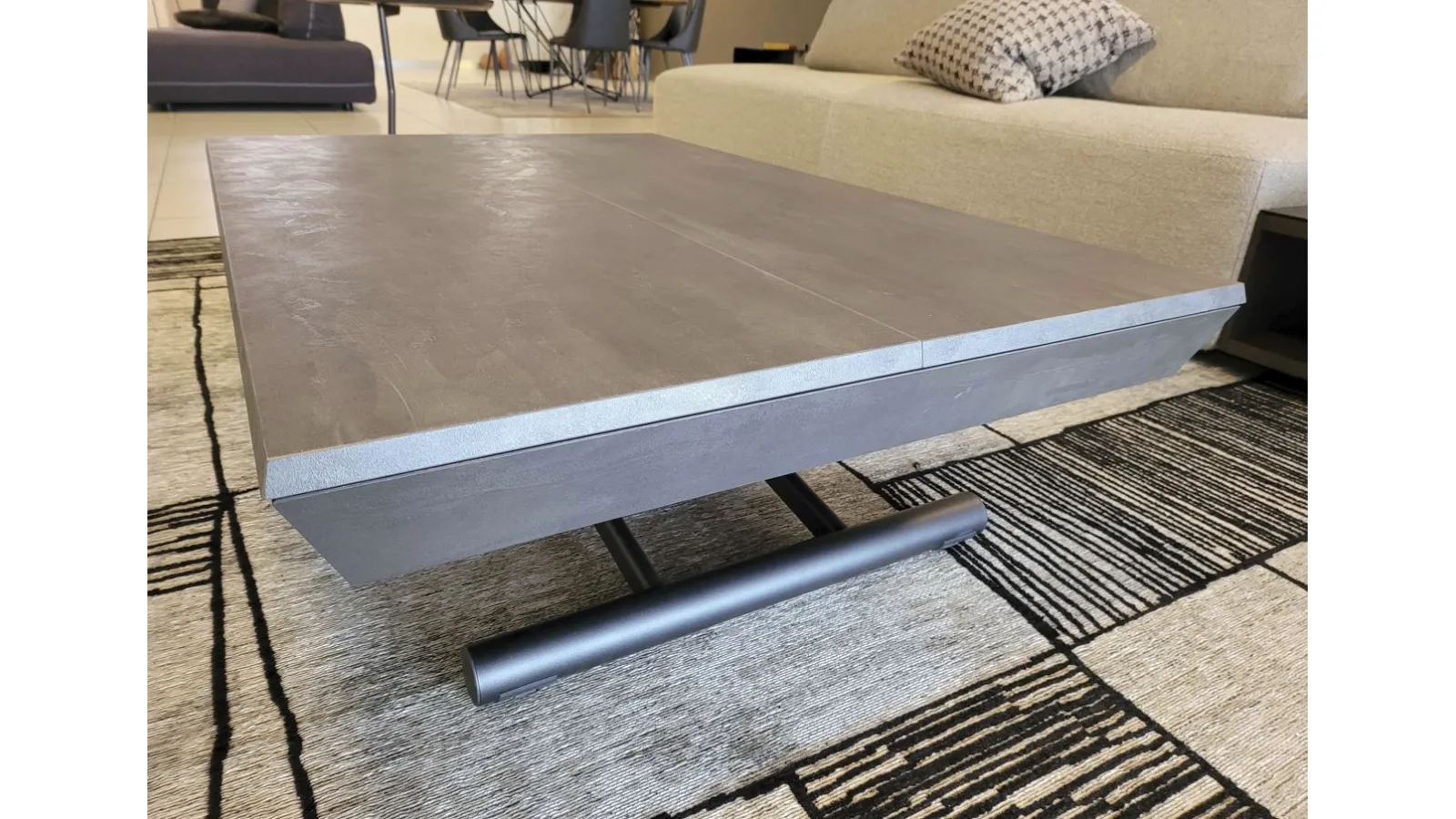 Bellissimo tavolino trasformabile mod.MORE&MORE dalle caratteristiche uniche! E’ infatti alzabile, allungabile ed allargabile grazie alle allunghe interne. Dotato di ruote e alzata con pistone a gas. Regolabile in tutte le altezze al millimetro, per cui l’altezza non è fissa e può essere regolata a piacere. Piano e allunghe (19mm) in eco legno struttura in metallo verniciato. Meccanismo di allungamento in alluminio di primissima qualità! La sua misura da chiuso è di cm L.125xP.80xH.35, da aperto misura cm L.110xP.125xH.93 e da completamente aperto misura cm L.110xP.168, ottenendo così fino a 10 posti! Le gambe sono sottili ma al contempo robuste e solide in metallo verniciato colore antracite. Il piano è in ecolegno spatolato finitura Pietra