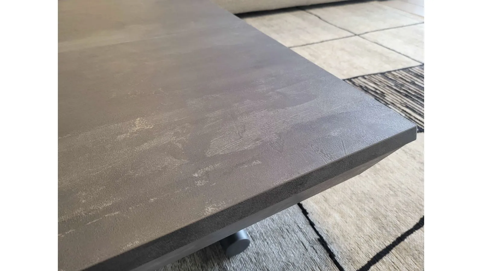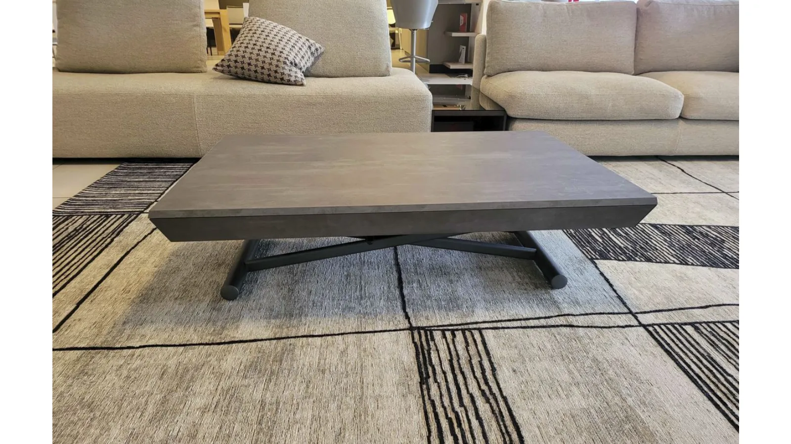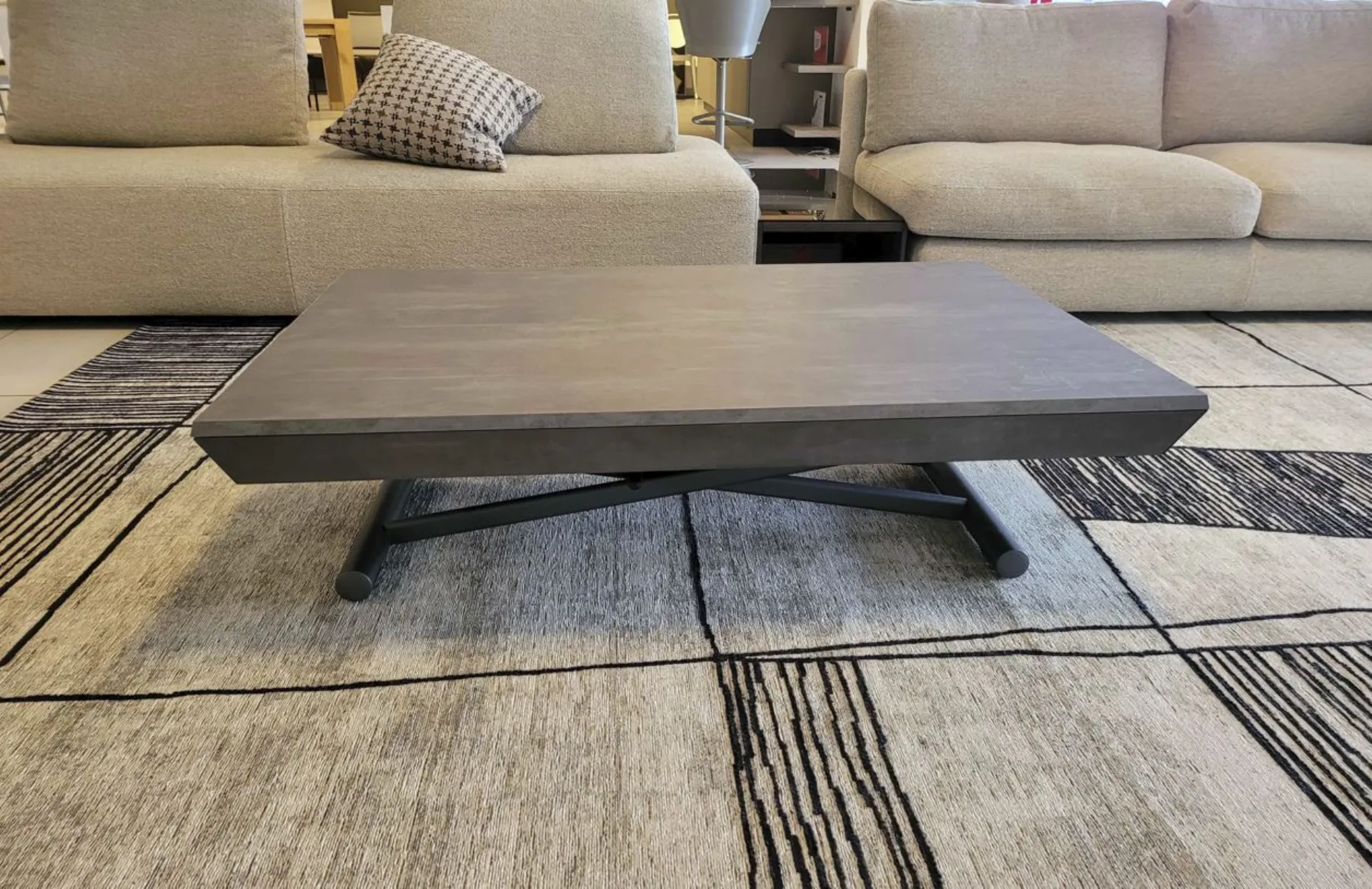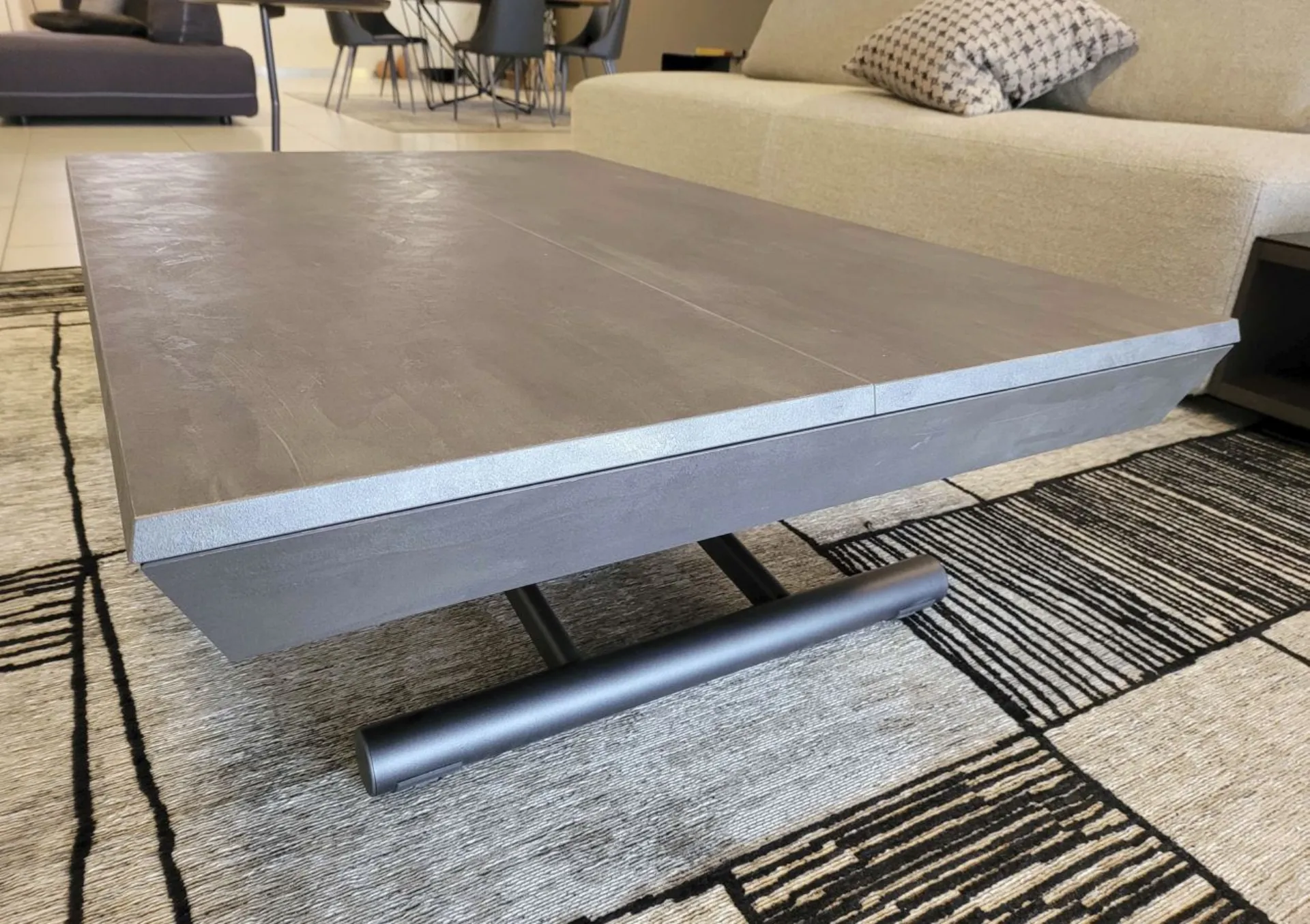 Bellissimo tavolino trasformabile mod.MORE&MORE dalle caratteristiche uniche! E’ infatti alzabile, allungabile ed allargabile grazie alle allunghe interne. Dotato di ruote e alzata con pistone a gas. Regolabile in tutte le altezze al millimetro, per cui l’altezza non è fissa e può essere regolata a piacere. Piano e allunghe (19mm) in eco legno struttura in metallo verniciato. Meccanismo di allungamento in alluminio di primissima qualità! La sua misura da chiuso è di cm L.125xP.80xH.35, da aperto misura cm L.110xP.125xH.93 e da completamente aperto misura cm L.110xP.168, ottenendo così fino a 10 posti! Le gambe sono sottili ma al contempo robuste e solide in metallo verniciato colore antracite. Il piano è in ecolegno spatolato finitura Pietra