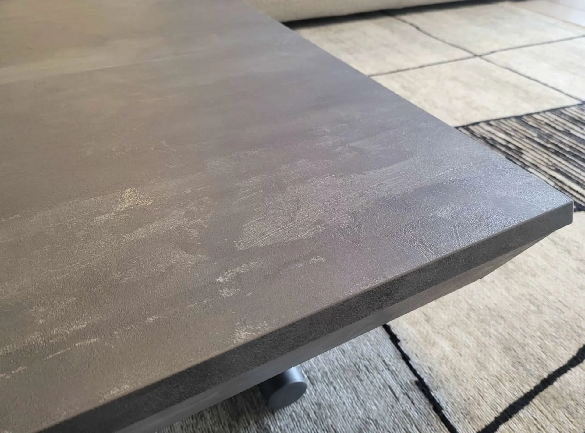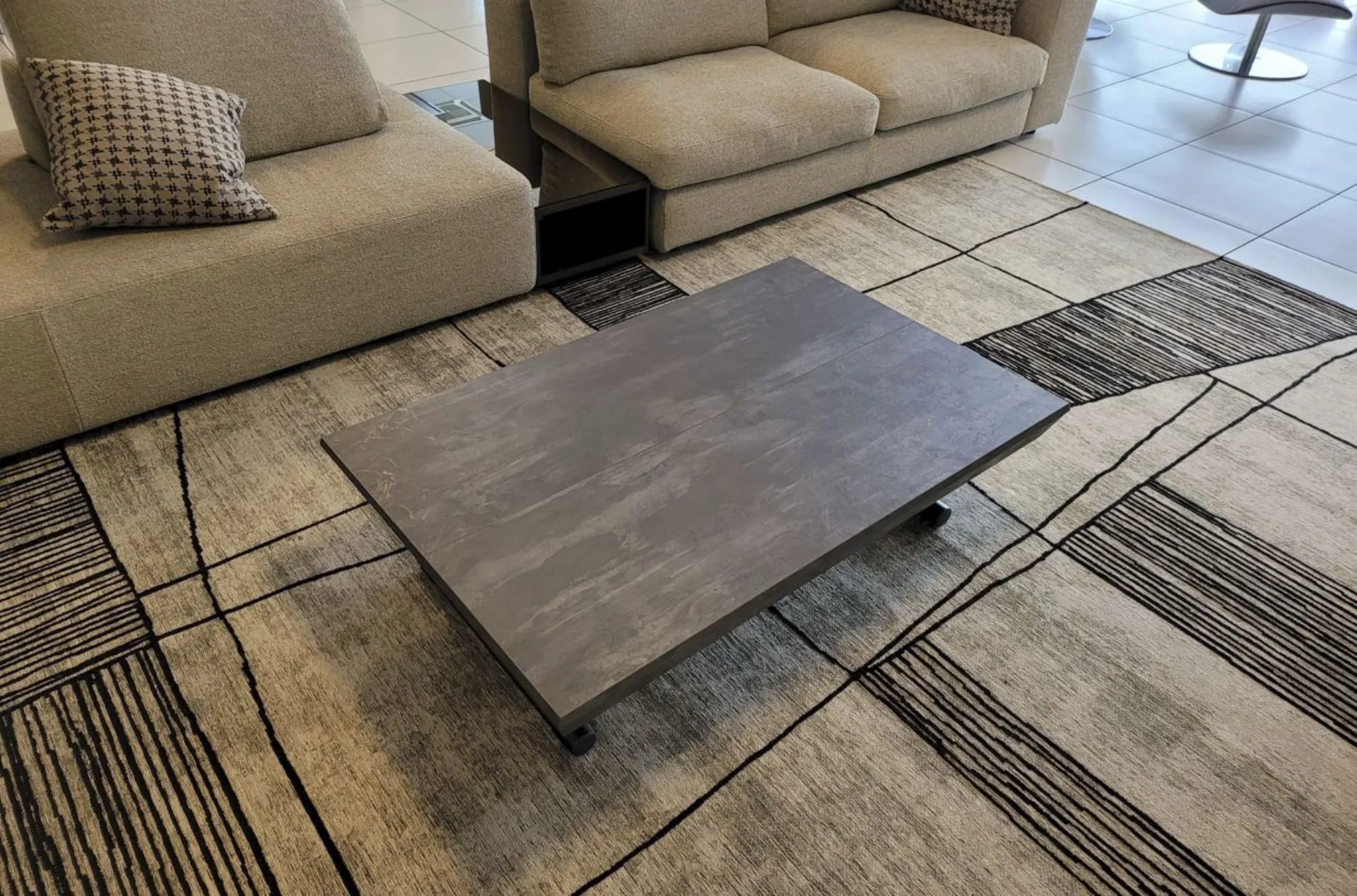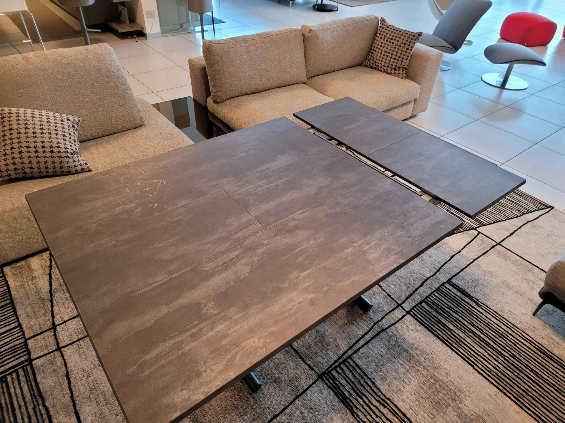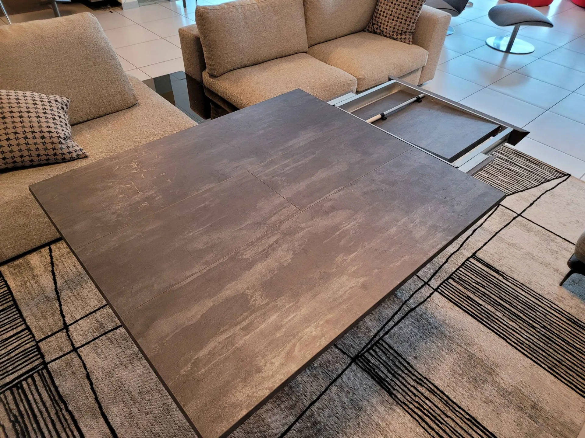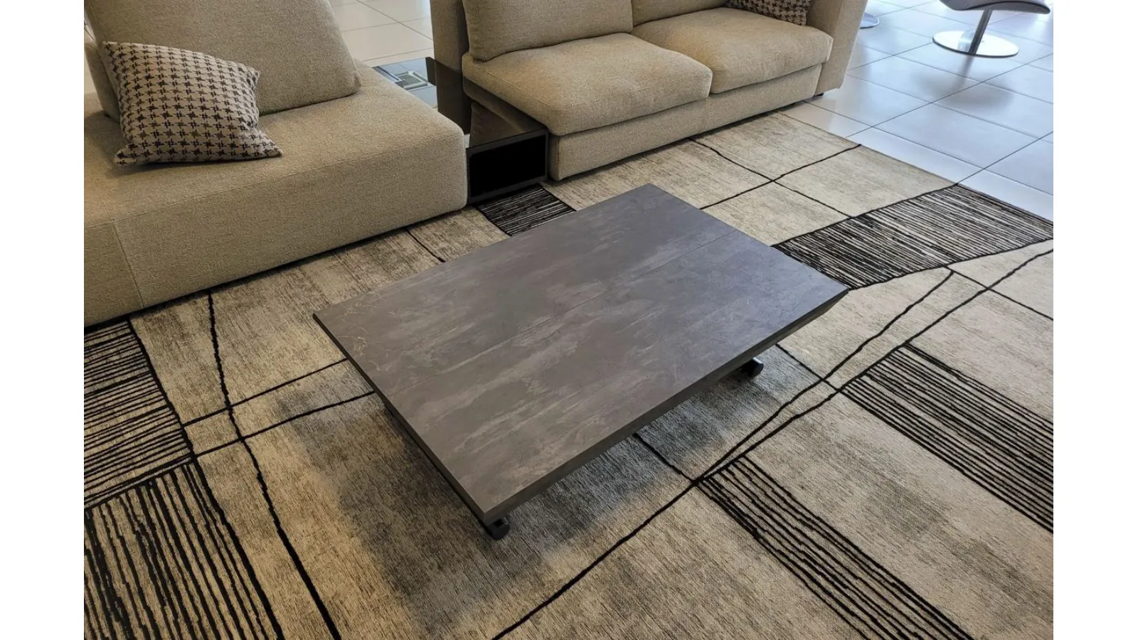 Bellissimo tavolino trasformabile mod.MORE&MORE dalle caratteristiche uniche! E’ infatti alzabile, allungabile ed allargabile grazie alle allunghe interne. Dotato di ruote e alzata con pistone a gas. Regolabile in tutte le altezze al millimetro, per cui l’altezza non è fissa e può essere regolata a piacere. Piano e allunghe (19mm) in eco legno struttura in metallo verniciato. Meccanismo di allungamento in alluminio di primissima qualità! La sua misura da chiuso è di cm L.125xP.80xH.35, da aperto misura cm L.110xP.125xH.93 e da completamente aperto misura cm L.110xP.168, ottenendo così fino a 10 posti! Le gambe sono sottili ma al contempo robuste e solide in metallo verniciato colore antracite. Il piano è in ecolegno spatolato finitura Pietra