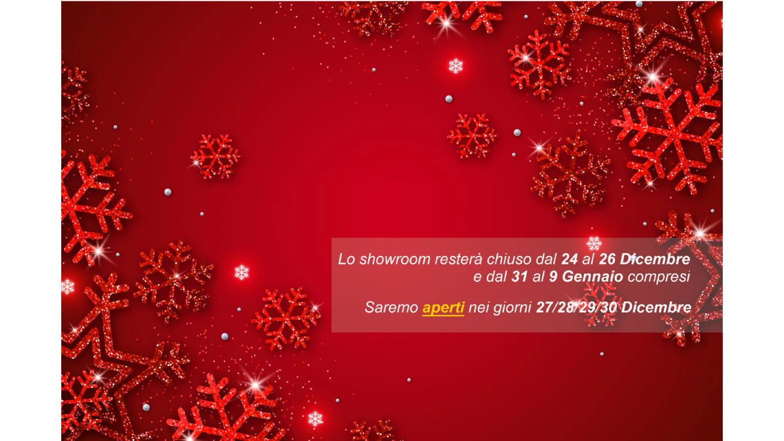 In occasione delle Festività Natalizie, dal 24 al 26 Dicembre 2021 e dal 31 al 9 Gennaio 2022, il nostro showroom resterà chiuso