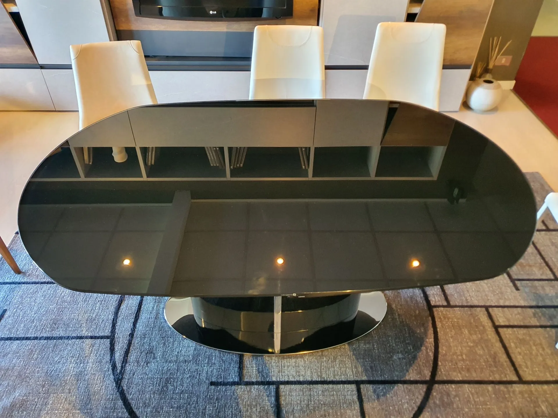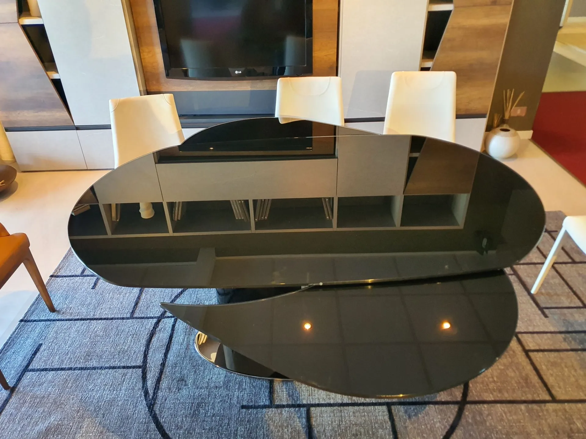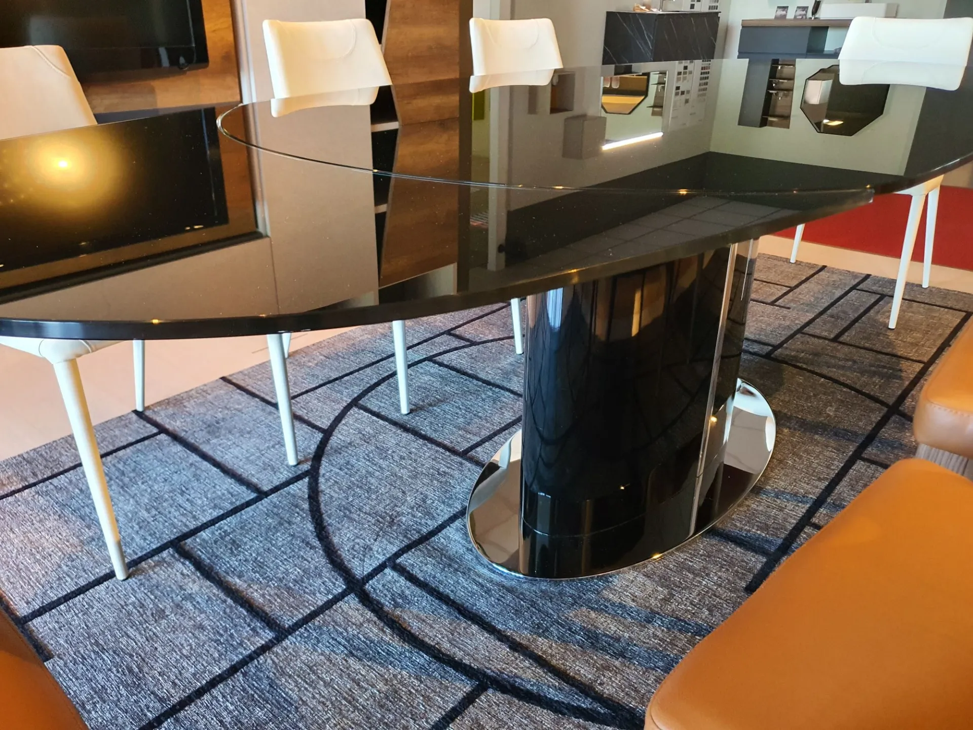 Tavolo allungabile mod.ODYSSEY con piano in vetro serigrafato nero coprente, basamento in laccato lucido colore nero e dettagli in metallo cromato