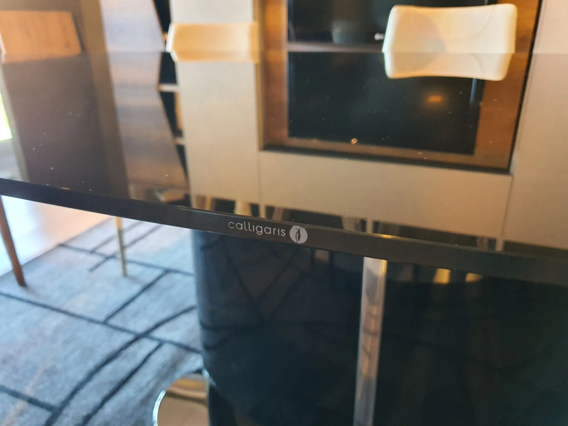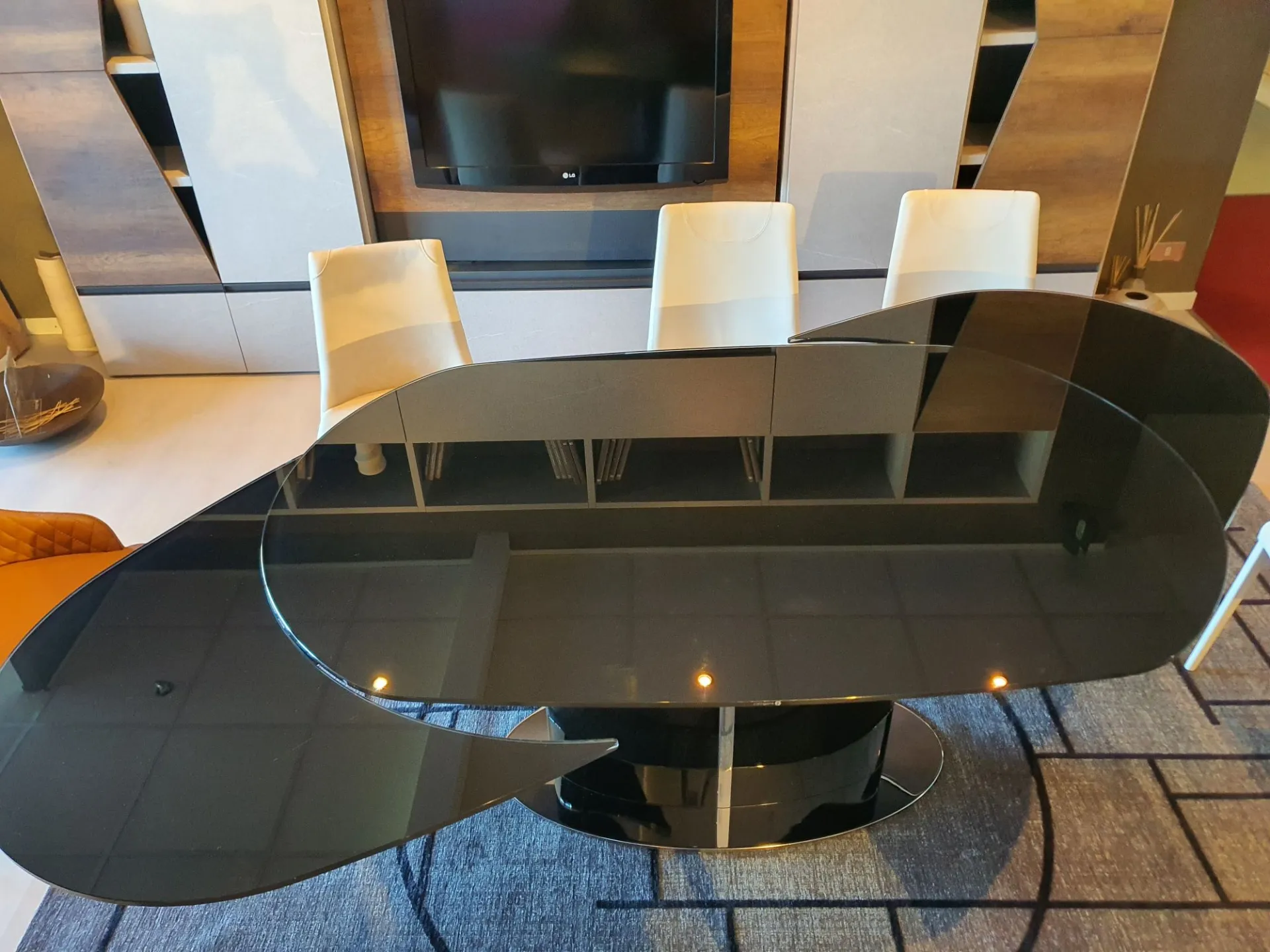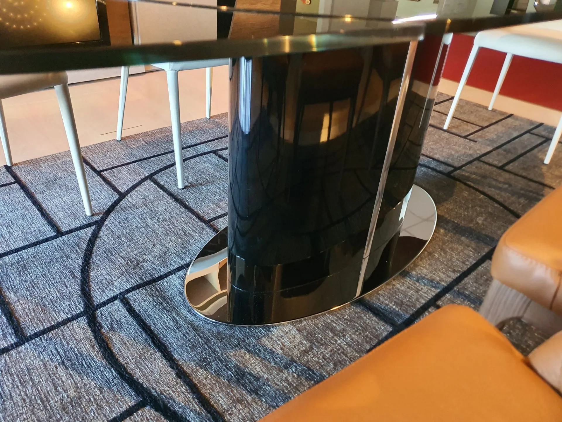 Tavolo allungabile mod.ODYSSEY con piano in vetro serigrafato nero coprente, basamento in laccato lucido colore nero e dettagli in metallo cromato