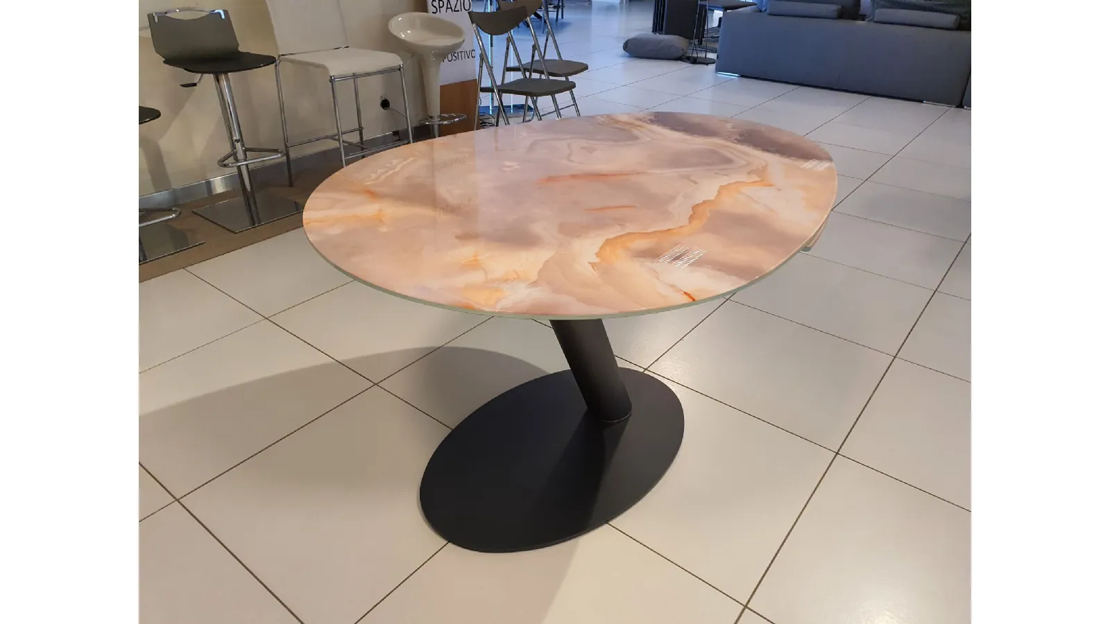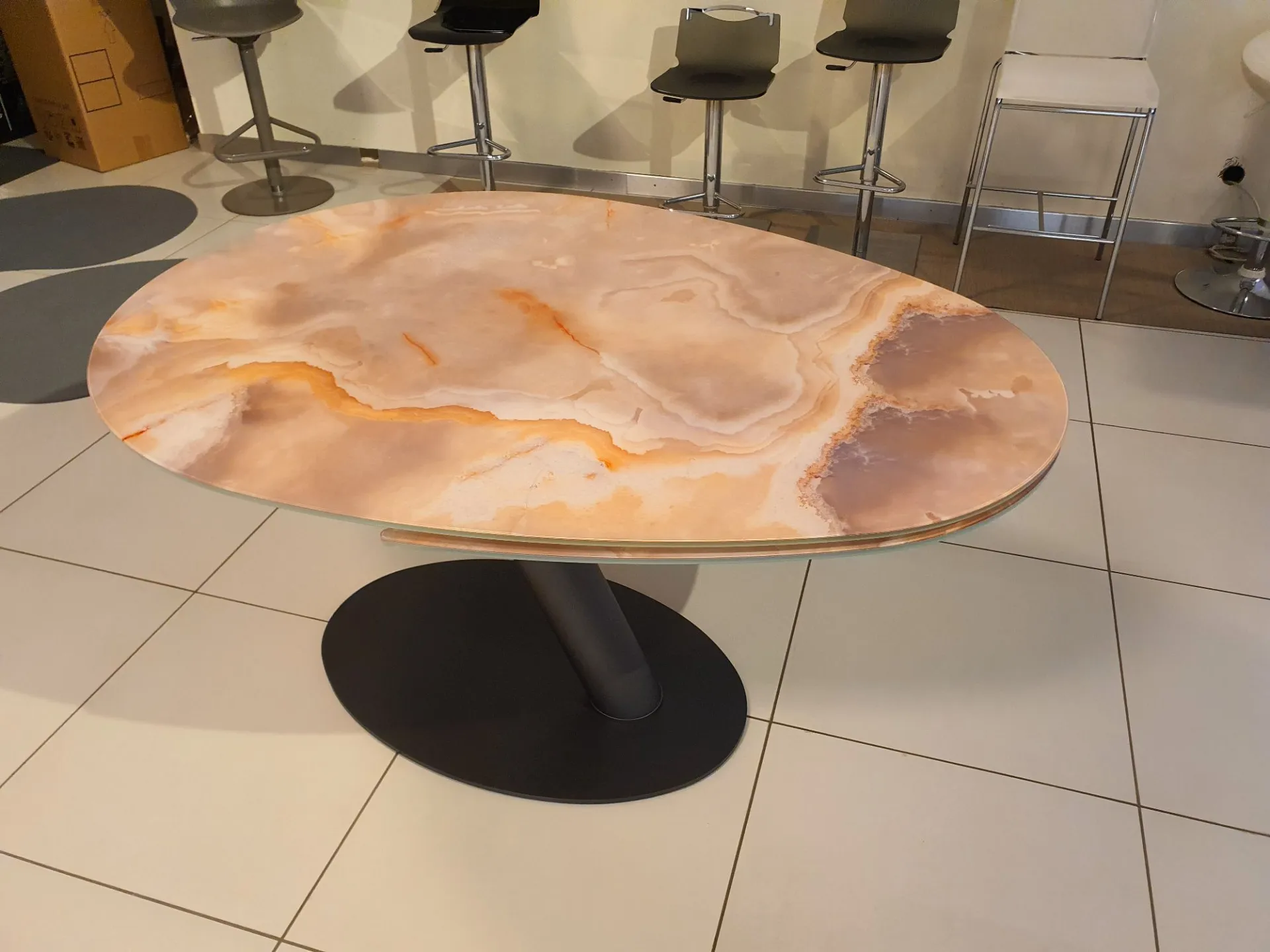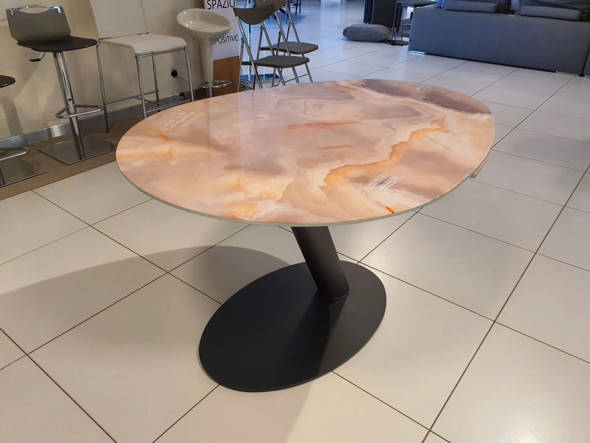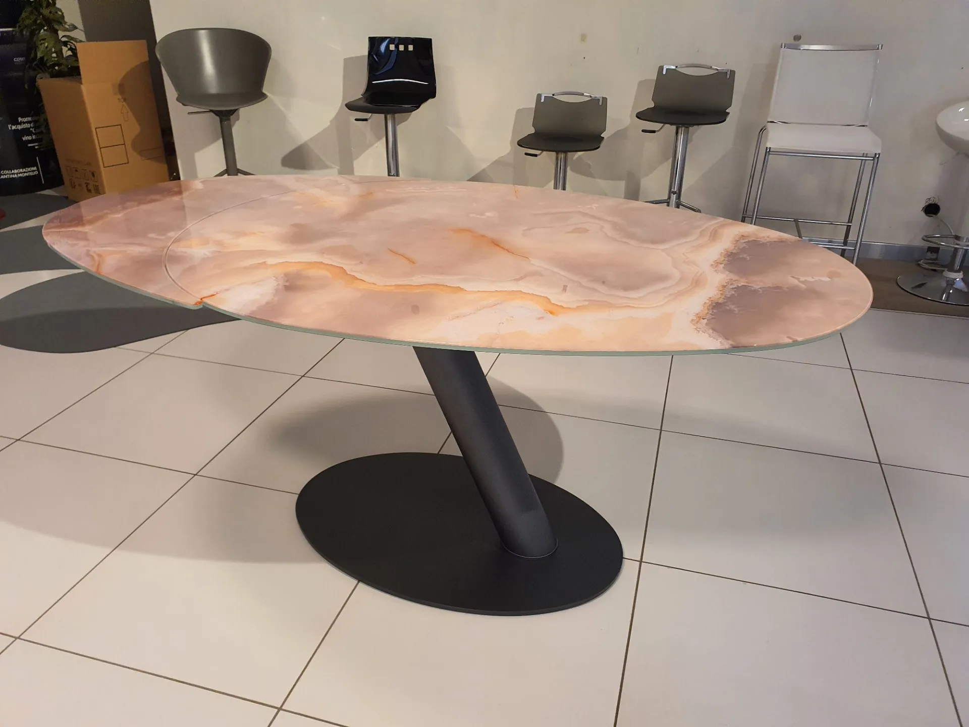 Bellissimo tavolo allungabile dal design fresco e con basamento a colonna in metallo verniciato grafite. Il piano e l'allunga sono in vetro marble glass finitura ONICE (12 mm)