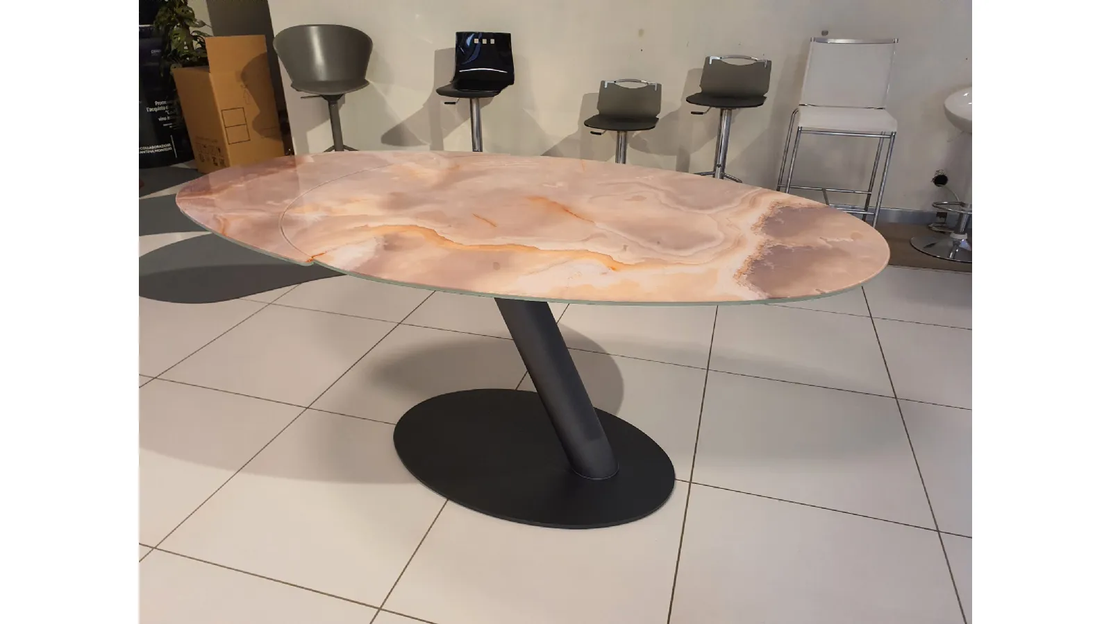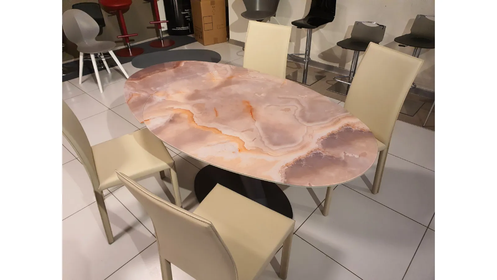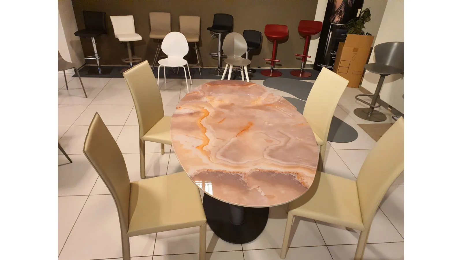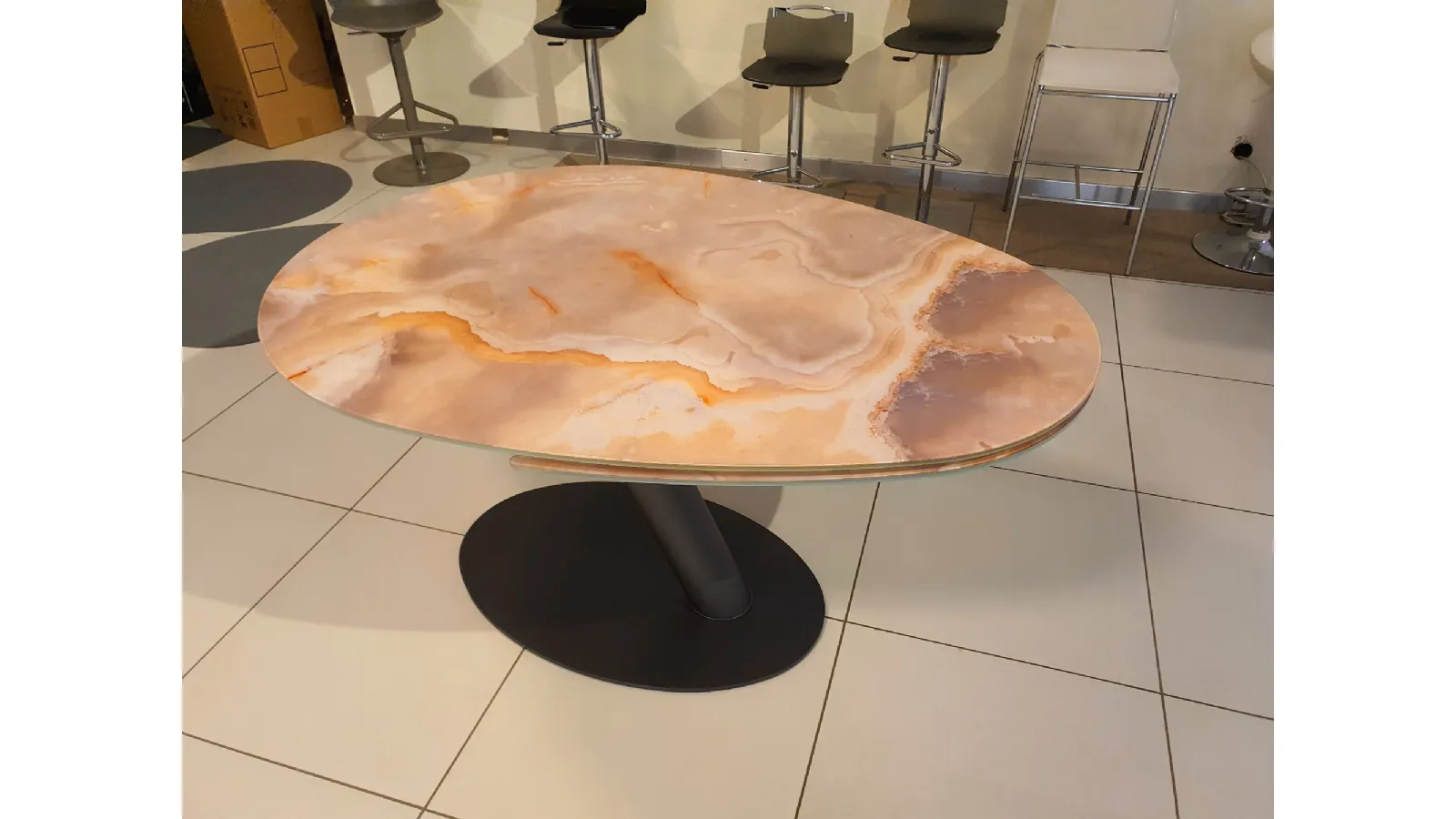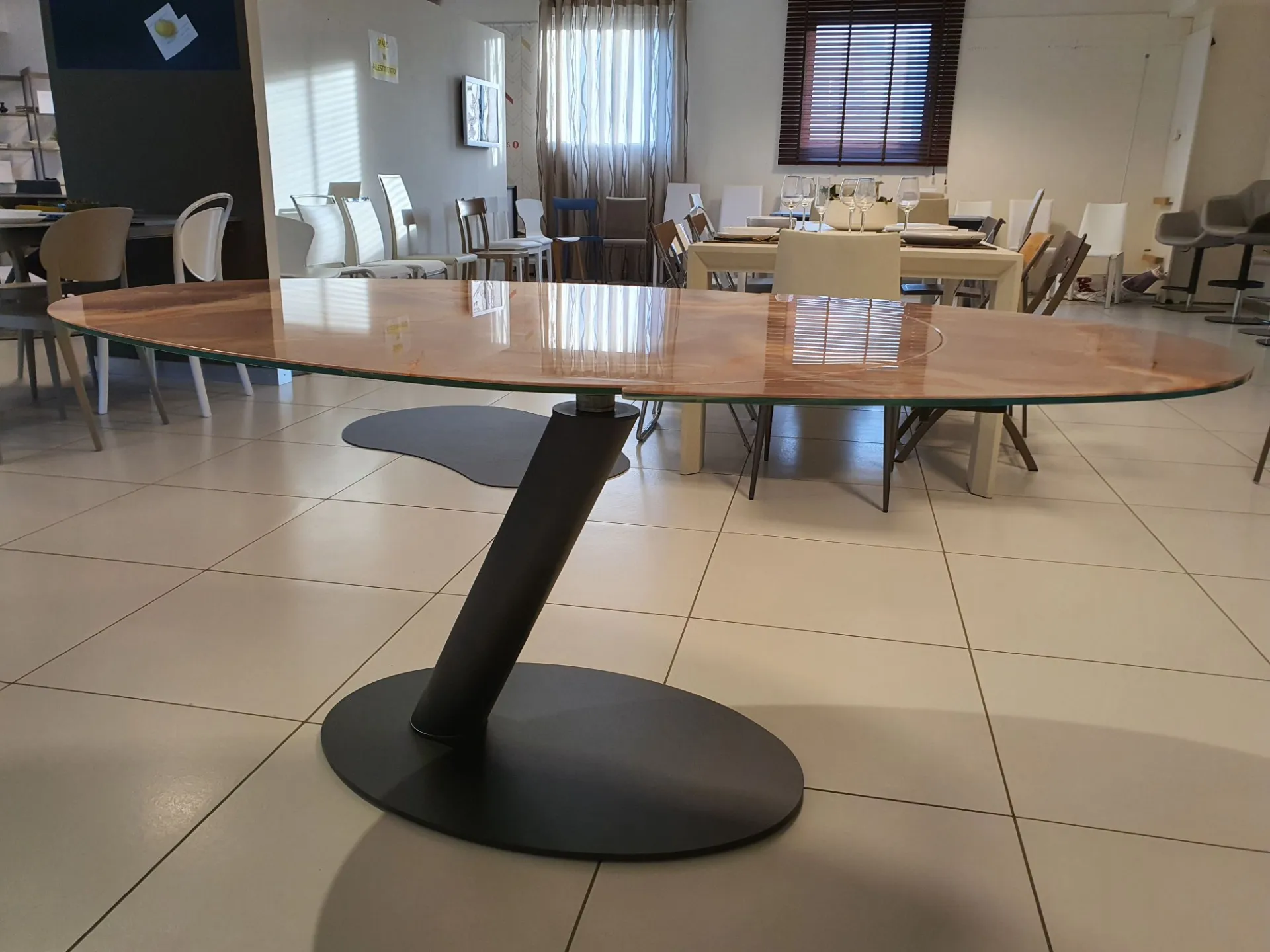 Bellissimo tavolo allungabile dal design fresco e con basamento a colonna in metallo verniciato grafite. Il piano e l'allunga sono in vetro marble glass finitura ONICE (12 mm)