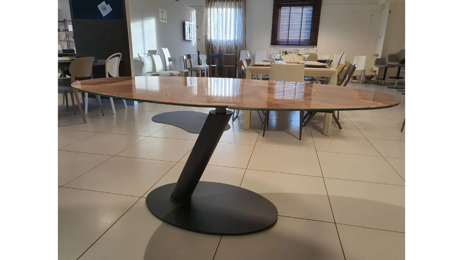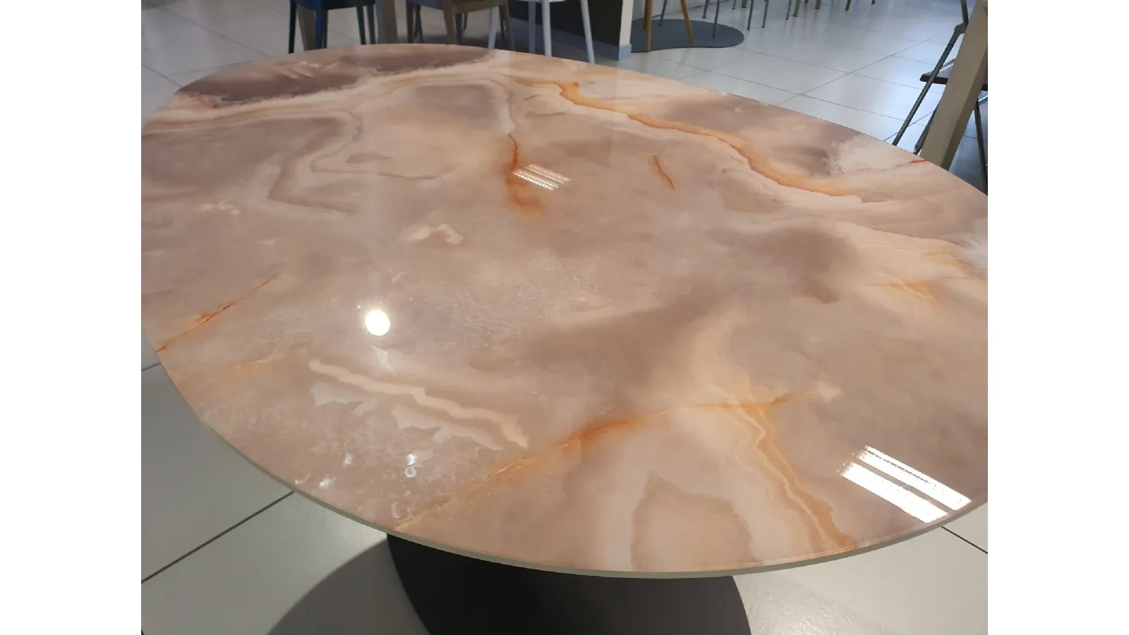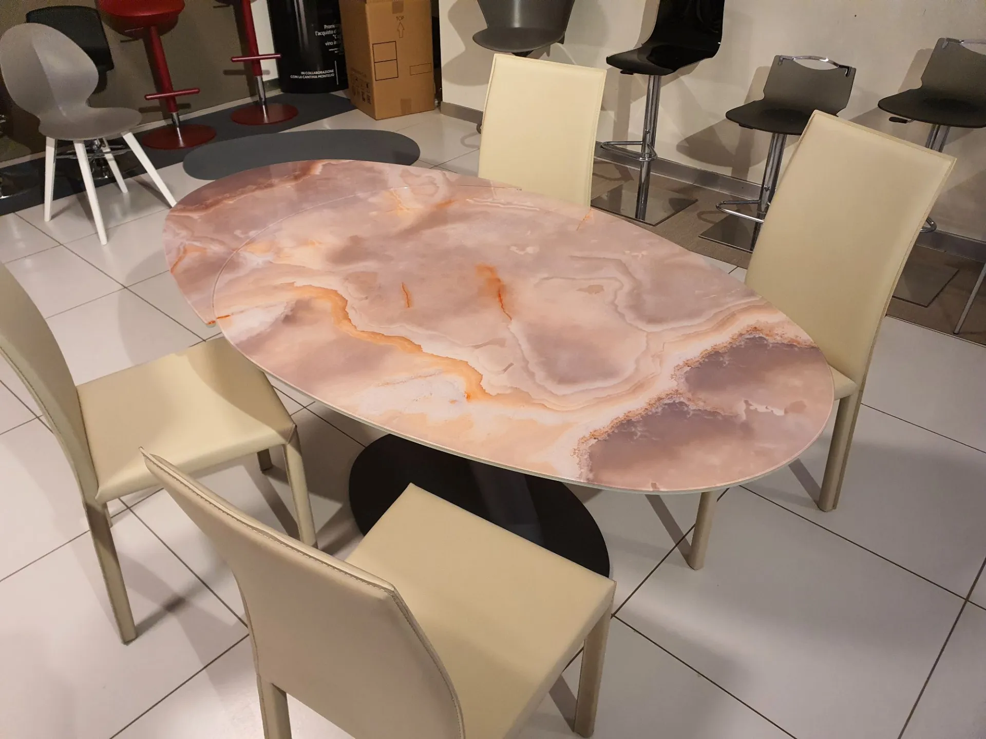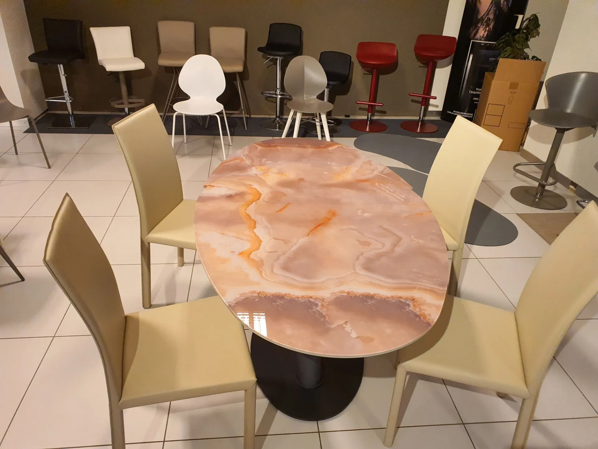 Bellissimo tavolo allungabile dal design fresco e con basamento a colonna in metallo verniciato grafite. Il piano e l'allunga sono in vetro marble glass finitura ONICE (12 mm)