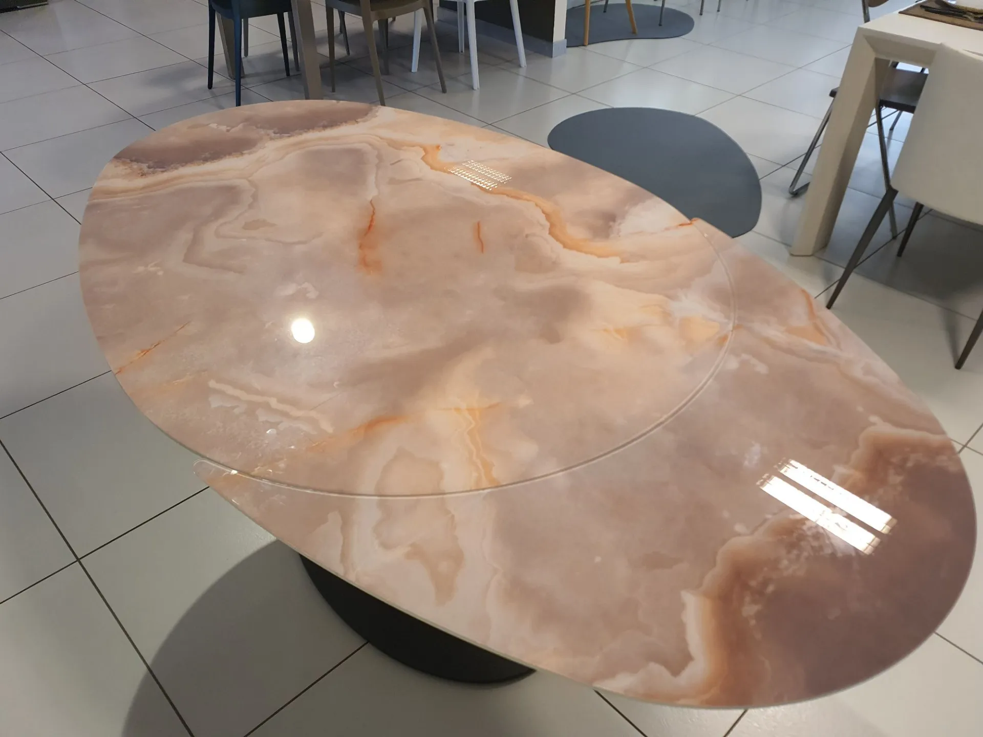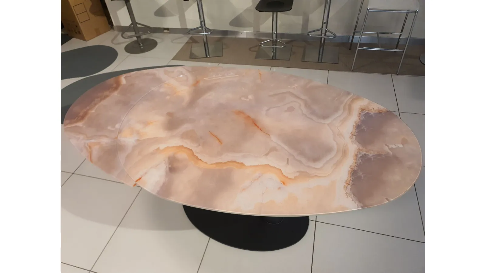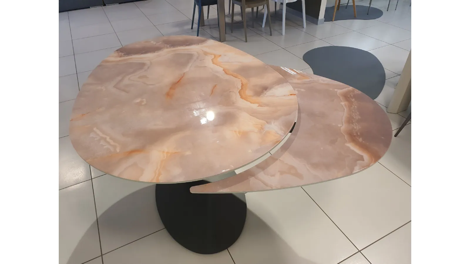 L'allunga è girevole con un meccanismo di auto sollevamento azionabile mediante leva posta sotto al piano. L’allunga è fissa nelle posizioni di chiusura e di apertura. È un tavolo adatto a chi ha ambienti piccoli ma non vuole rinunciare ad un tavolo di design con materiali pregiati come la finitura ONICE