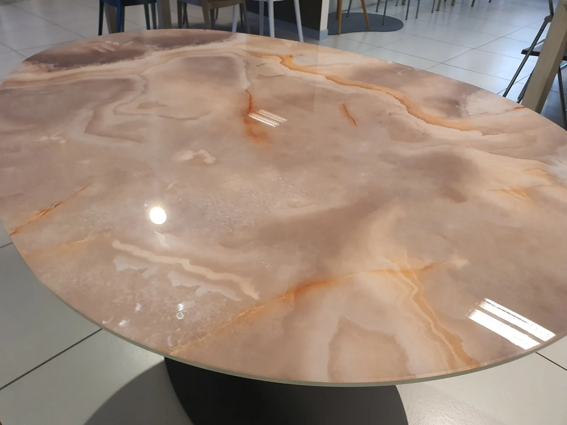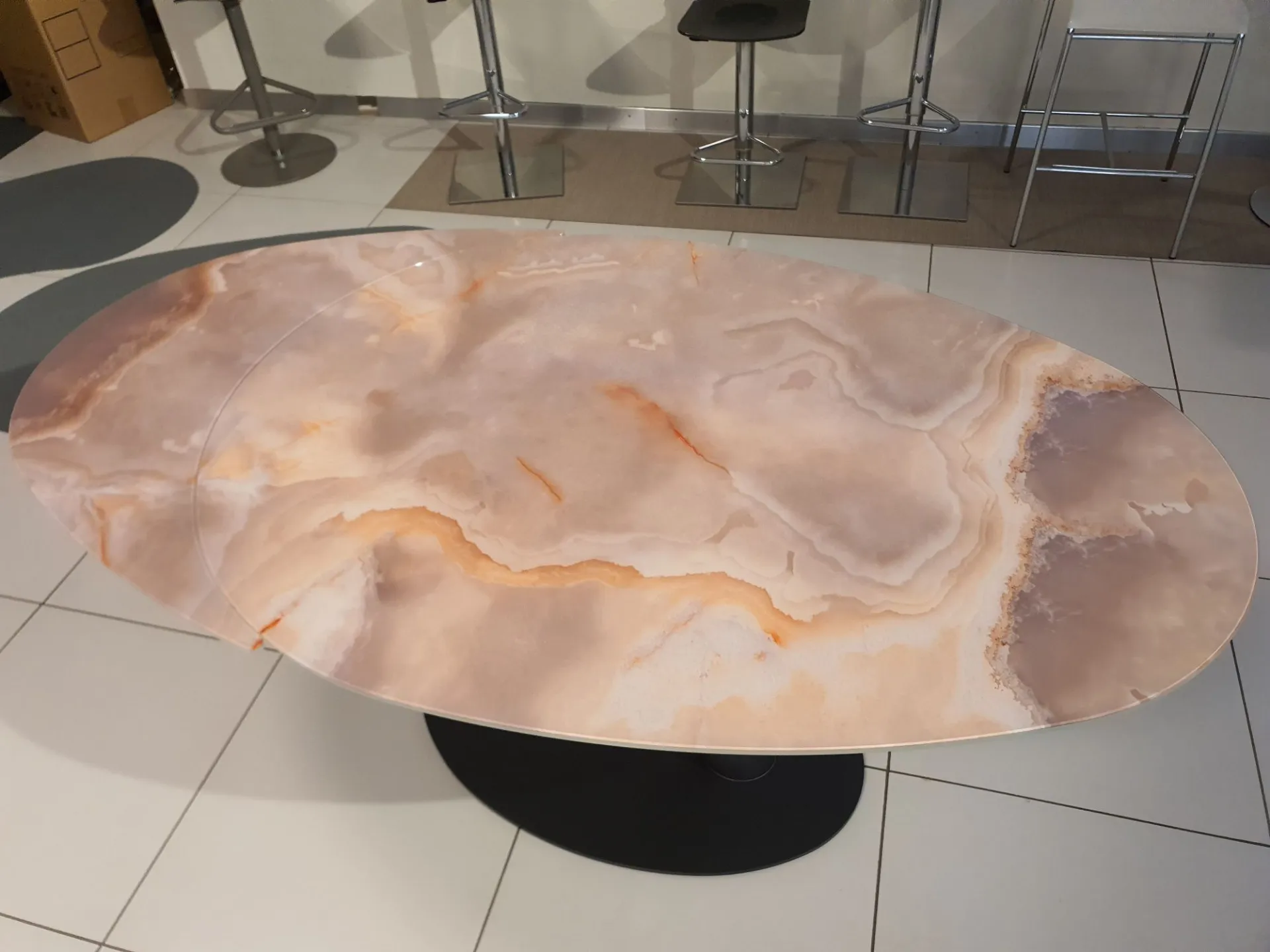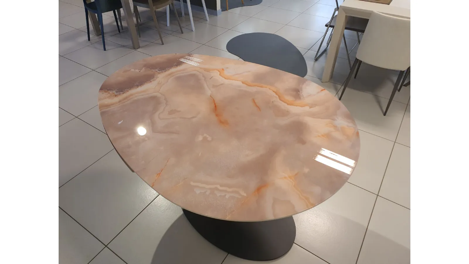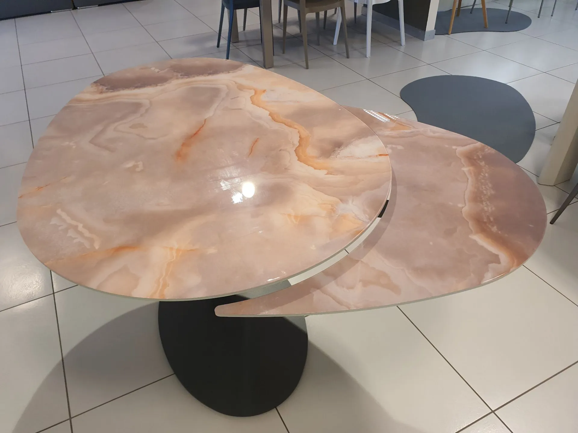 L'allunga è girevole con un meccanismo di auto sollevamento azionabile mediante leva posta sotto al piano. L’allunga è fissa nelle posizioni di chiusura e di apertura. È un tavolo adatto a chi ha ambienti piccoli ma non vuole rinunciare ad un tavolo di design con materiali pregiati come la finitura ONICE