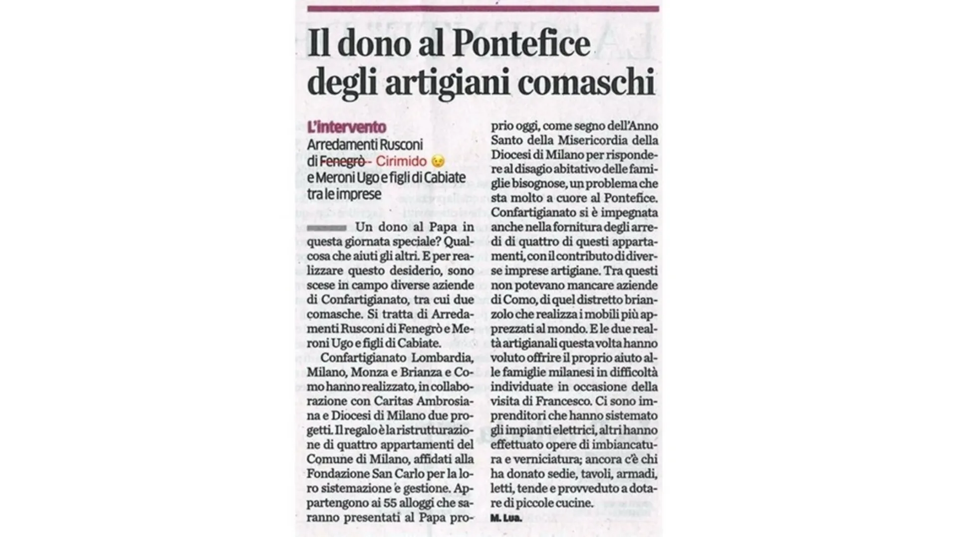 Appartamenti fra i 40 e i 70 metri quadri resi di nuovo abitabili. Un regalo alla città nel nome di Francesco realizzato grazie agli artigiani lombardi e alla loro generosità. «Un dono nel dono. Dall’impianto elettrico, all’impianto idraulico, imbiancatura, rifiniture, tende, praticamente pronti. Una quindicina le imprese del territorio che hanno voluto aderire all’iniziativa offrendo non solo il proprio tempo e il proprio lavoro, ma anche gli arredi necessari: sedie, tavoli, armadi, letti, tende, nonché piccole cucine su misura. Un gesto semplice per rispondere al disagio abitativo delle famiglie bisognose, quando guardiamo a queste persone che oggi stiamo aiutando, dobbiamo renderci conto di quanto siamo ancora fortunati.