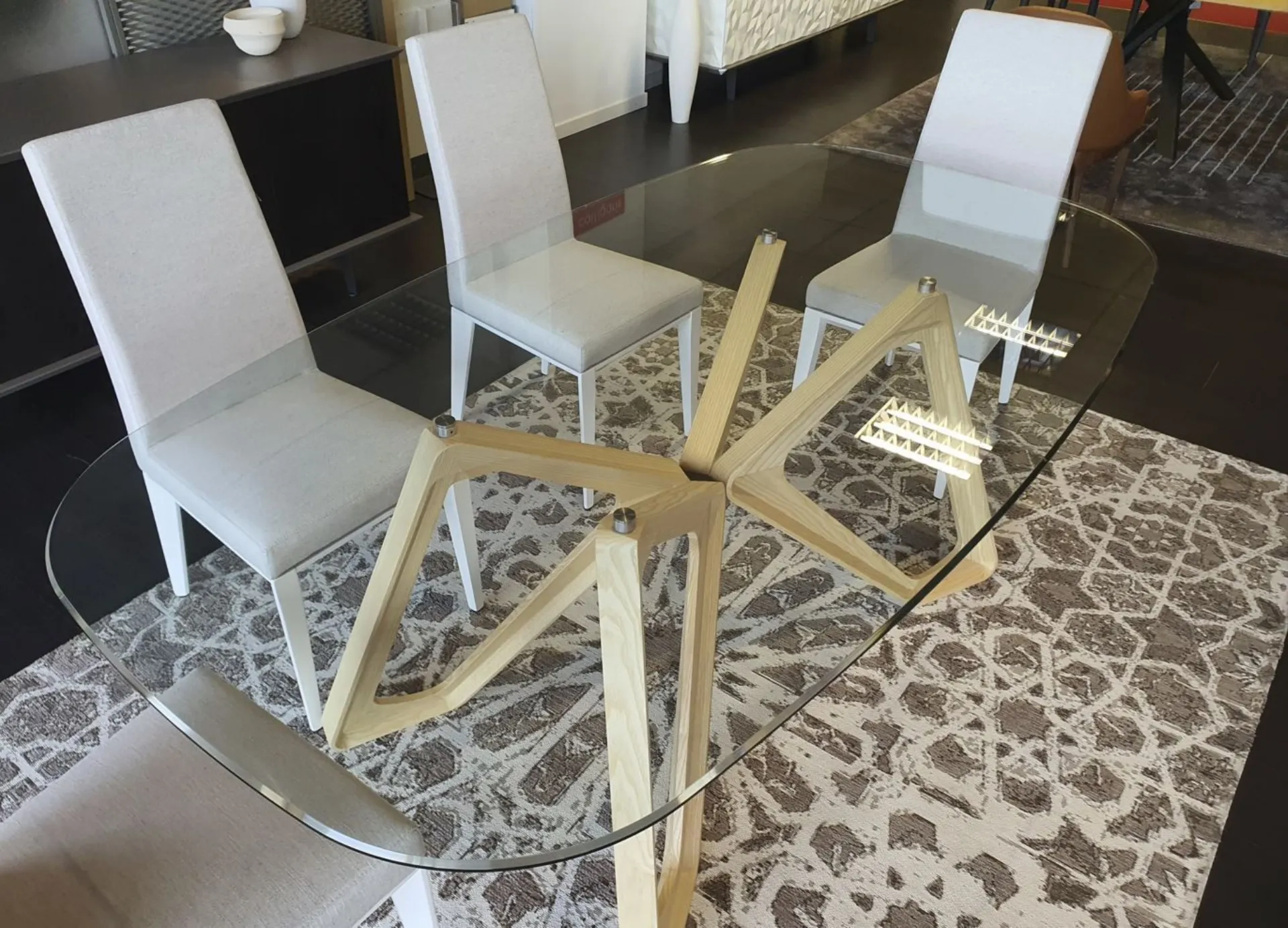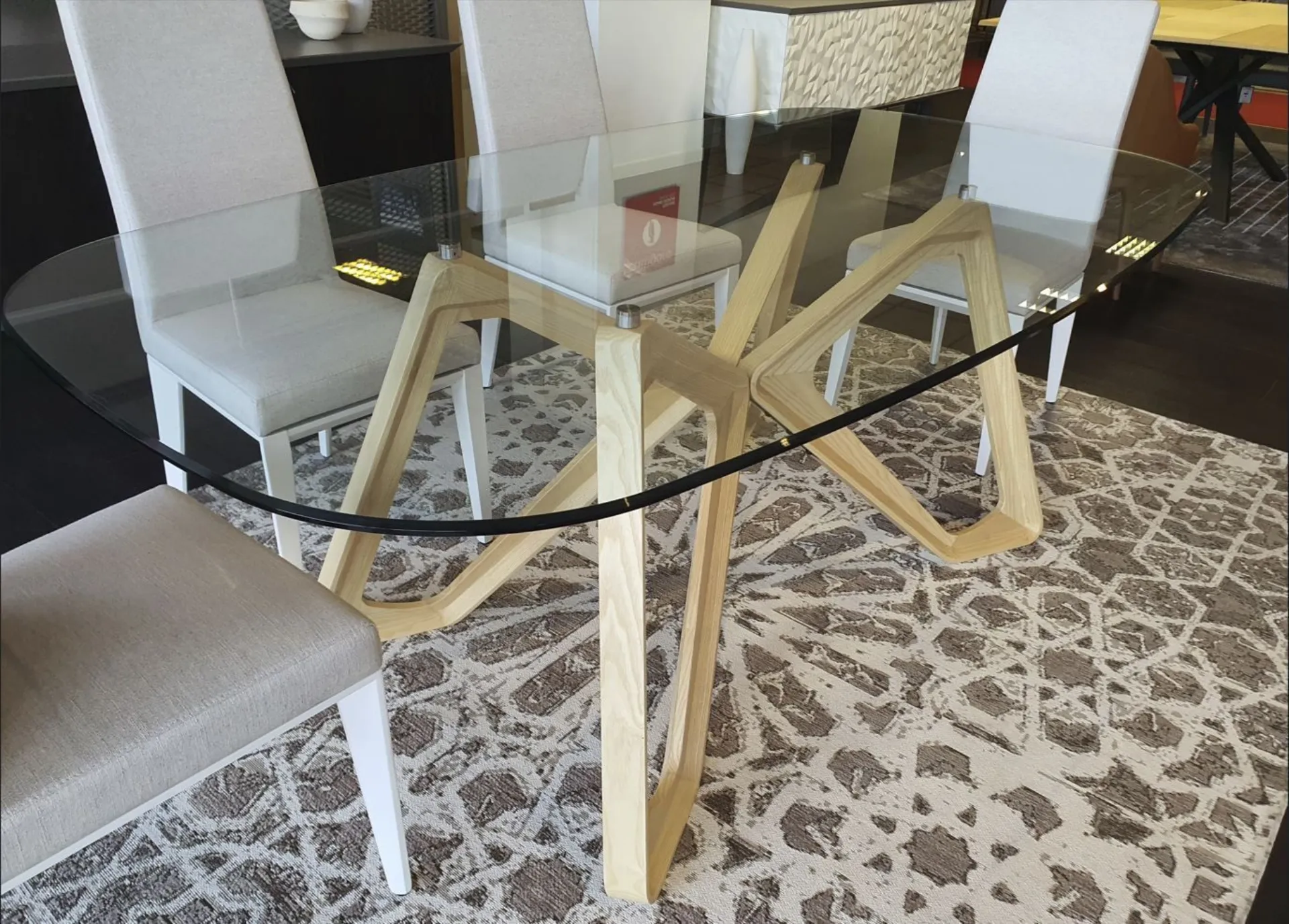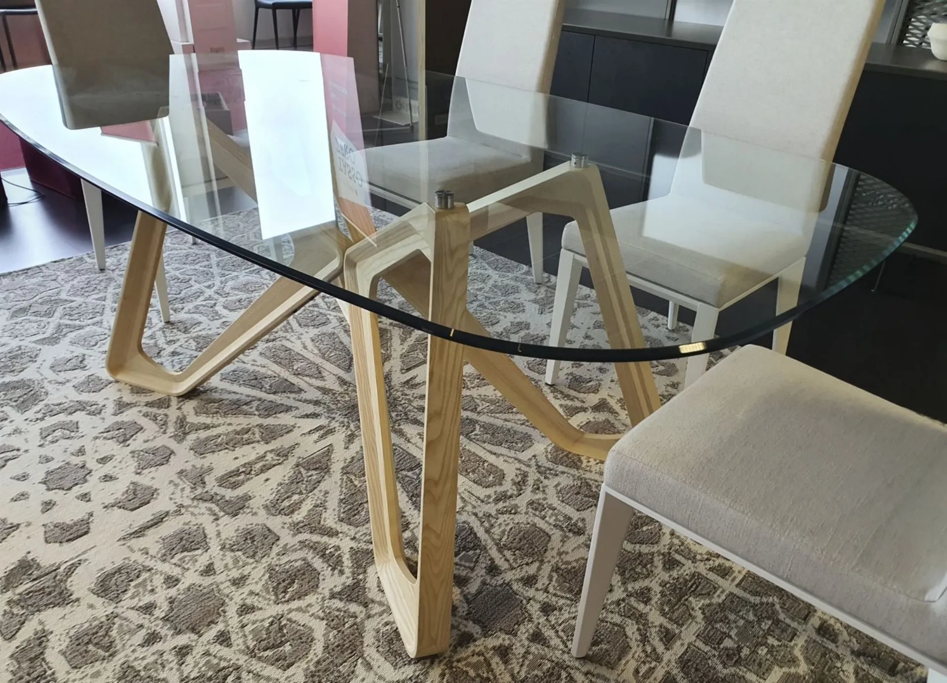 PAPILLON è il tavolo perfetto per un Living moderno. È caratterizzato dal piano in vetro trasparente extrachiaro da 12mm di forma ovale, privo di spigoli, comodo per ospitare fino a 8 posti. È un tavolo da pranzo con base unica in legno massello ed in finitura Frassino Naturale.