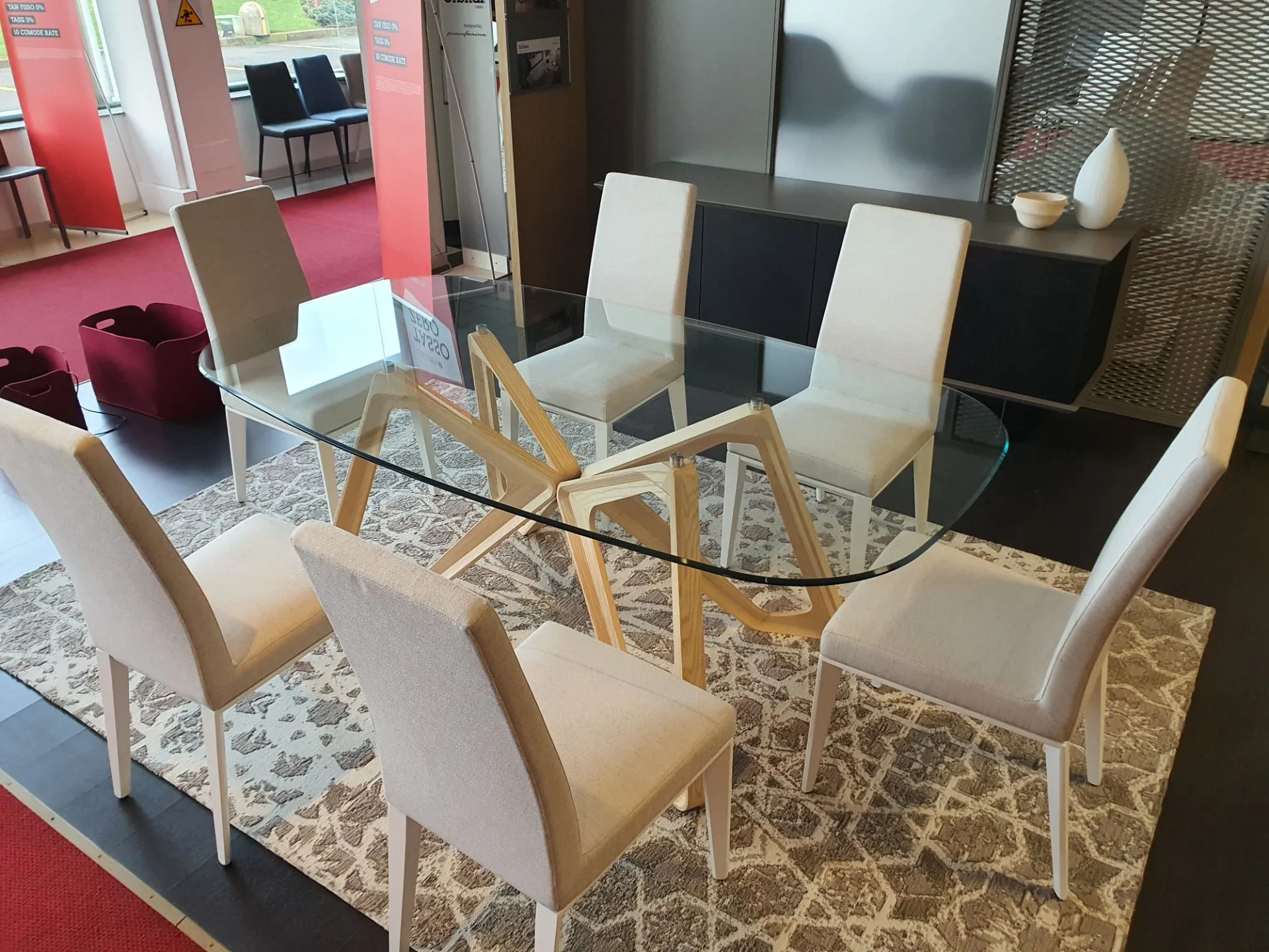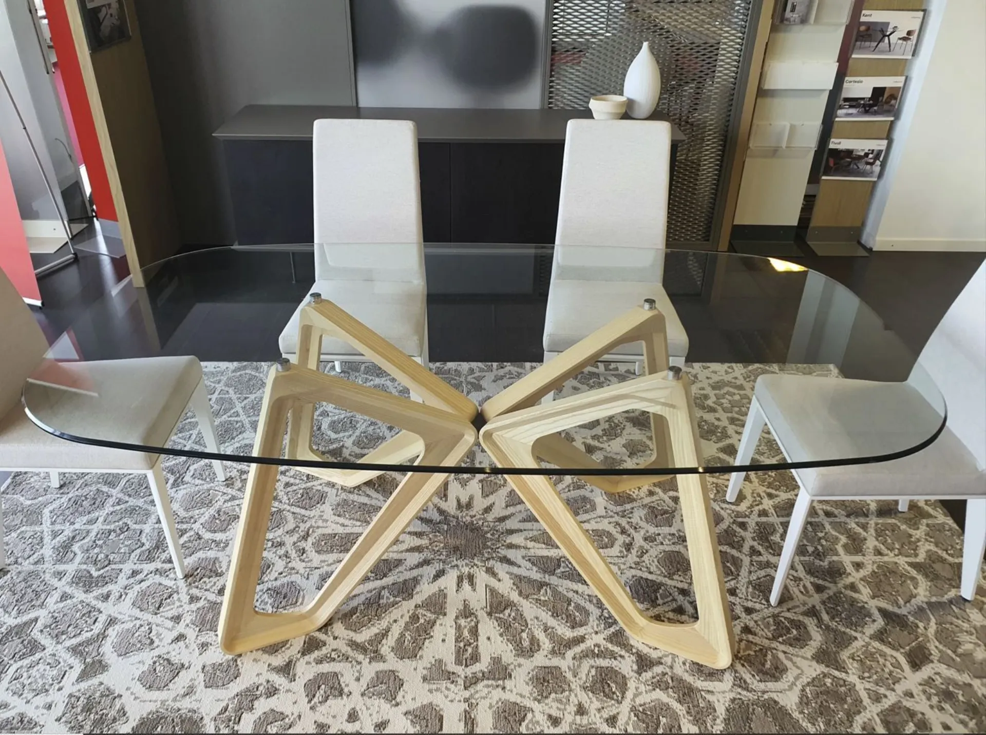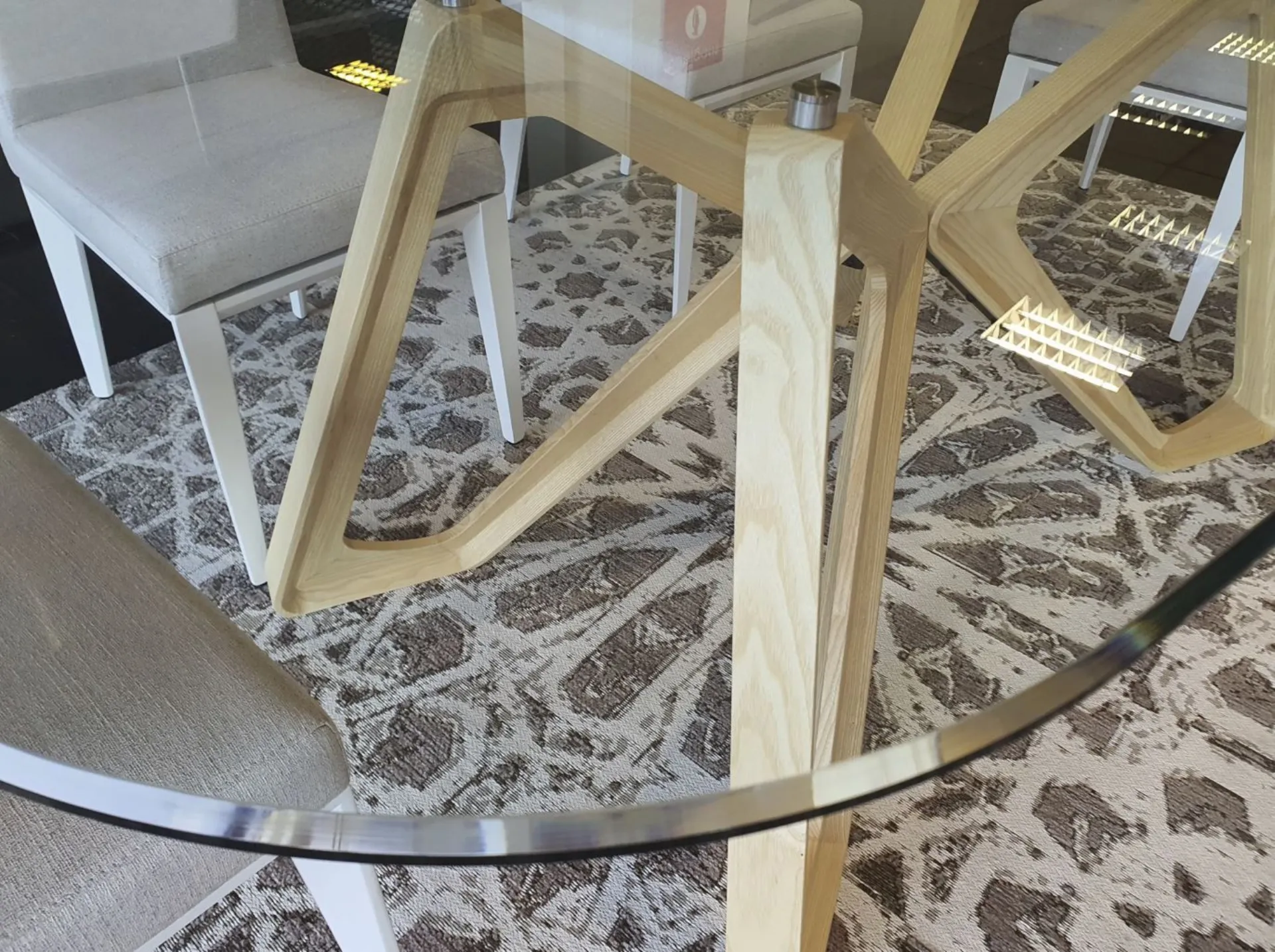 PAPILLON è il tavolo perfetto per un Living moderno. È caratterizzato dal piano in vetro trasparente extrachiaro da 12mm di forma ovale, privo di spigoli, comodo per ospitare fino a 8 posti. È un tavolo da pranzo con base unica in legno massello ed in finitura Frassino Naturale.
