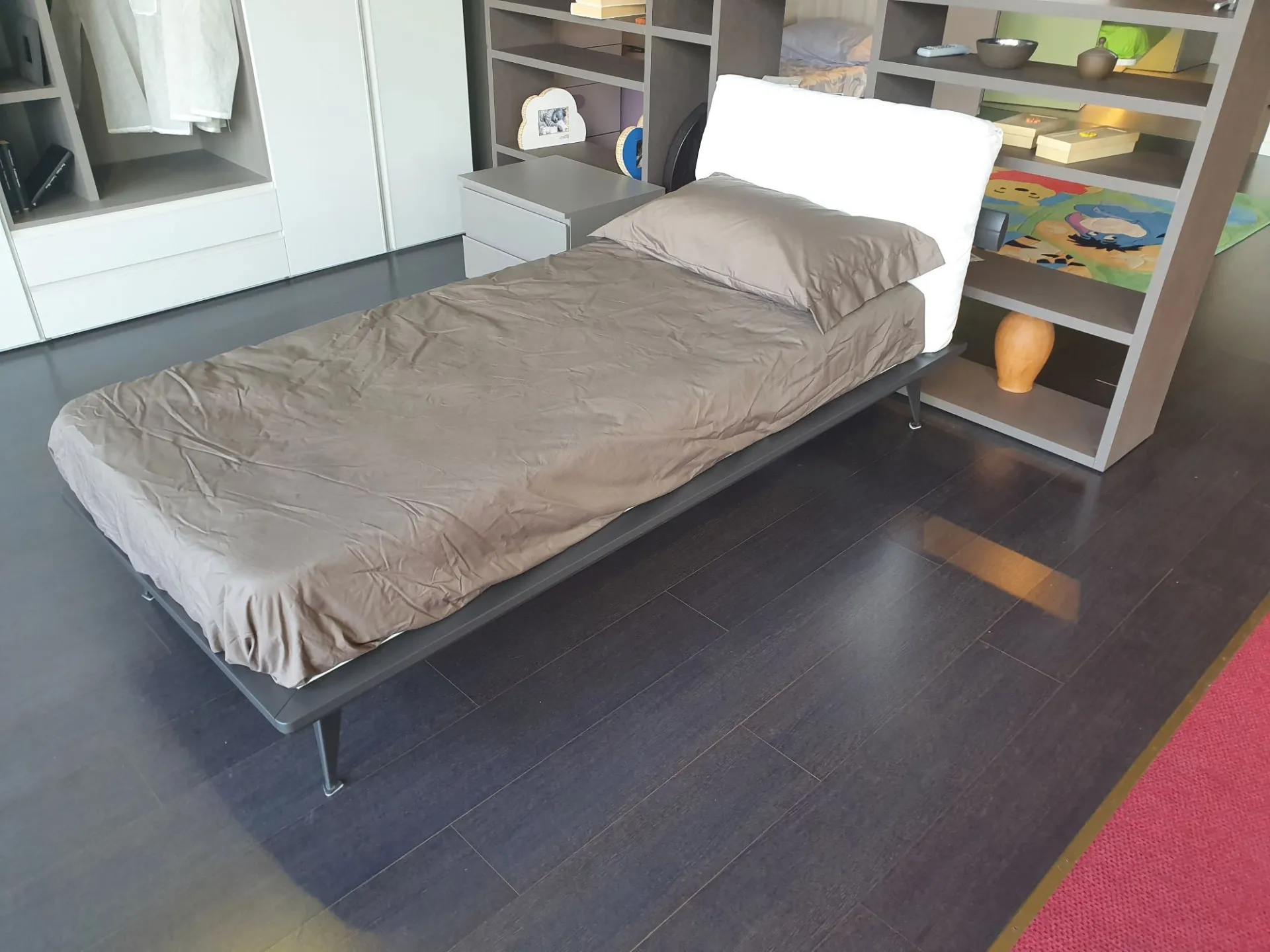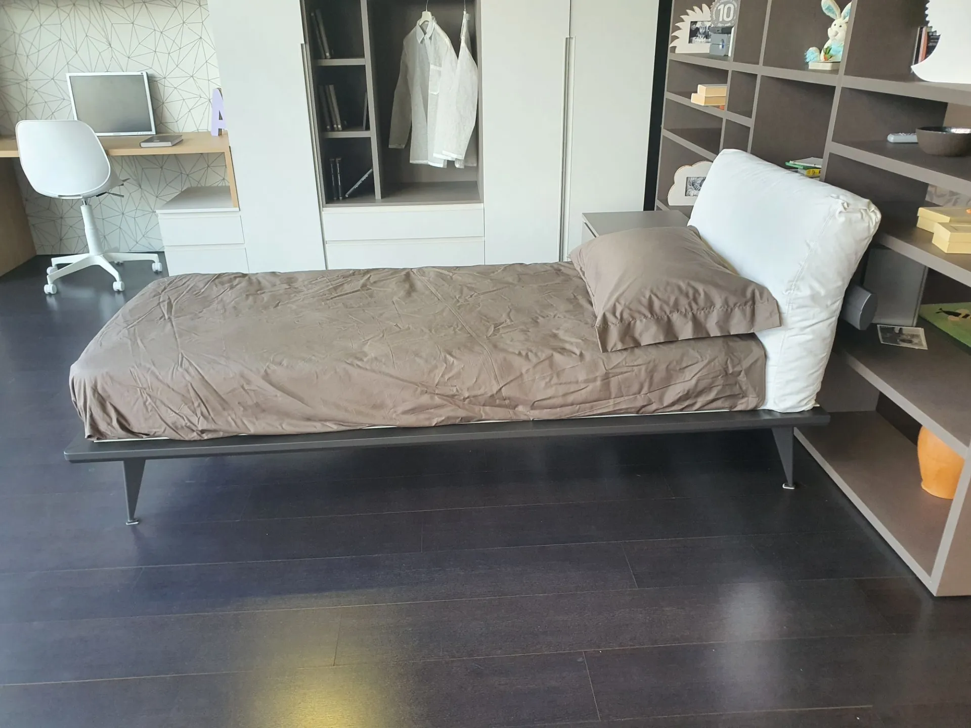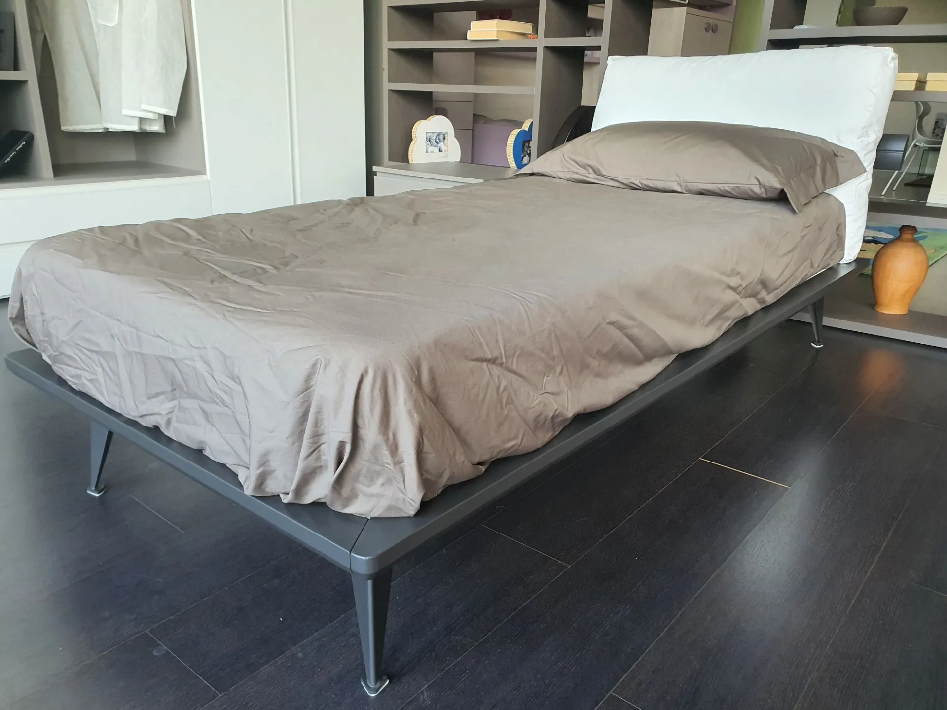 Letto singolo mod.Piuma con giroletto in finitura laccato opaco colore antracite e testata imbottita. Testata rivestita in tessuto bianco.