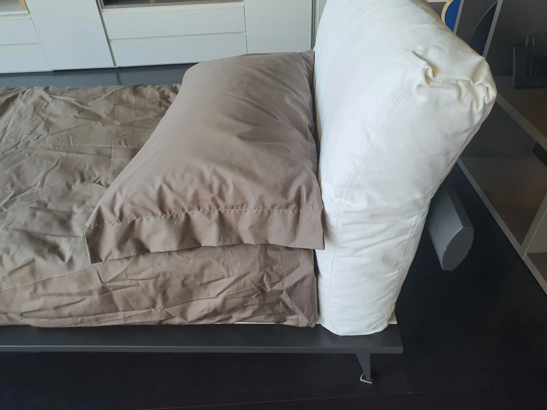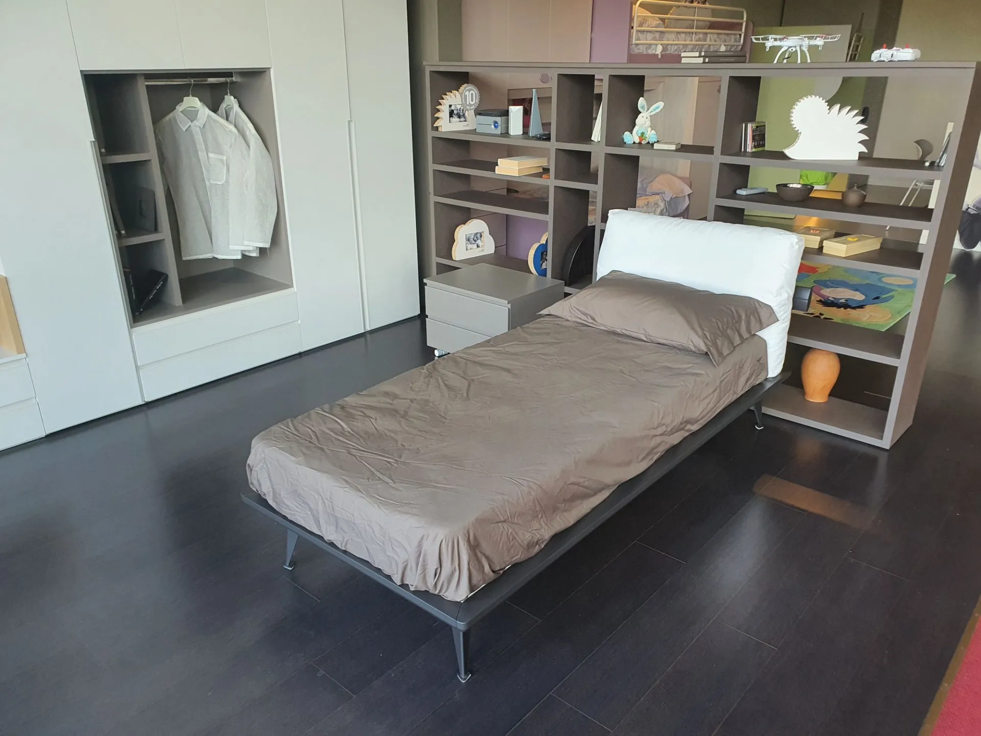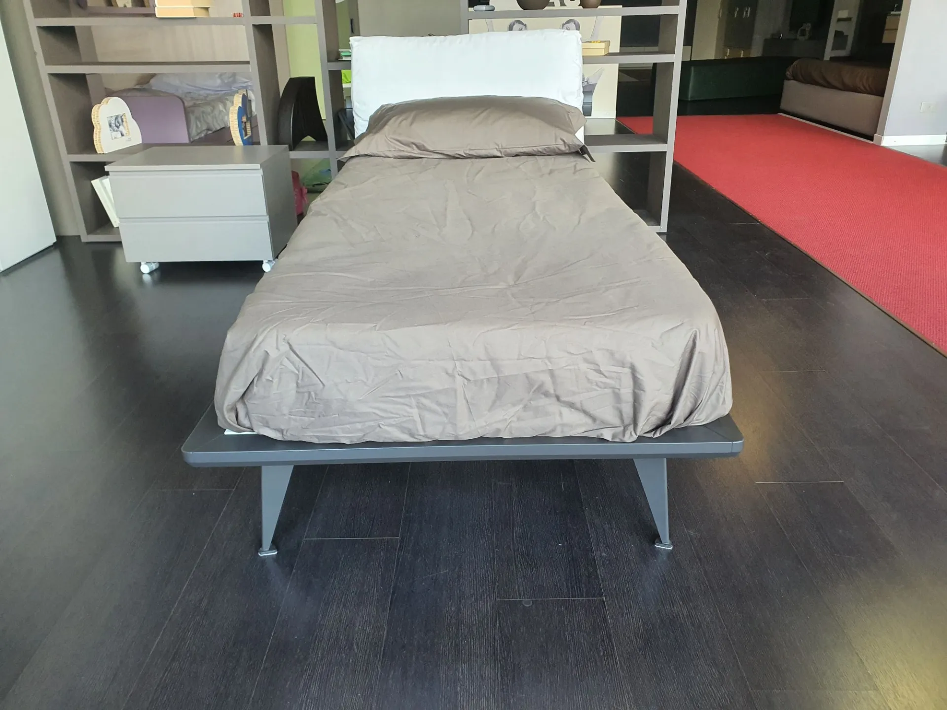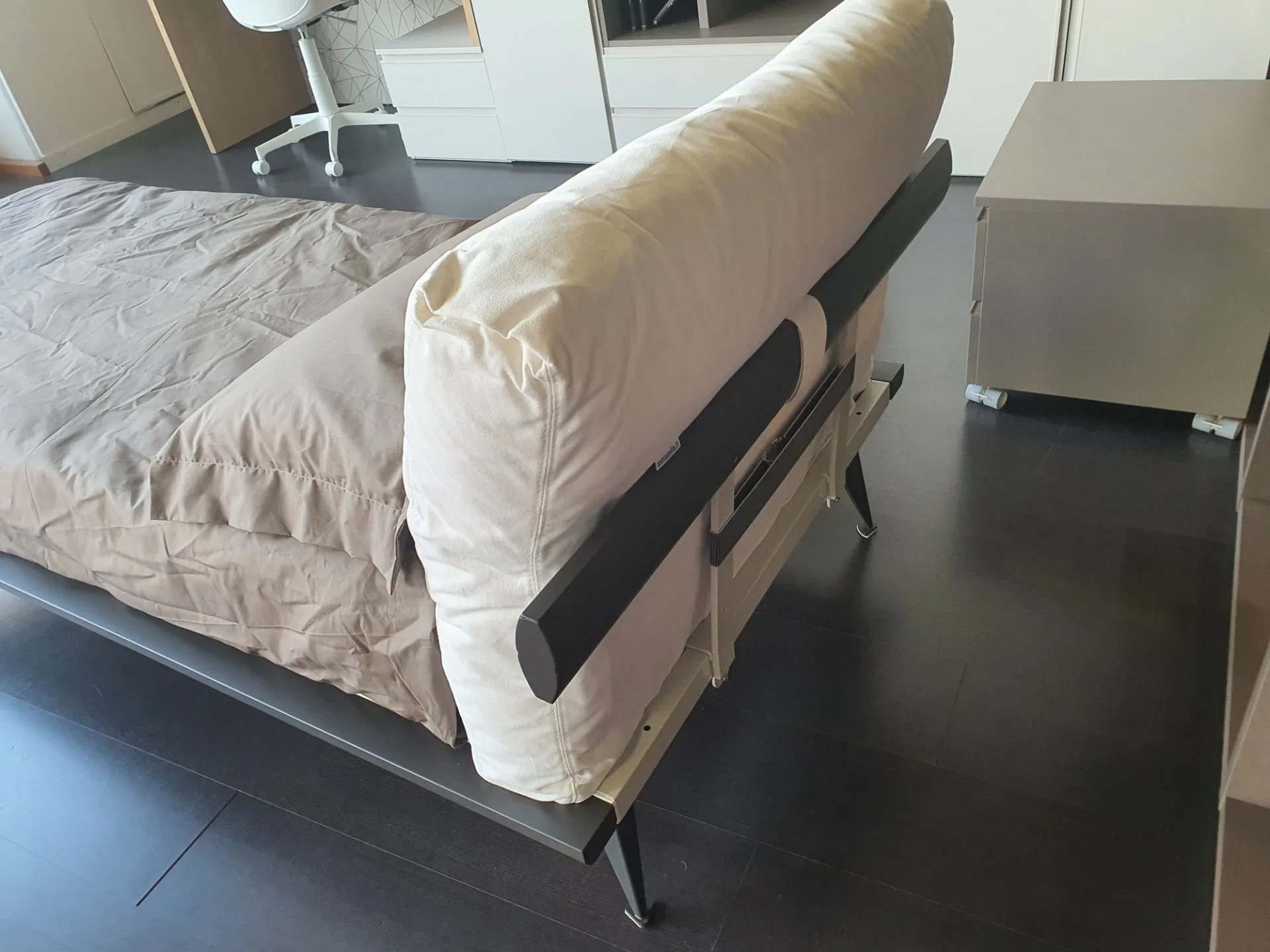 Letto singolo mod.Piuma con giroletto in finitura laccato opaco colore antracite e testata imbottita. Testata rivestita in tessuto bianco.
