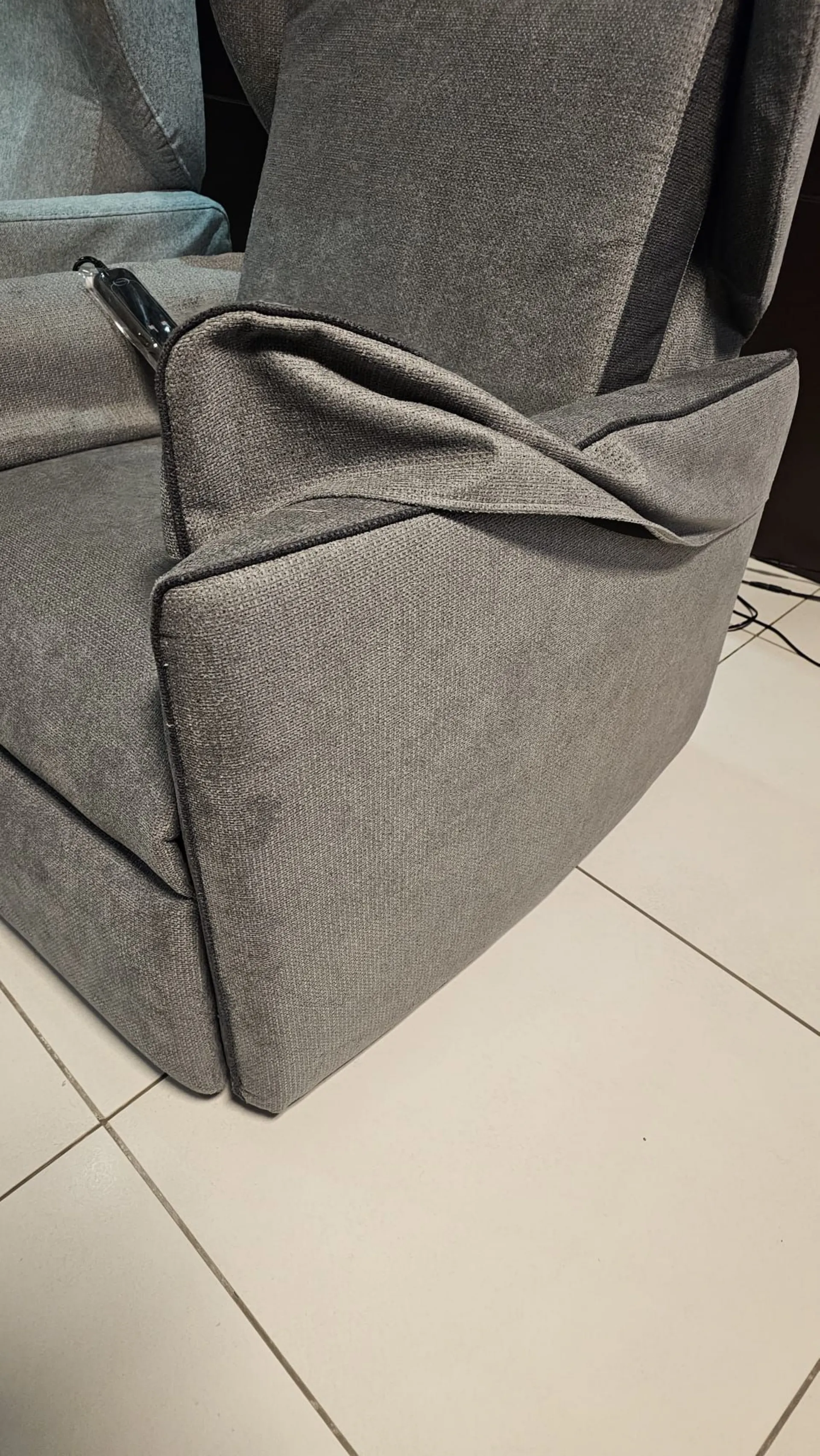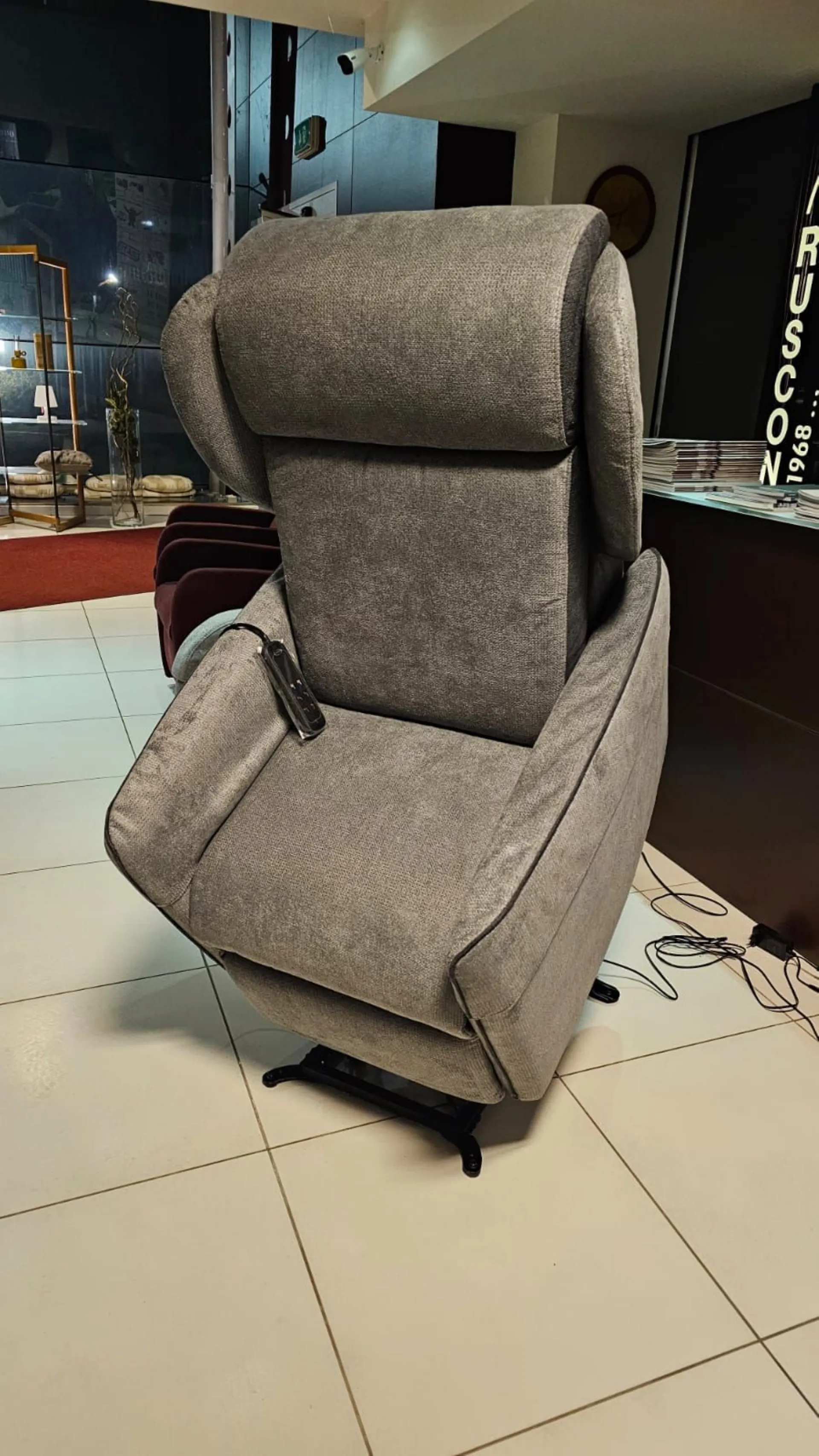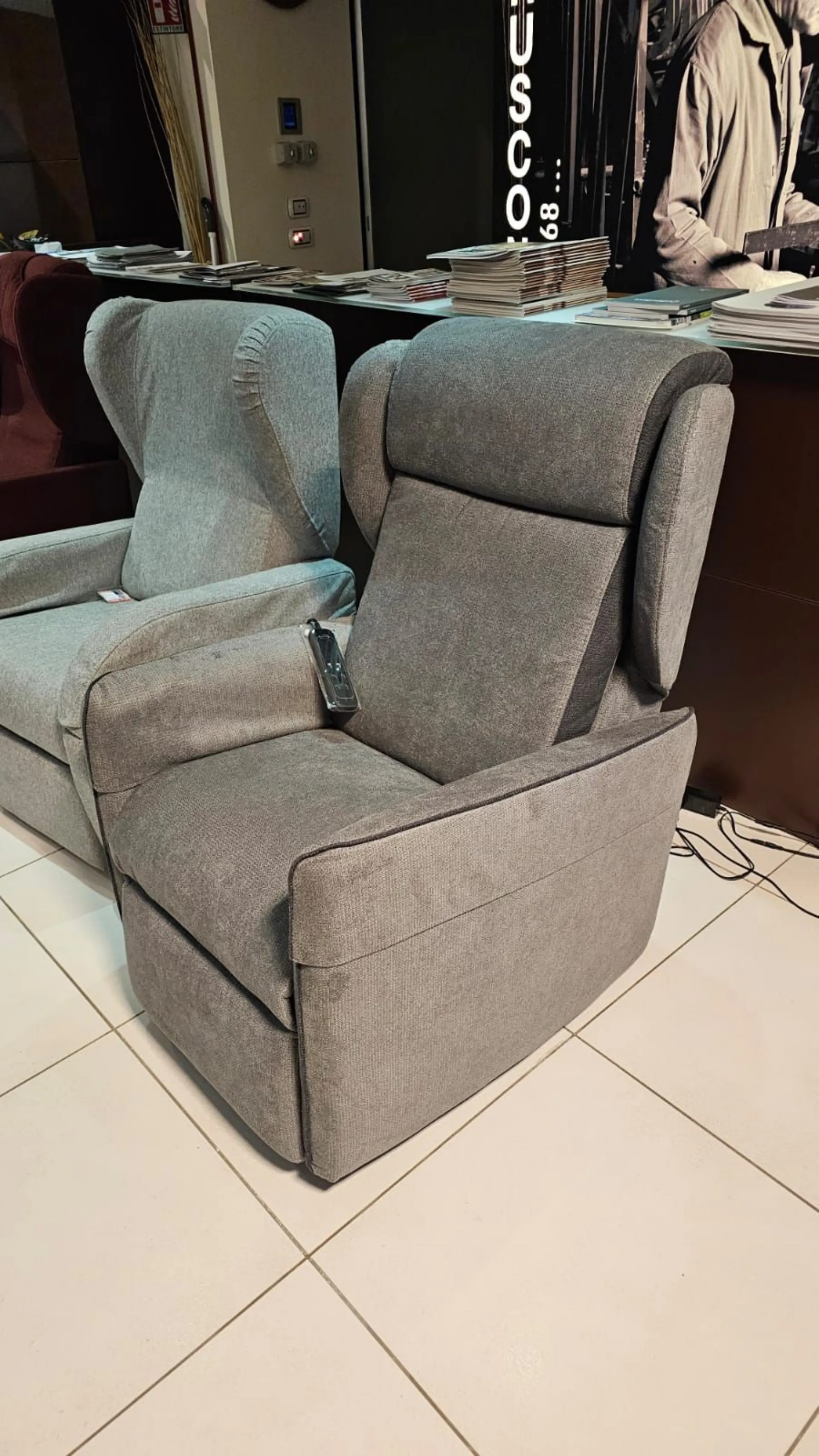 Poltrona relax mod. ANDROMEDA, rivestimento in tessuto sfoderabile ad esclusione dello schienale, dotata di roller motorizzato Click&Roll, predisposizione per batteria, doppia pediera, kit fodere copribracciolo, possibilità di gestire la cucitura in contrasto, dispositivo medico detraibile classe 1, posizione TV, dimensioni cm. 75x93prof.x113h. (in massima estensione la misura d'ingombro in profondità diventa di cm. 168)