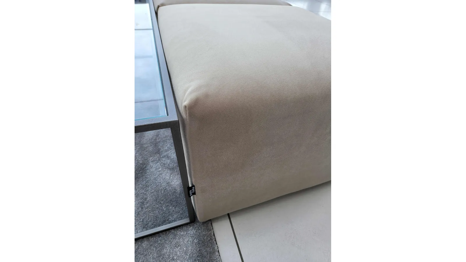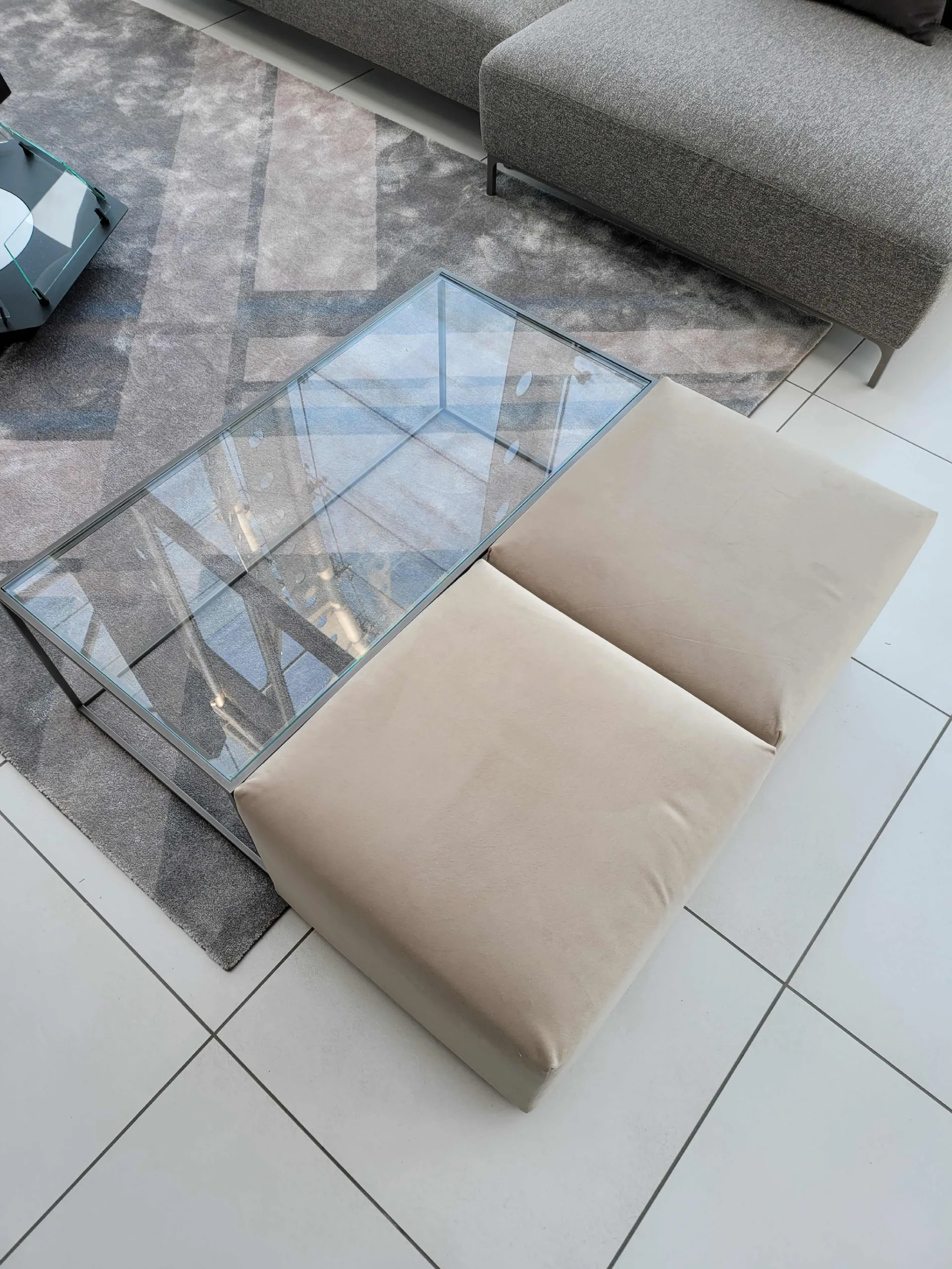 Il pouf misura cm 52x52xh.38 ed è rivestito in tessuto tipo vellutino colore beige.