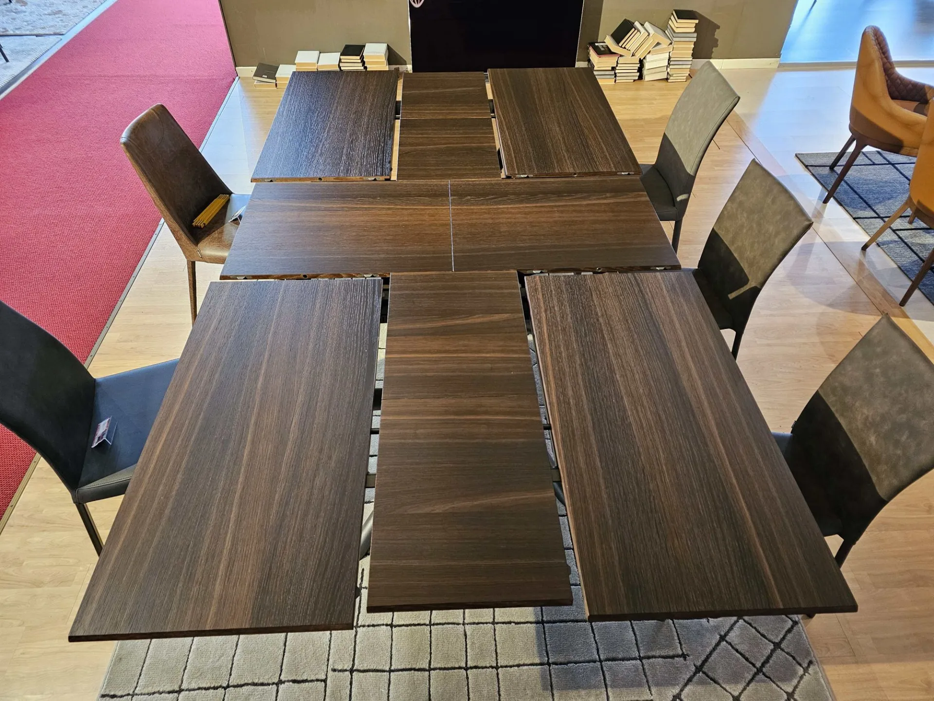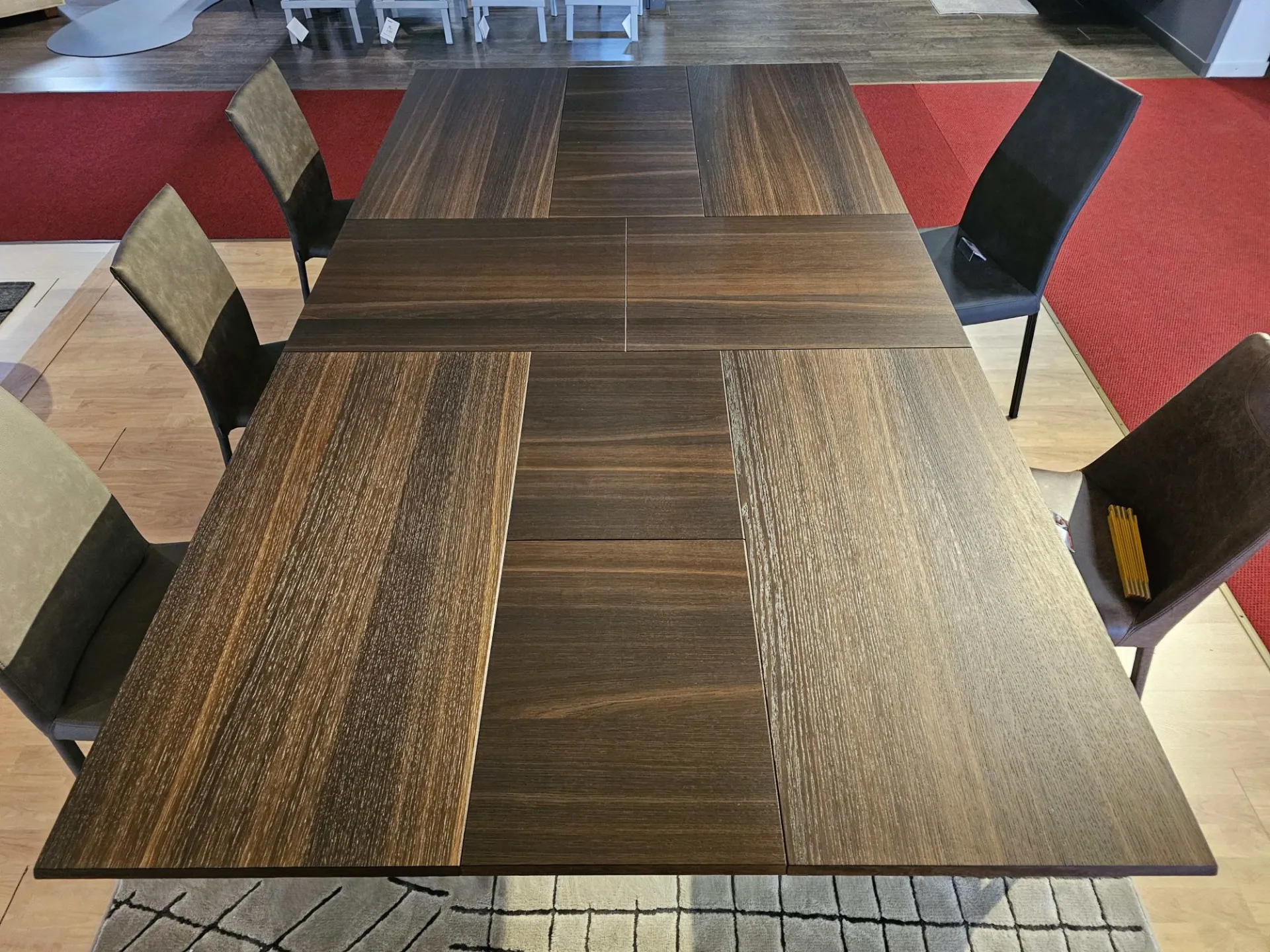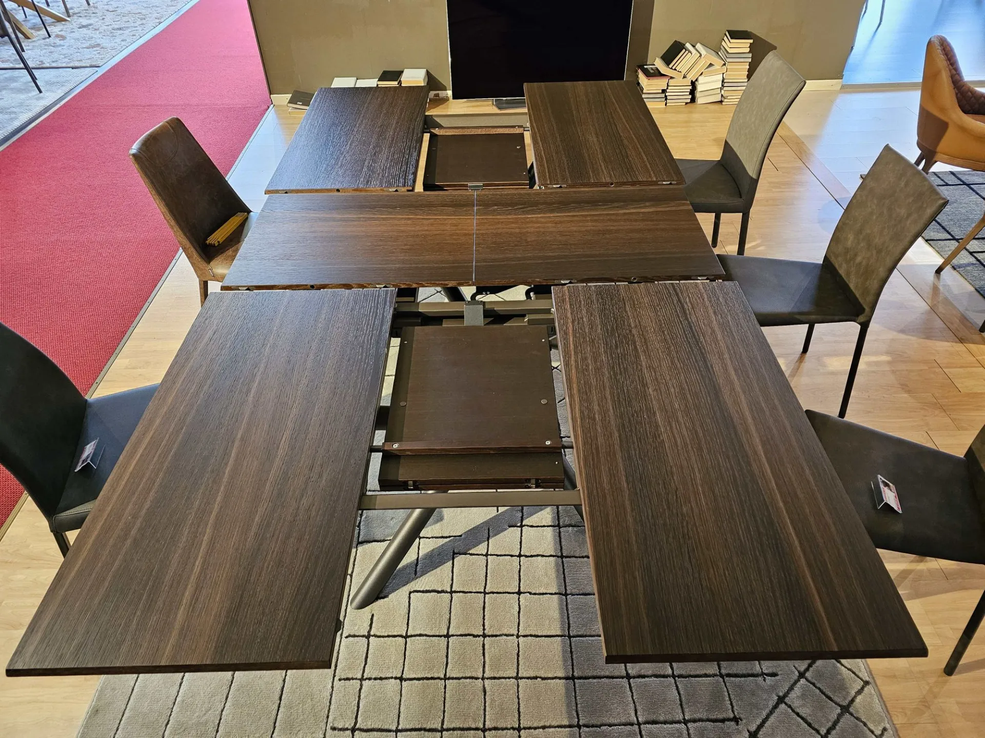 Tavolo allungabile RANDOM con piano in legno Rovere Termotrattato PZ98 e basamento in metallo finitura bronzo opaco MT97, 12 posti cm. 100(138)x200(254)
