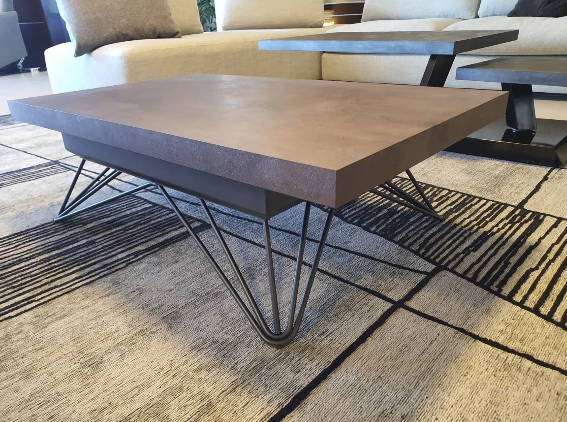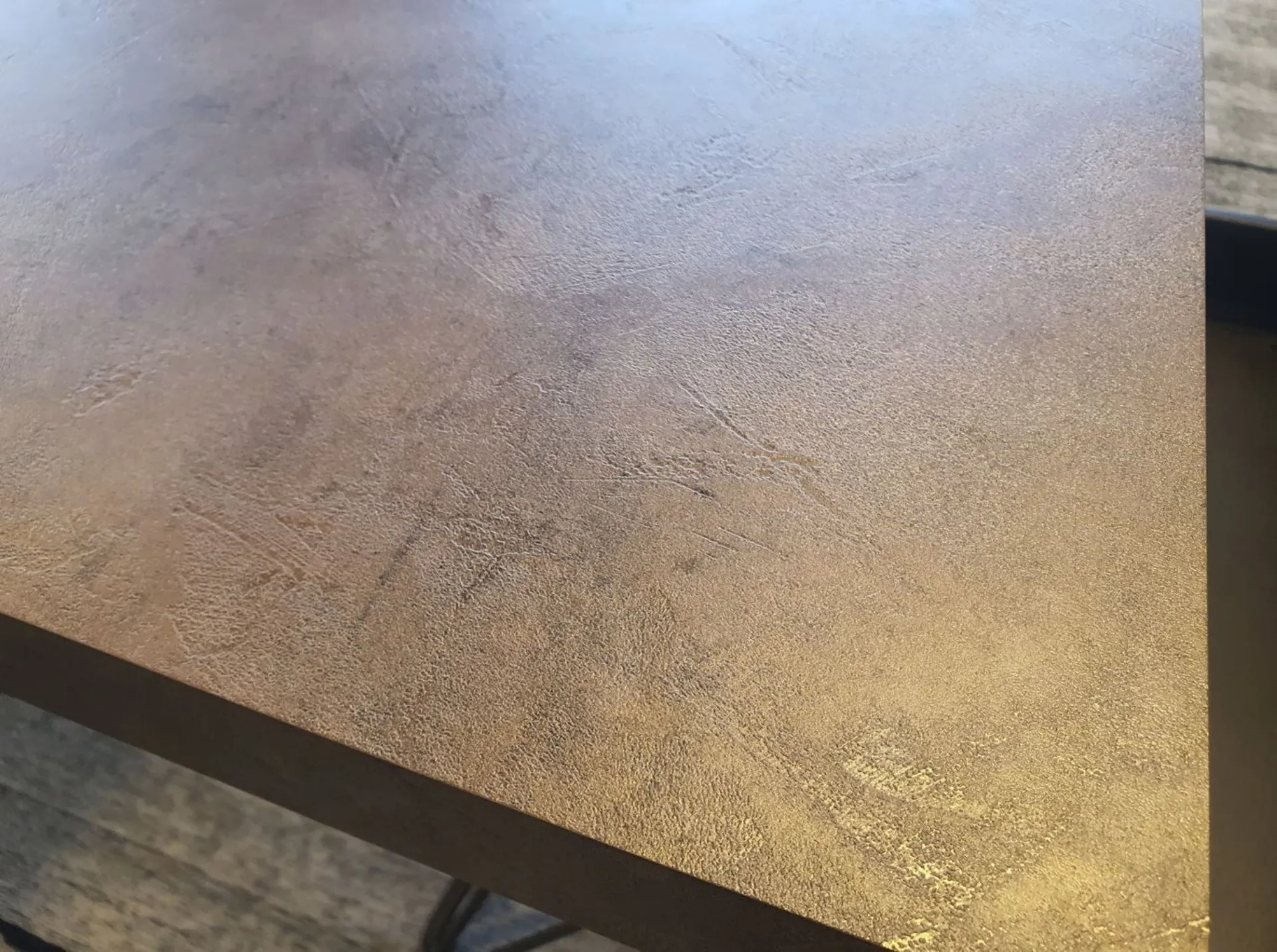 La struttura e le gambe sono in metallo color grafite mentre in piano è in eco-legno CORTEN, finitura che ricorda il metallo effetto ruggine.